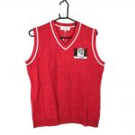 エムユースポーツ ニットベスト レッド×白 混 前面レンガ調 犬刺繍