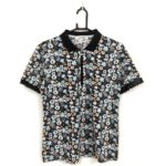 MUスポーツ 半袖シャツ 黒×マルチカラー 花×犬 総柄 袖メッシュ ハーフジップ