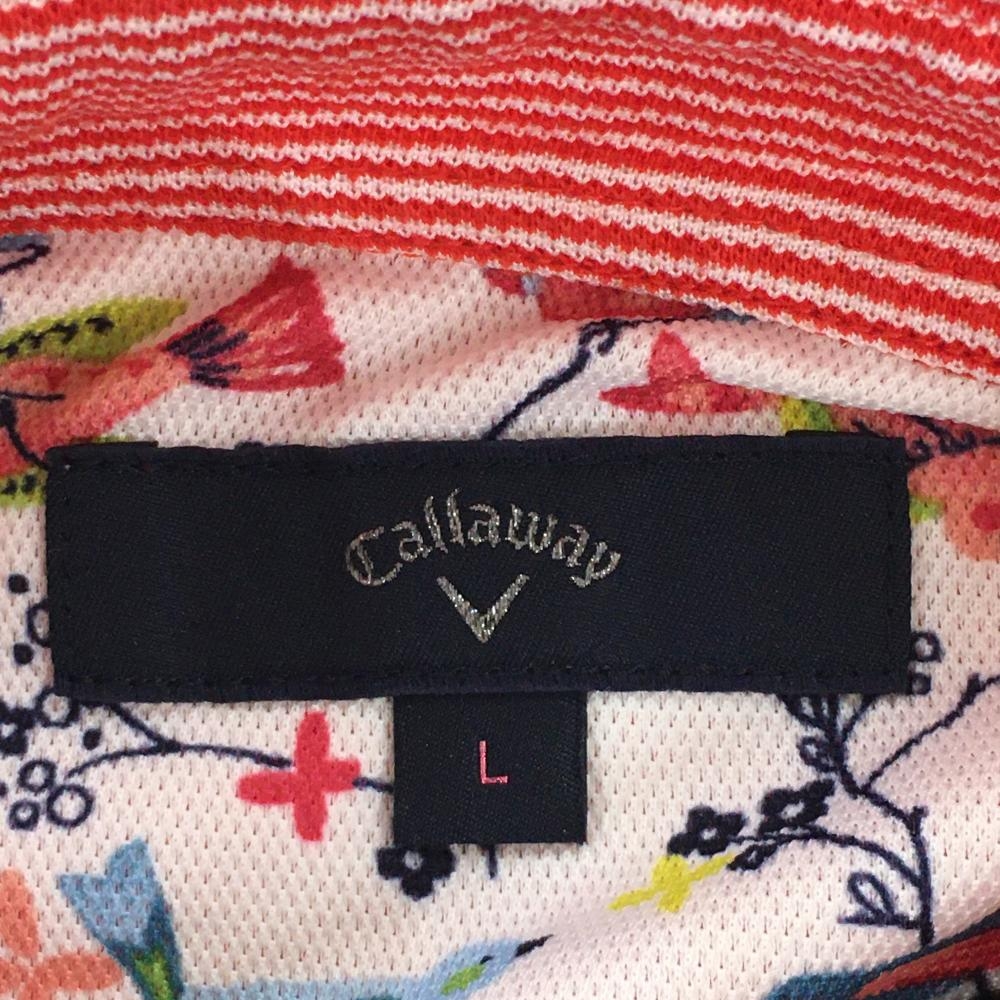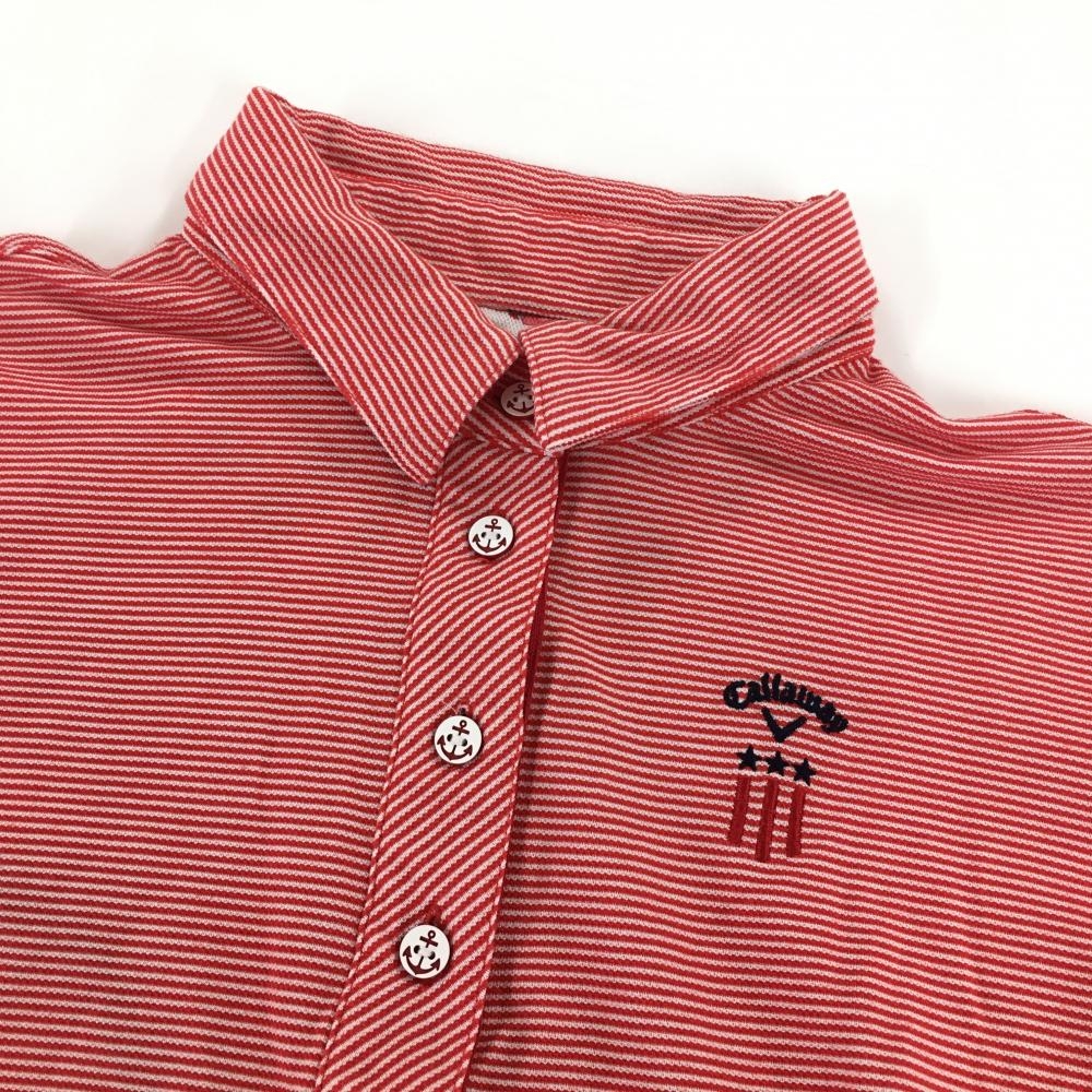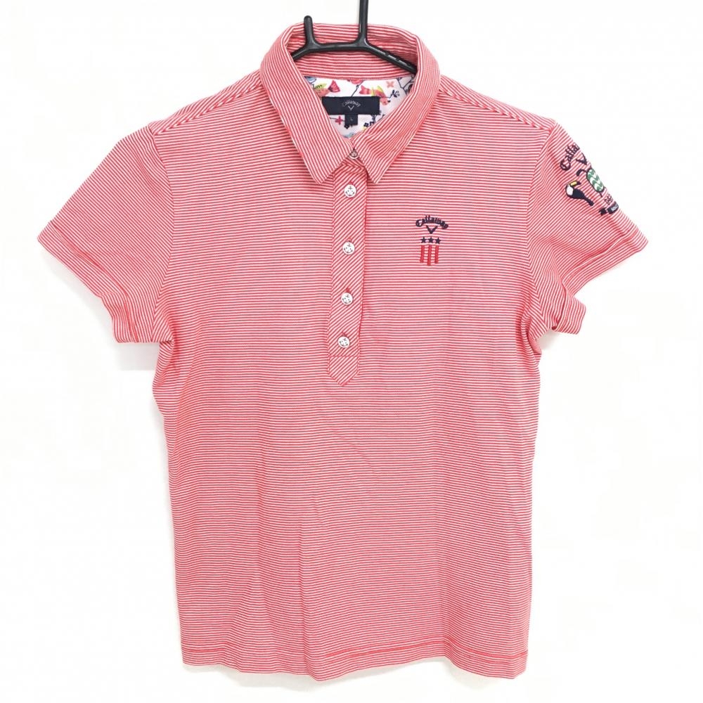 【美品】キャロウェイ 半袖ポロシャツ レッド×白 ボーダー 内側一部鳥柄 袖ロゴ レディース L ゴルフウェア Callaway