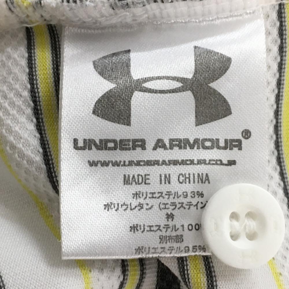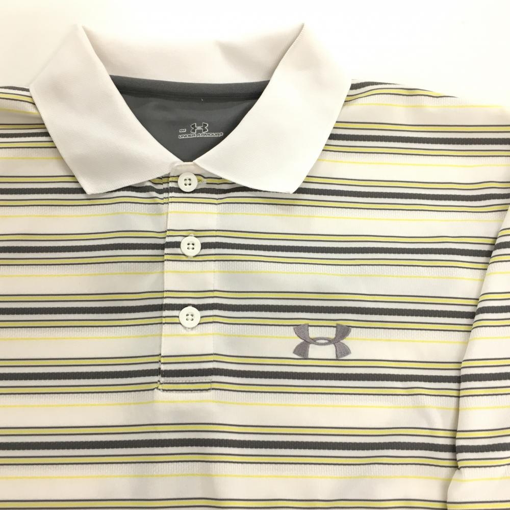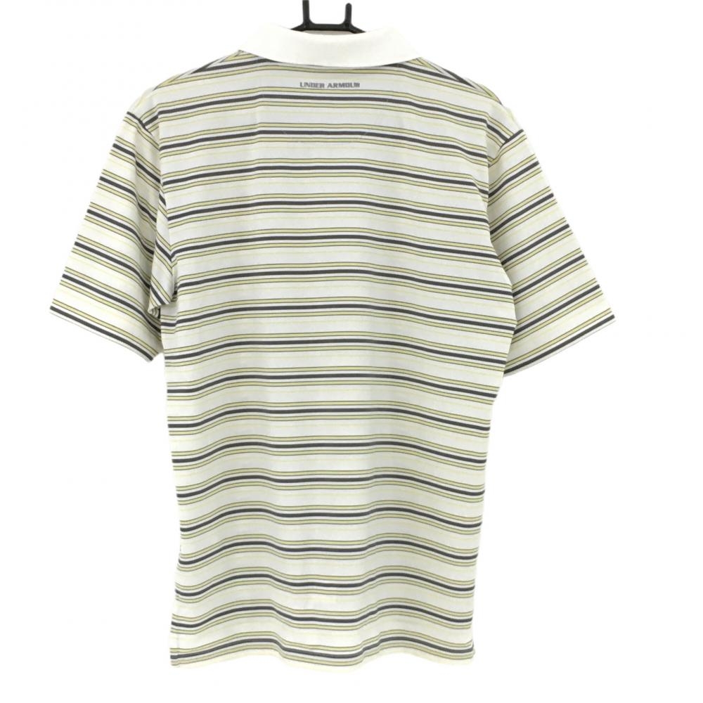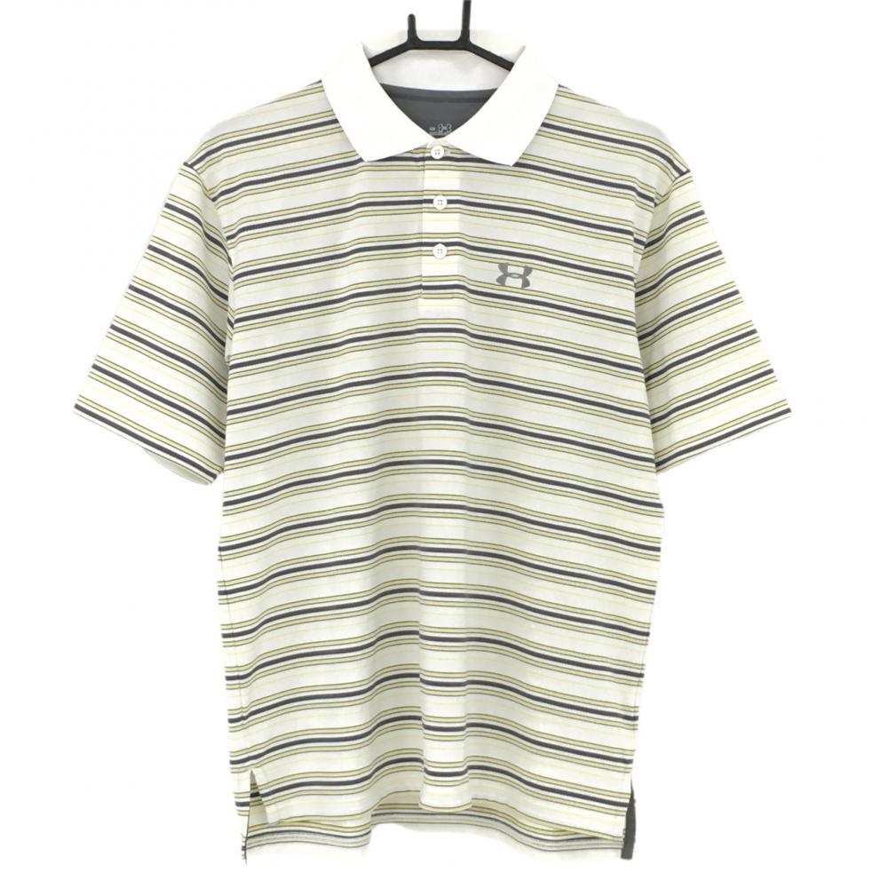 【美品】アンダーアーマー 半袖ポロシャツ 白×グレー×イエロー ボーダー 胸刺しゅう メンズ SM ゴルフウェア UNDER ARMOUR
