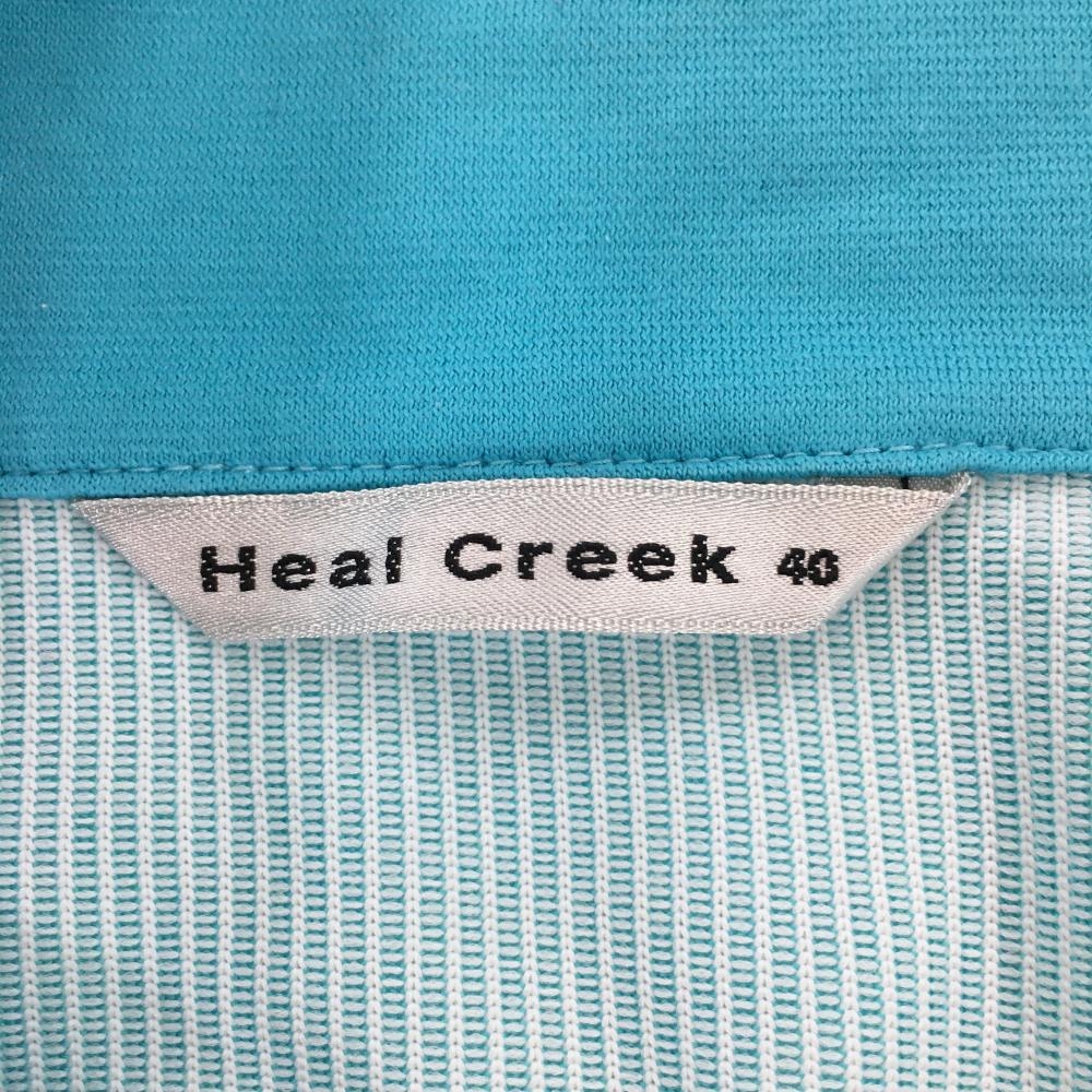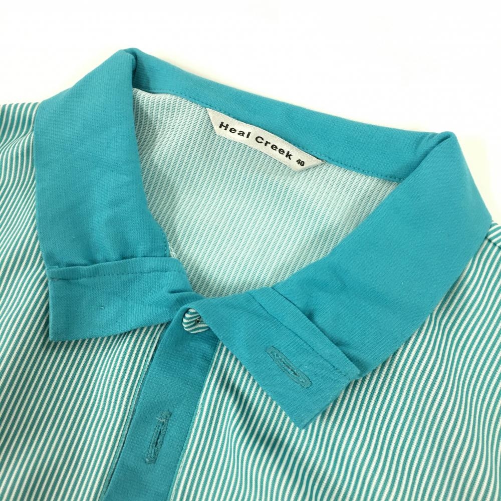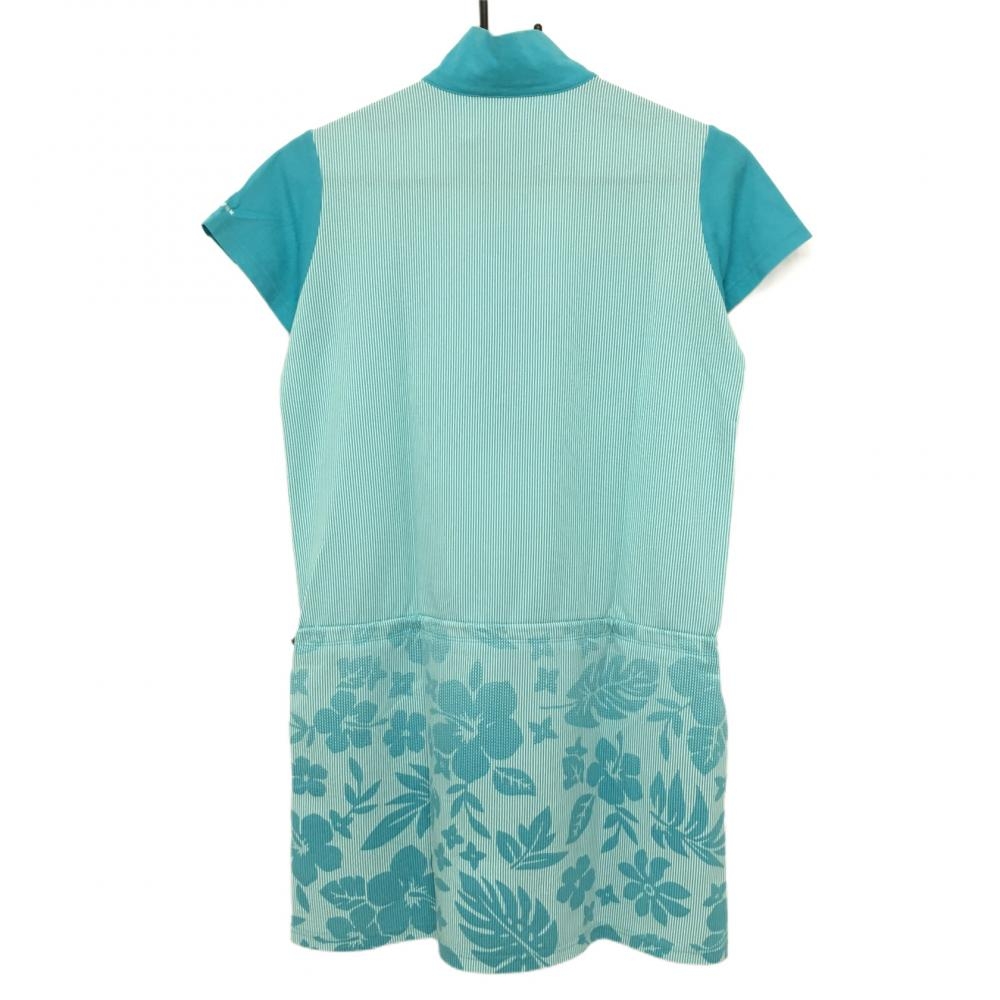 【美品】ヒールクリーク ハイネックワンピース ライトブルー×白 ストライプ 花柄 ボタン レディース 40(M) ゴルフウェア Heal Creek