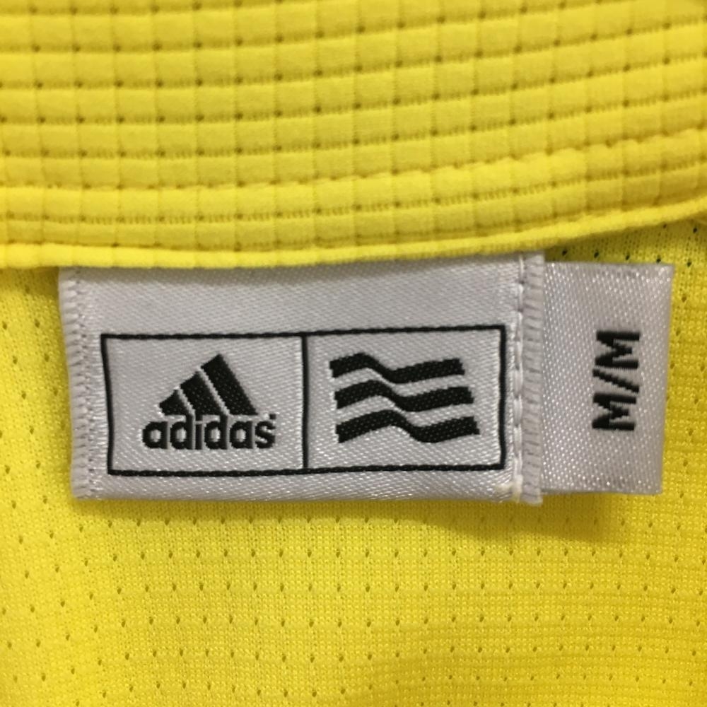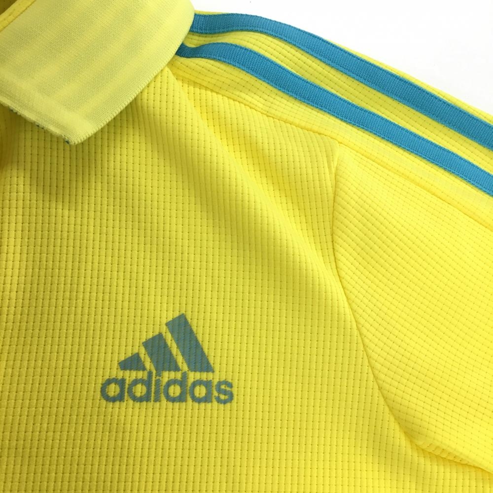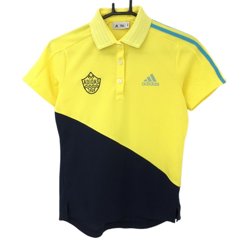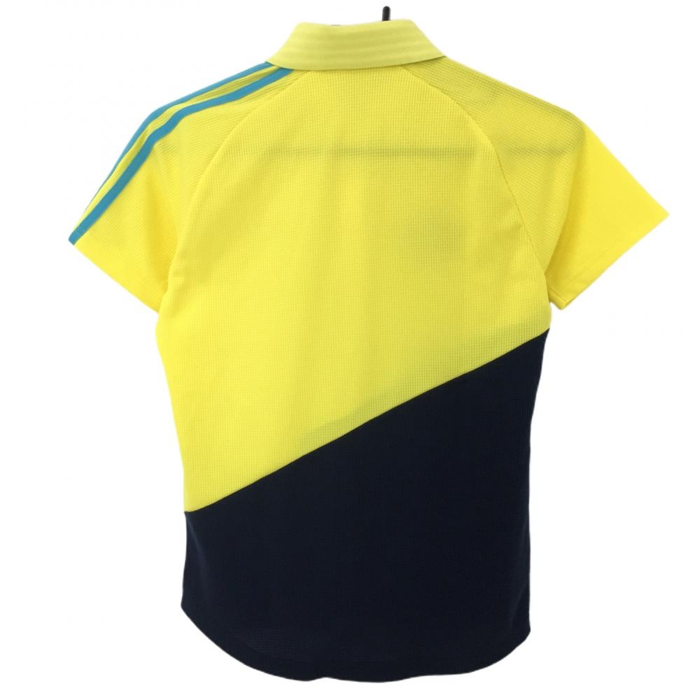 【美品】アディダス 半袖ポロシャツ イエロー×ネイビー 織生地 ロゴ刺しゅう 肩・袖3ライン レディース M/M ゴルフウェア adidas