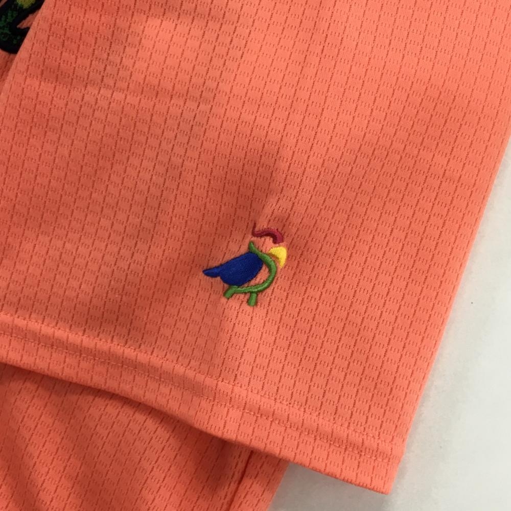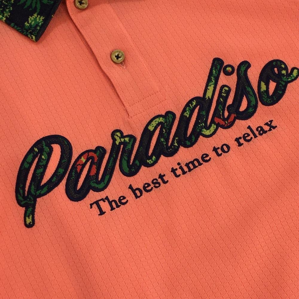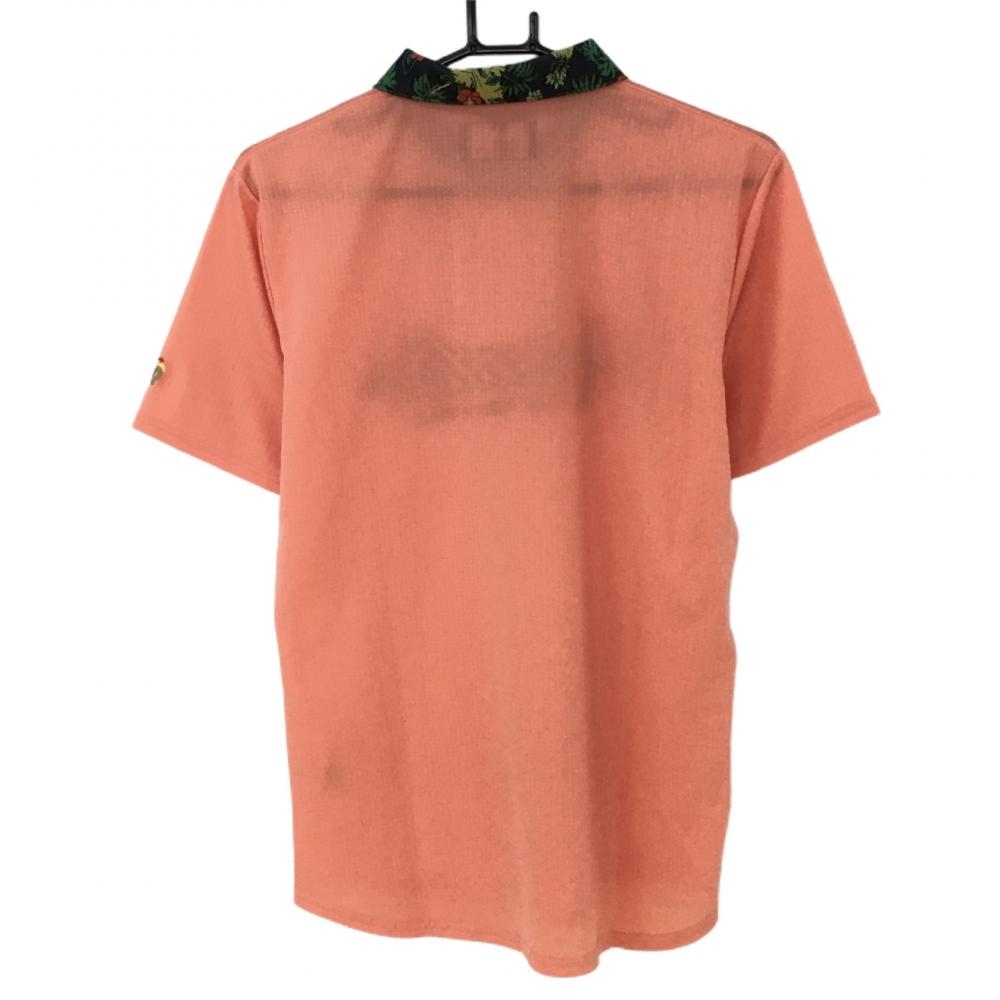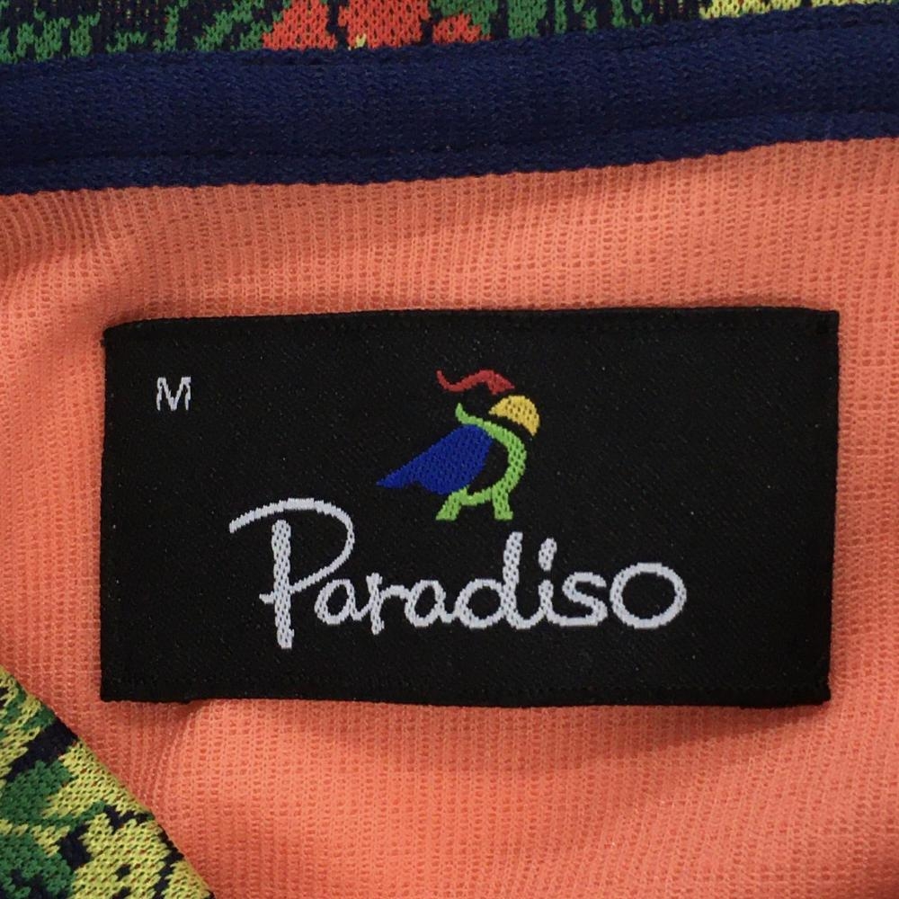 【超美品】パラディーゾ 半袖ポロシャツ サーモンピンク×ネイビー 織生地 襟ボタニカル柄 メンズ M ゴルフウェア Paradiso