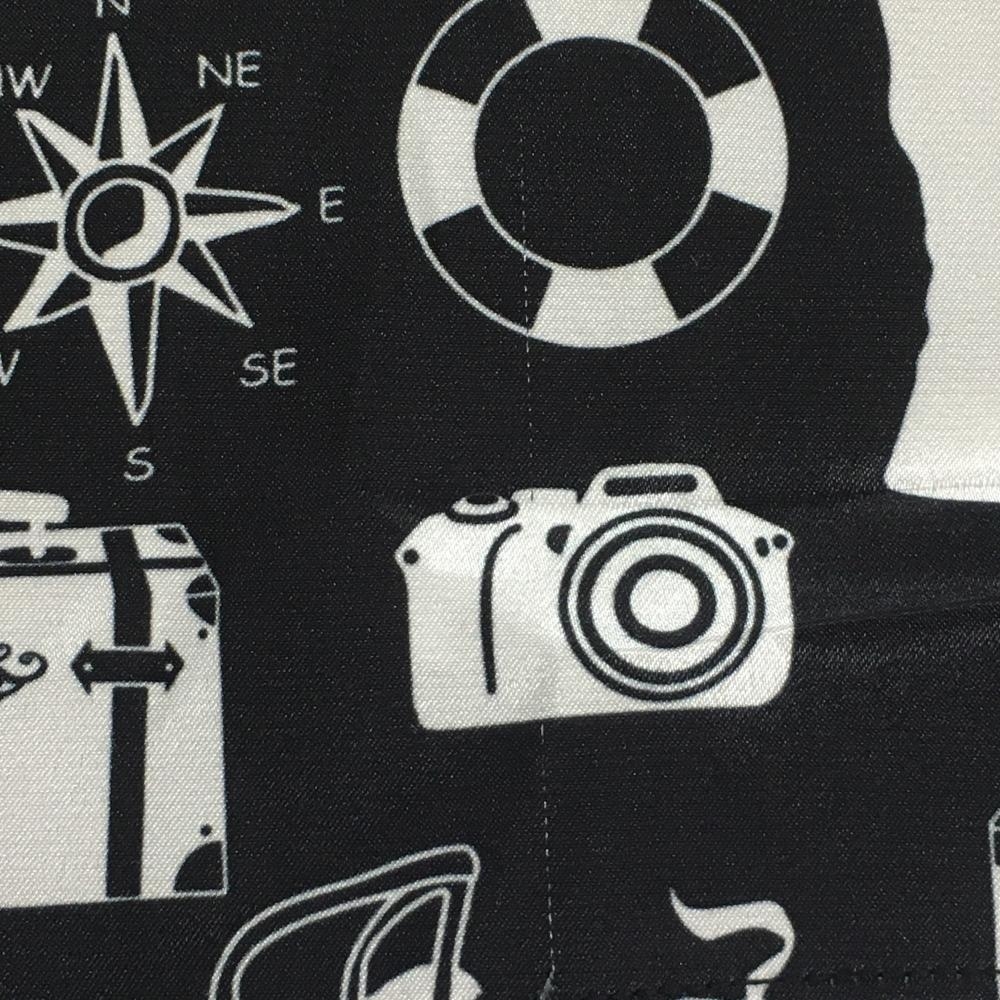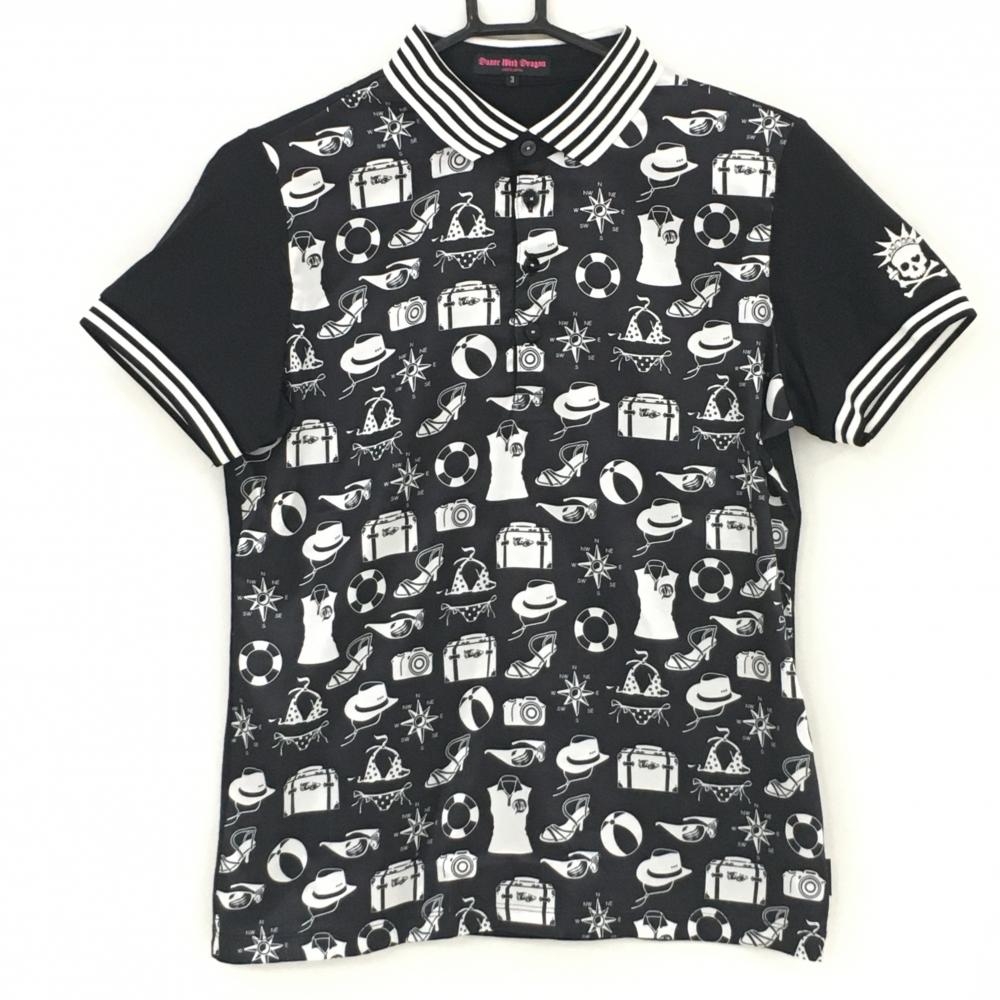 【美品】ダンスウィズドラゴン 半袖ポロシャツ 黒×白 前面総柄 スカル ラインストーン レディース 3(L) ゴルフウェア Dance With Dragon