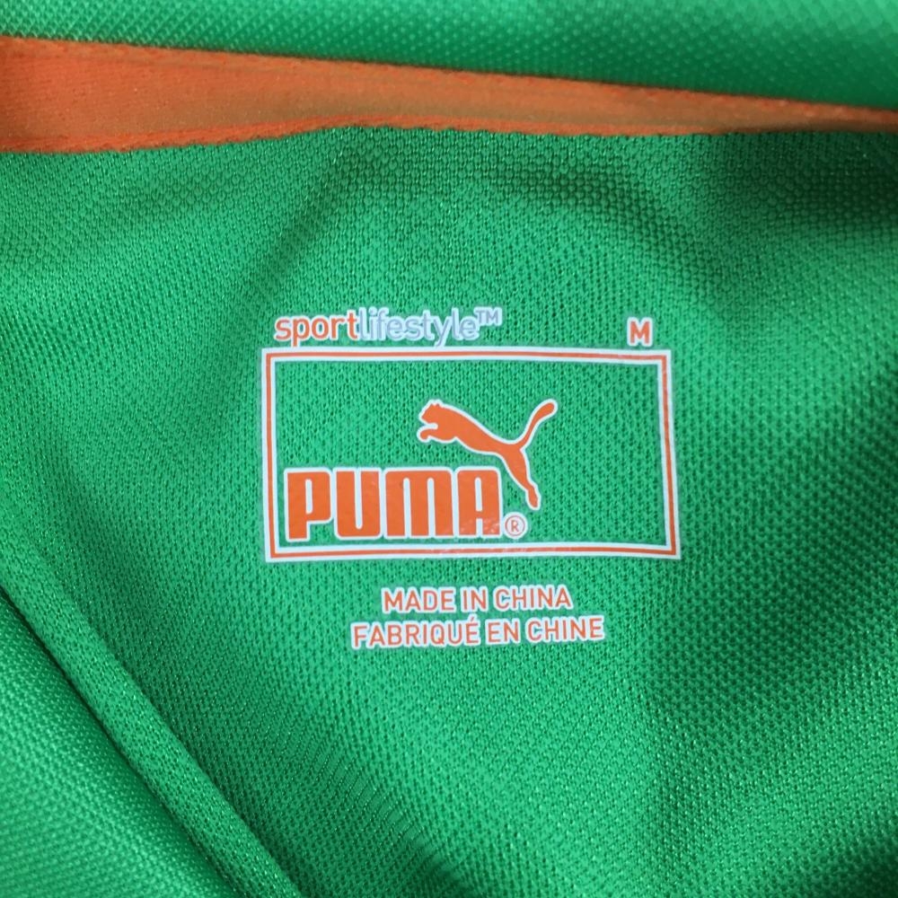 【新品】プーマ 半袖ハイネックシャツ グリーン×マルチ 前ボーダー 後ろアーガイル織生地 ハーフジップ レディース M ゴルフウェア PUMA