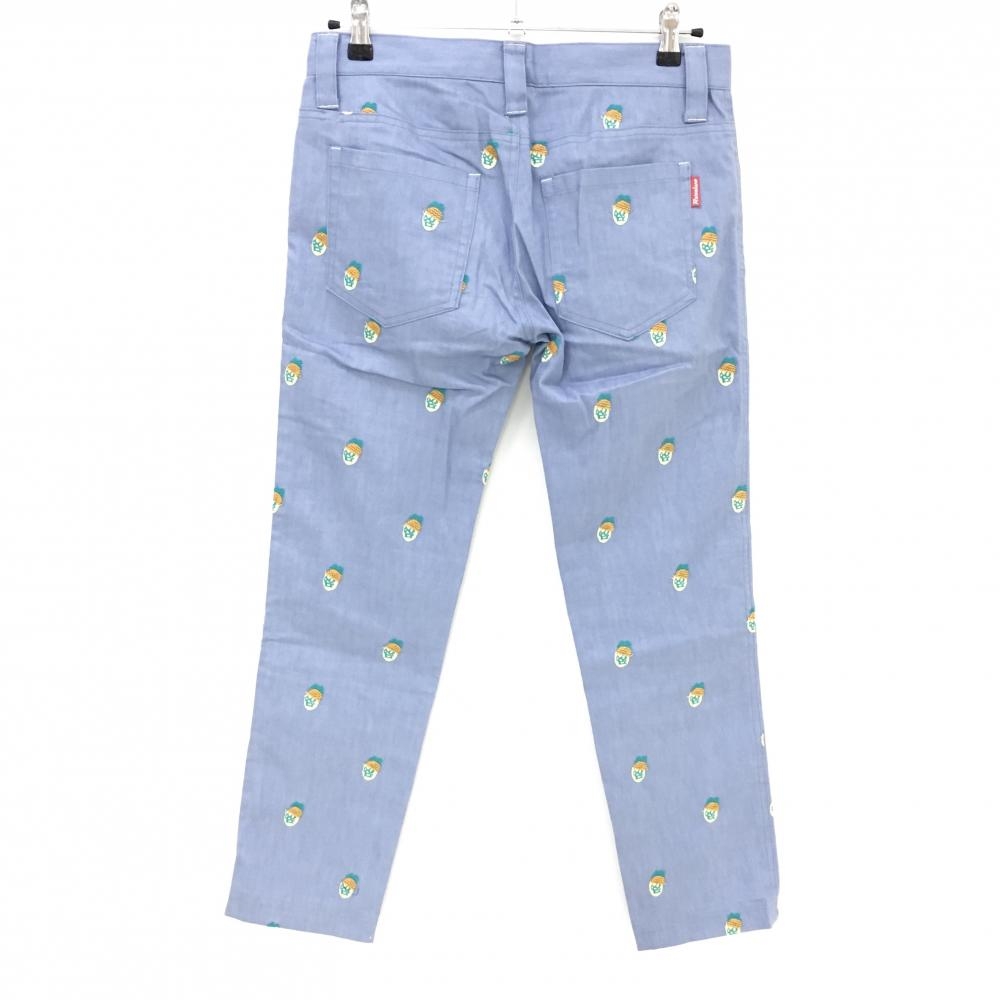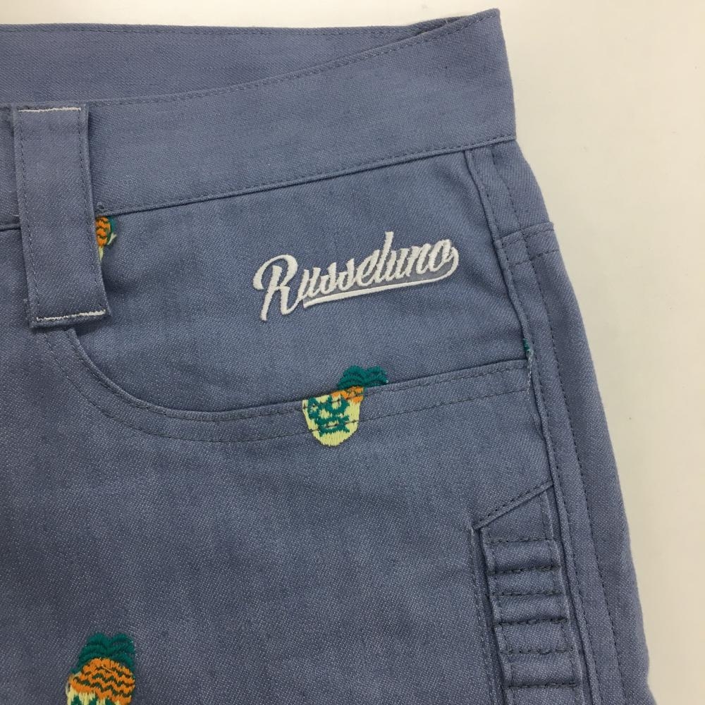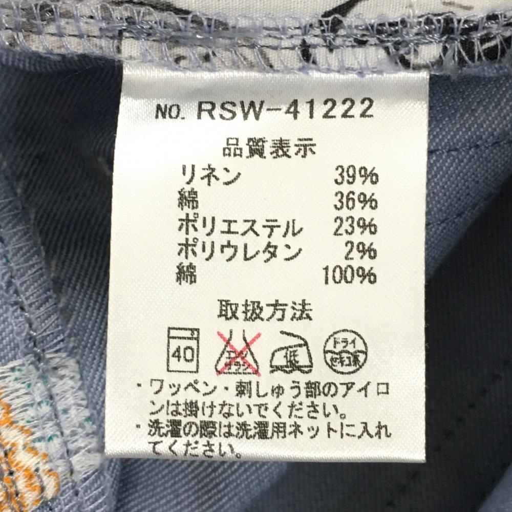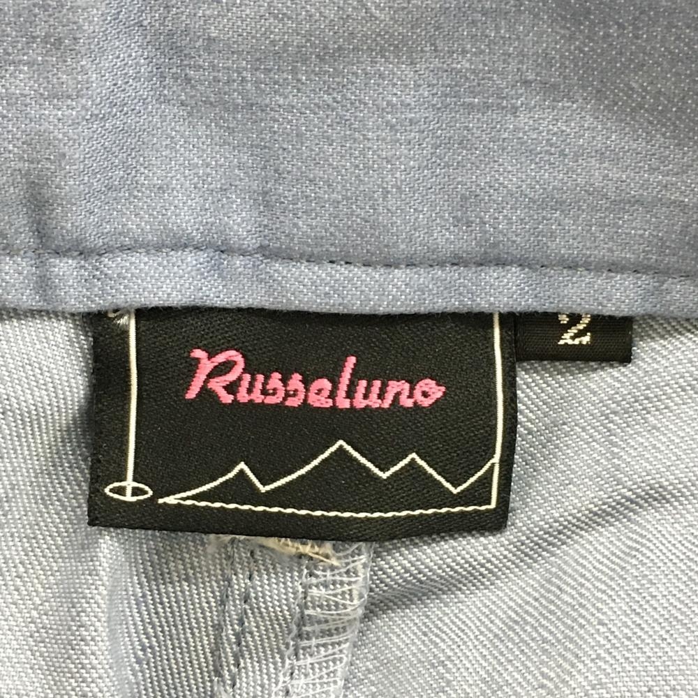 【美品】ラッセルノ パンツ ライトブルー系×イエロー ルチャ総柄刺しゅう ティー装着可 レディース 2(L) ゴルフウェア RUSSELUNO