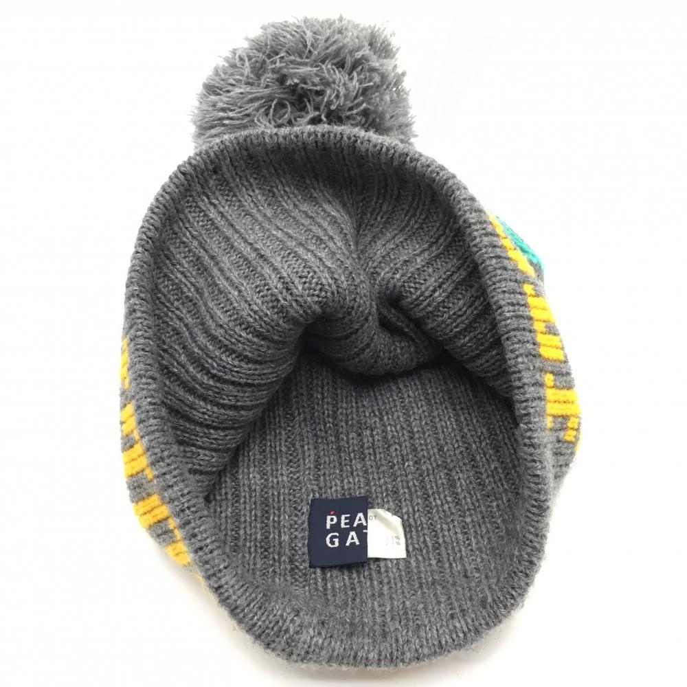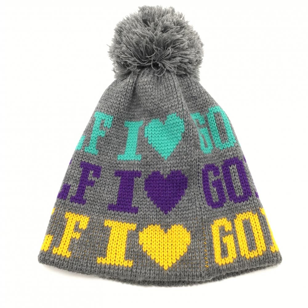 【超美品】パーリーゲイツ ニット帽 グレー×マルチ ボンボン付 ハート レディース FR ゴルフウェア PEARLY GATES