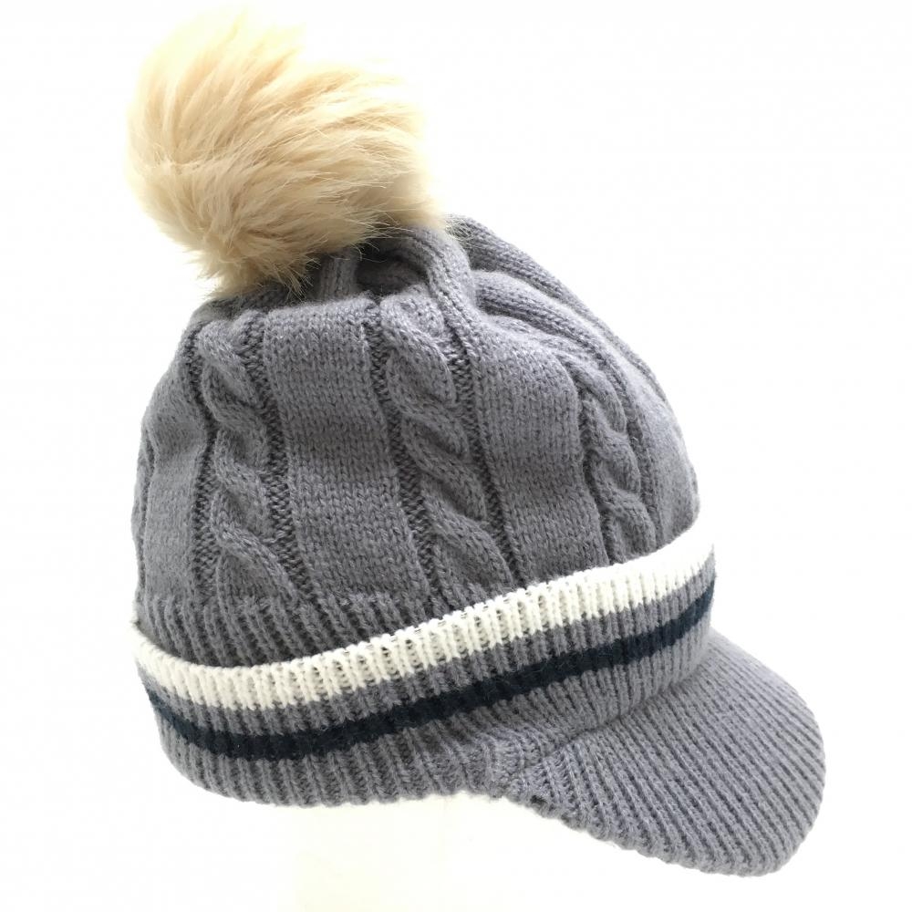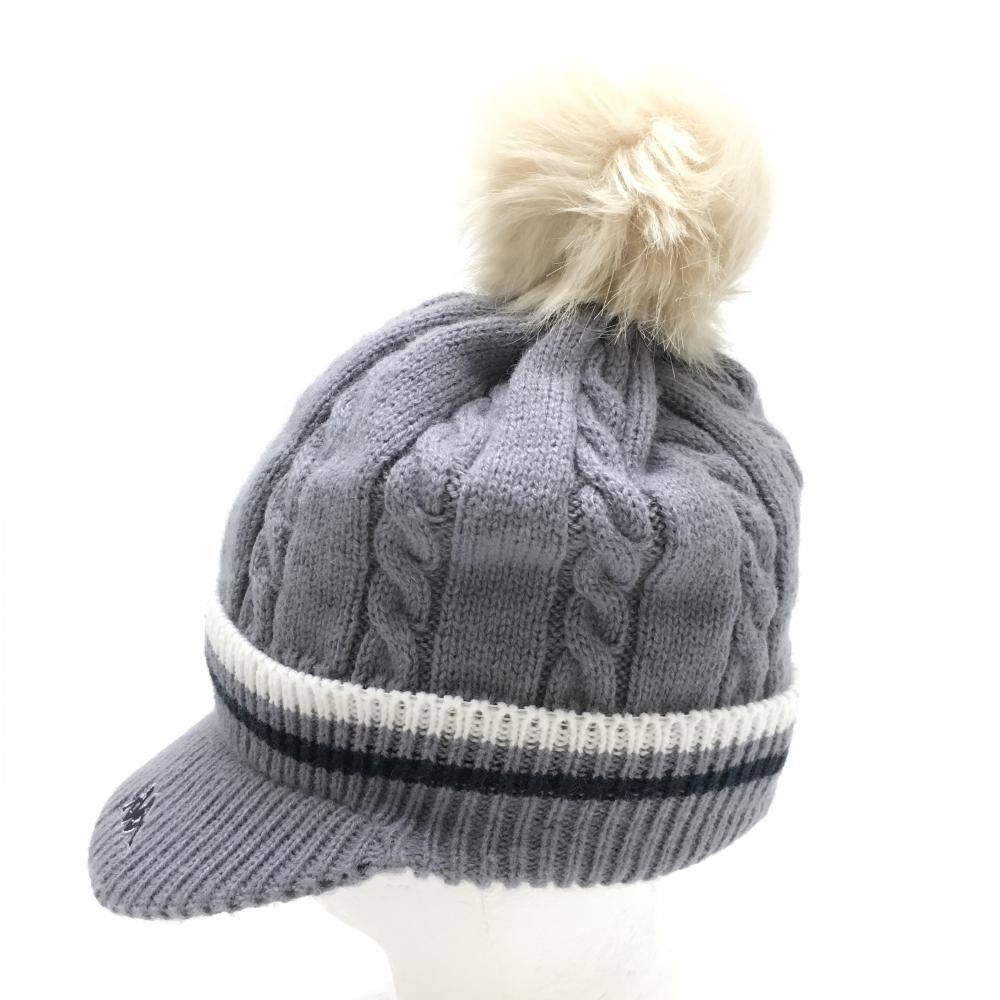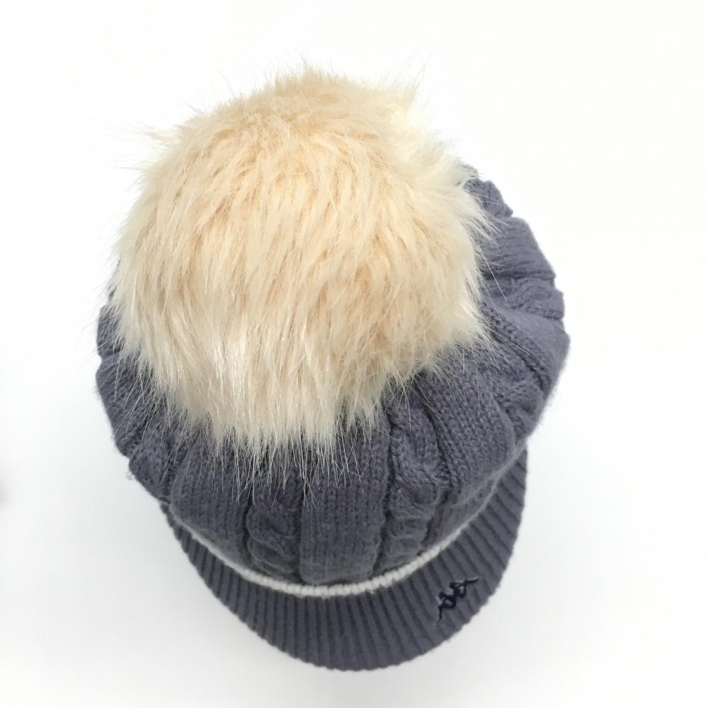 【美品】カッパ つば付きニット帽 グレー×ネイビー ケーブル編み ボンボン付き F ゴルフウェア Kappa
