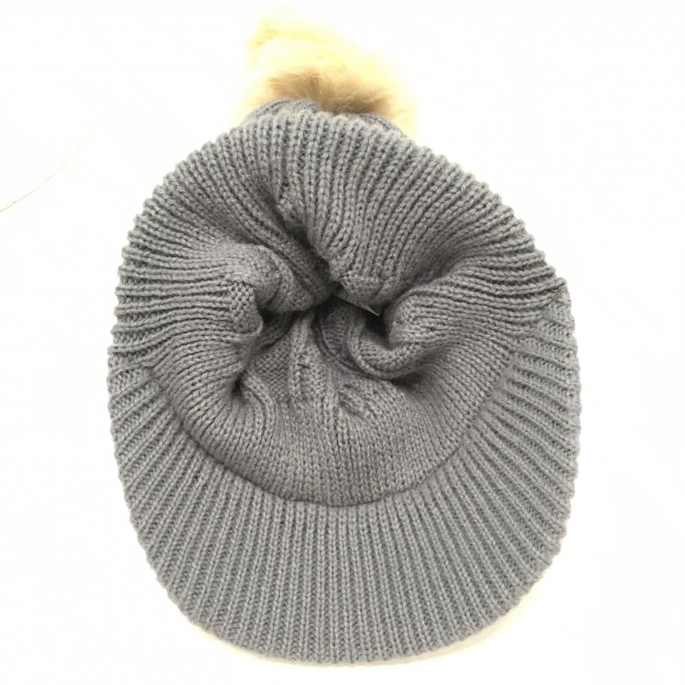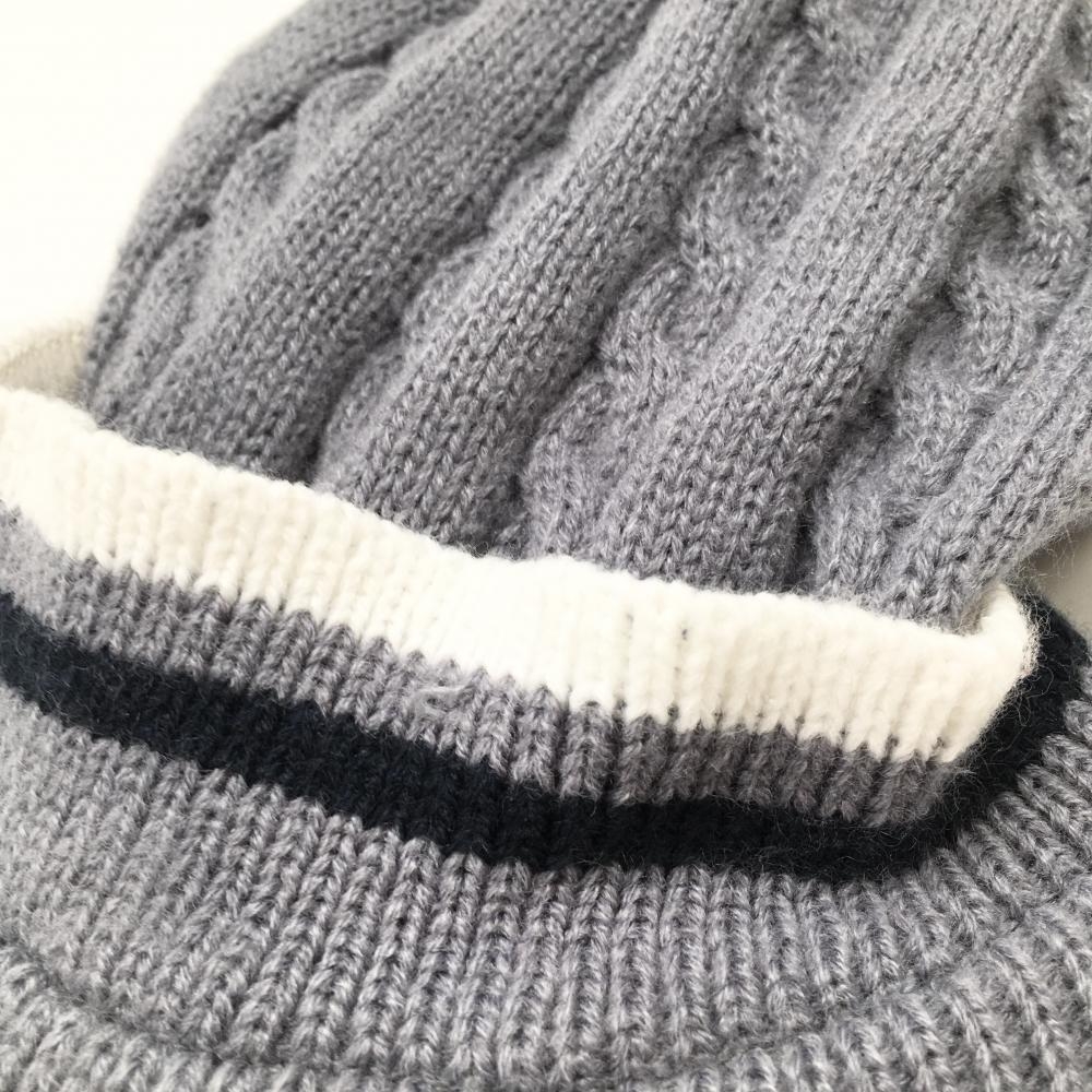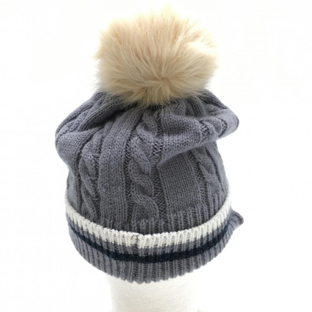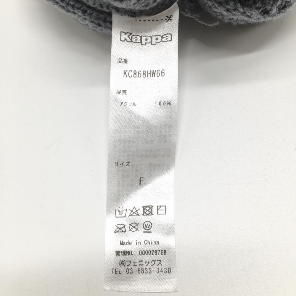 【美品】カッパ つば付きニット帽 グレー×ネイビー ケーブル編み ボンボン付き F ゴルフウェア Kappa