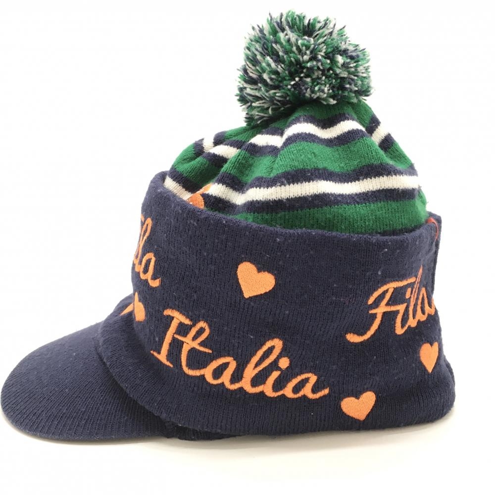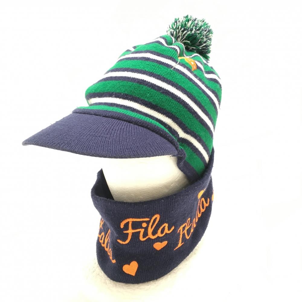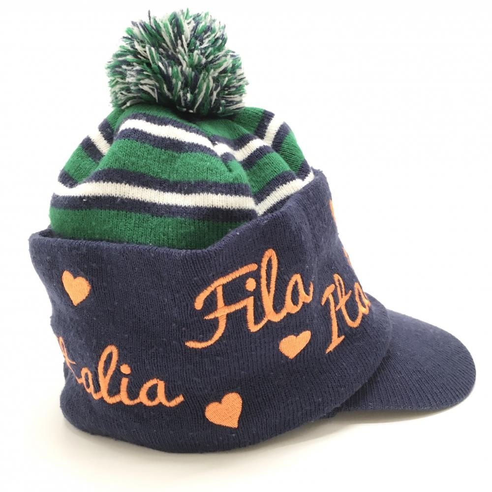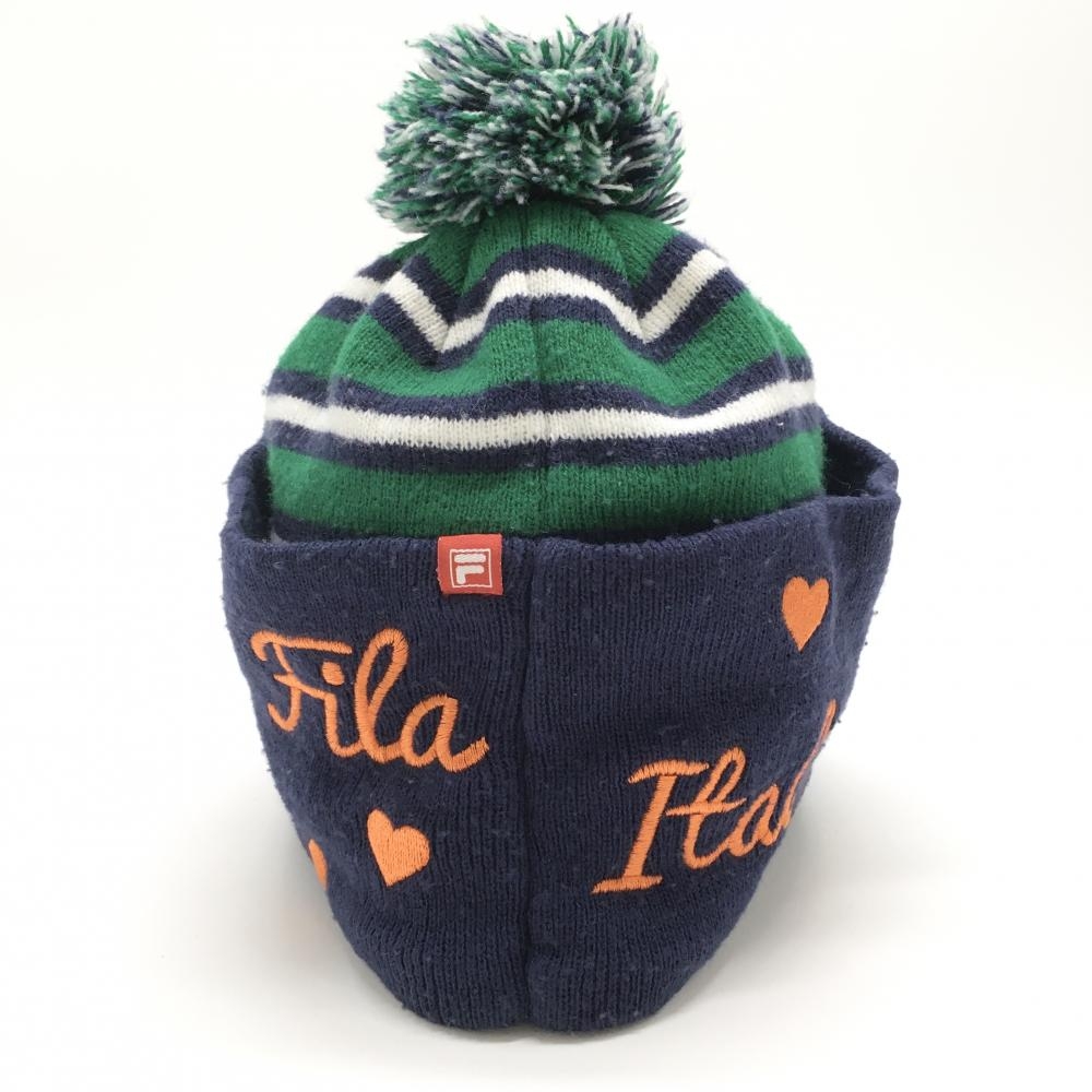 【美品】フィラゴルフ ネックウォーマー付つば付きニット帽 グリーン×ネイビー ボーダー レディース ゴルフウェア FILA GOLF