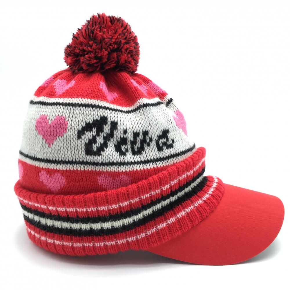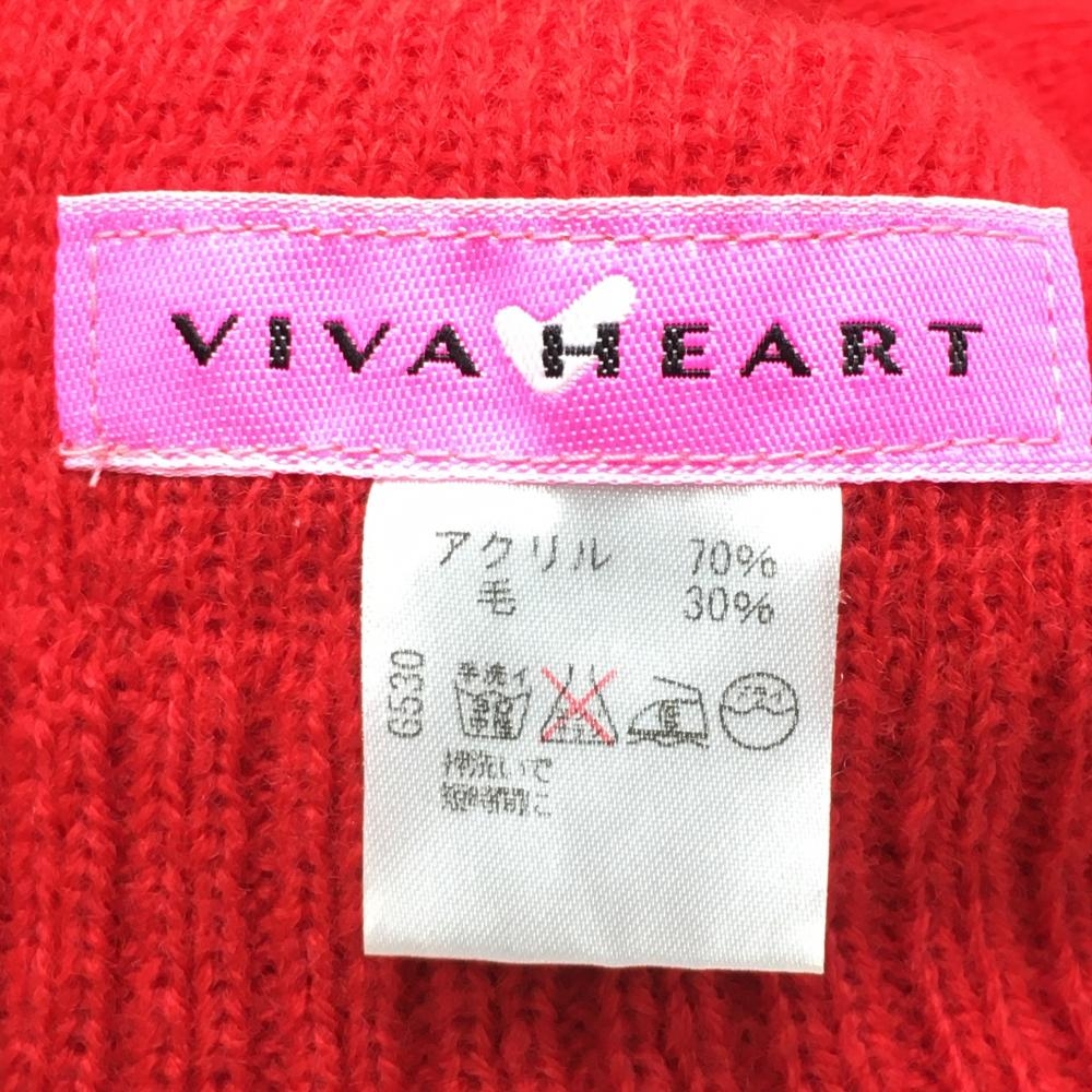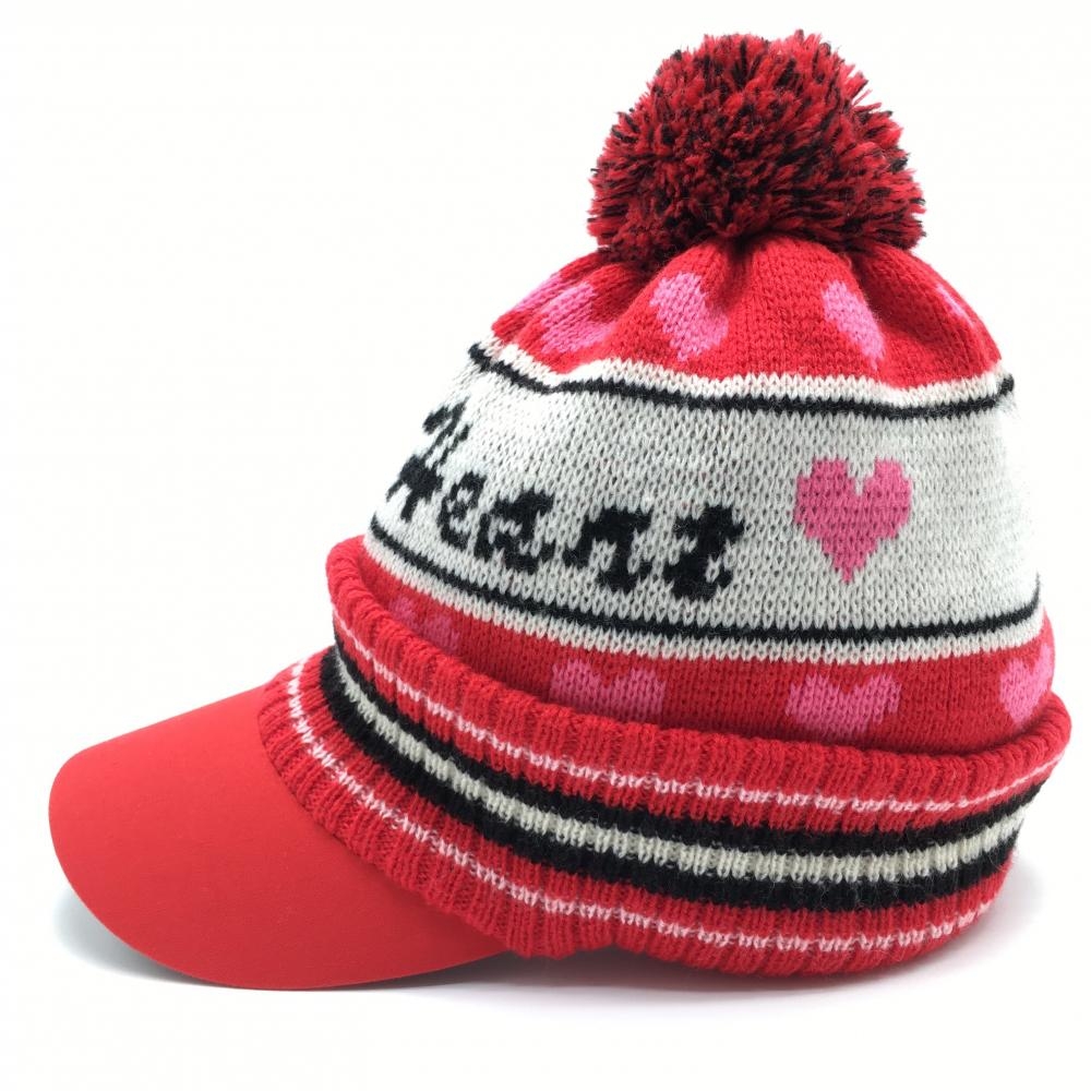 【超美品】ビバハート つば付きニット帽 レッド×白 ハート柄 ボンボン付き レディース 40 ゴルフウェア VIVA HEART