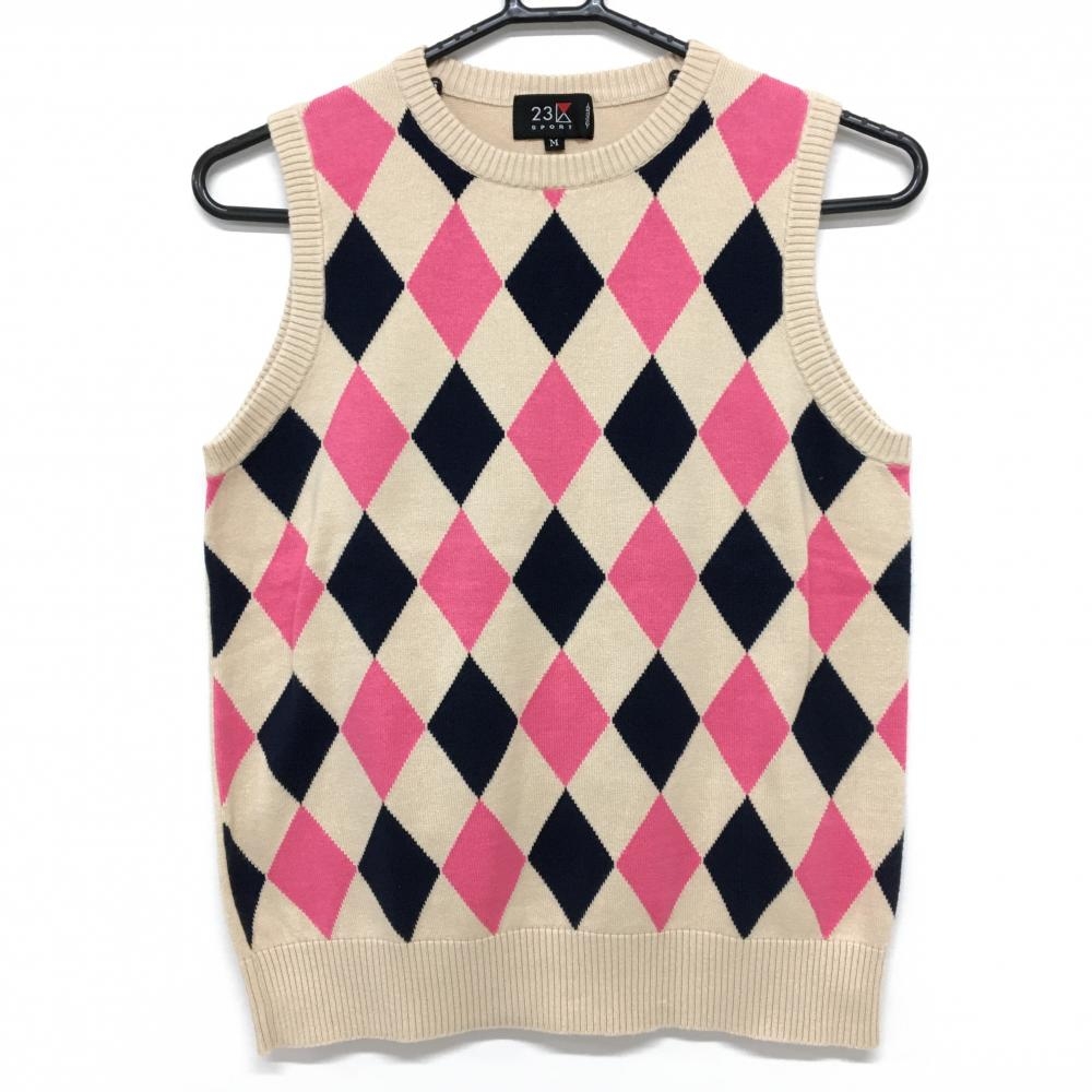 23区スポーツ ニットベスト ベージュ×ピンク ダイヤ柄 コットン100% レディース M ゴルフウェア 23区