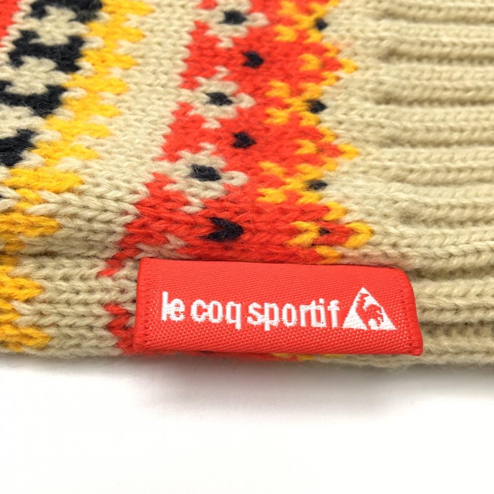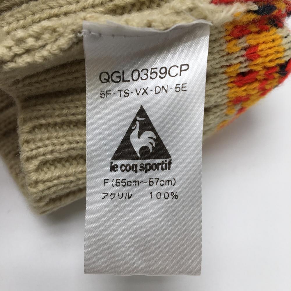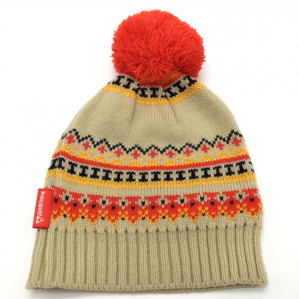 【超美品】ルコック ニット帽 ベージュ×レッド ノルディック風 ボンボン付 F(55-57cm) ゴルフウェア le coq sportif