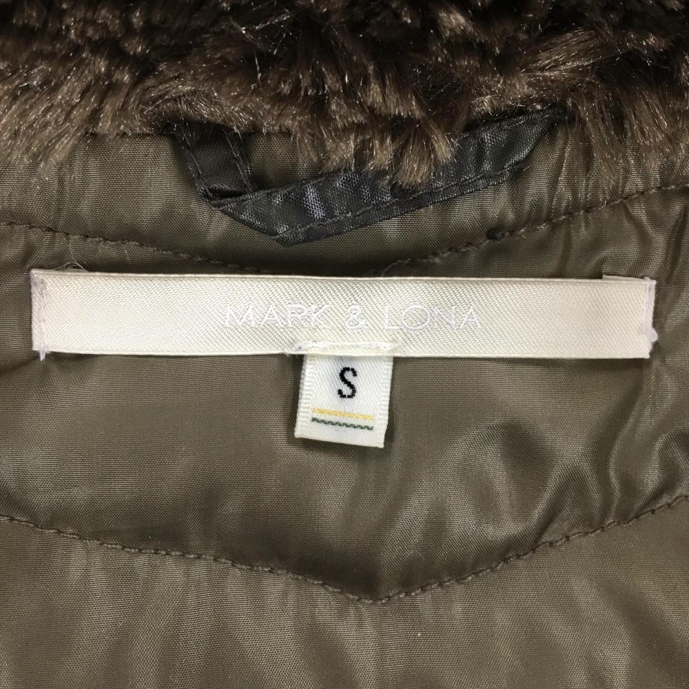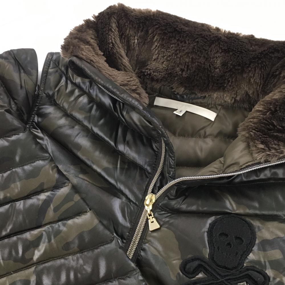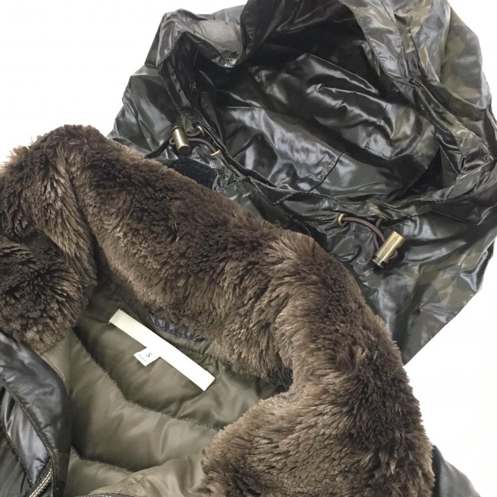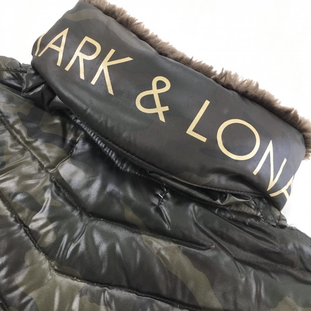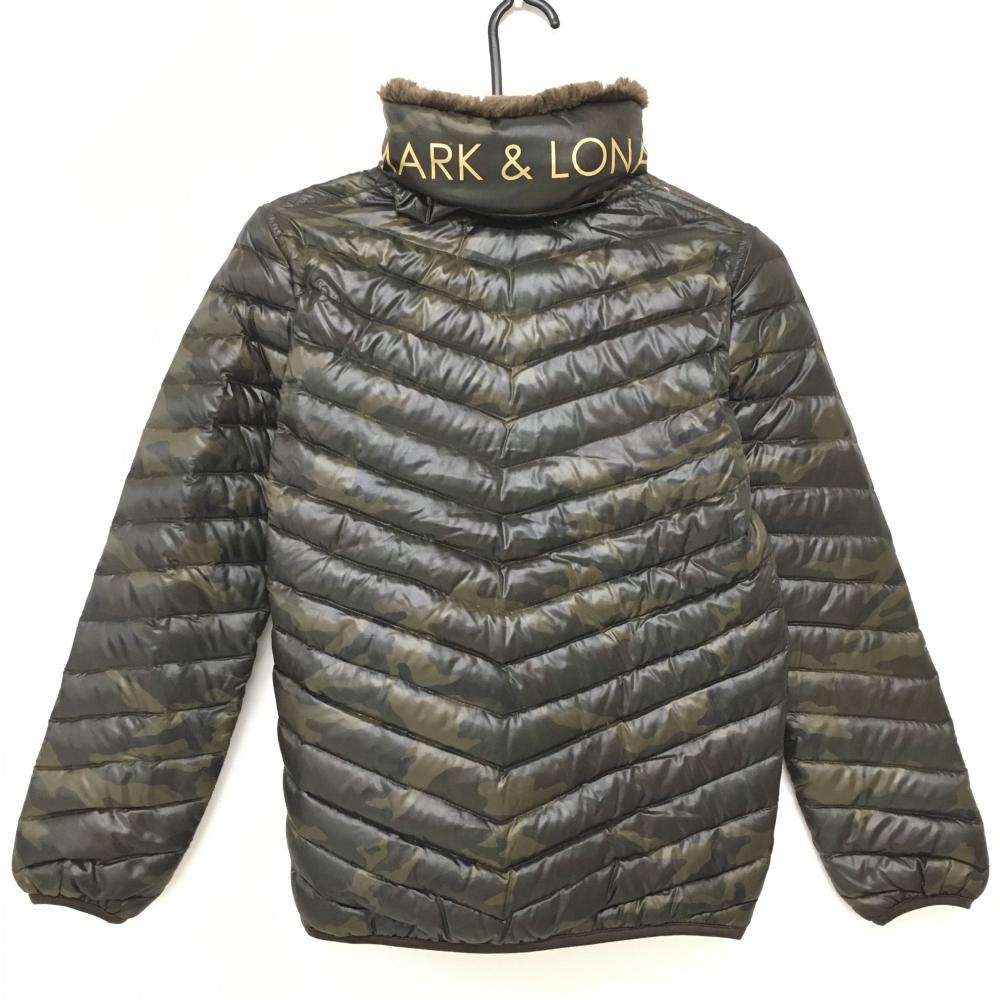 【美品】マークアンドロナ 2WAYダウンジャケット カーキ×ブラウン カモフラ 迷彩 フード収納 レディース S ゴルフウェア MARK&LONA
