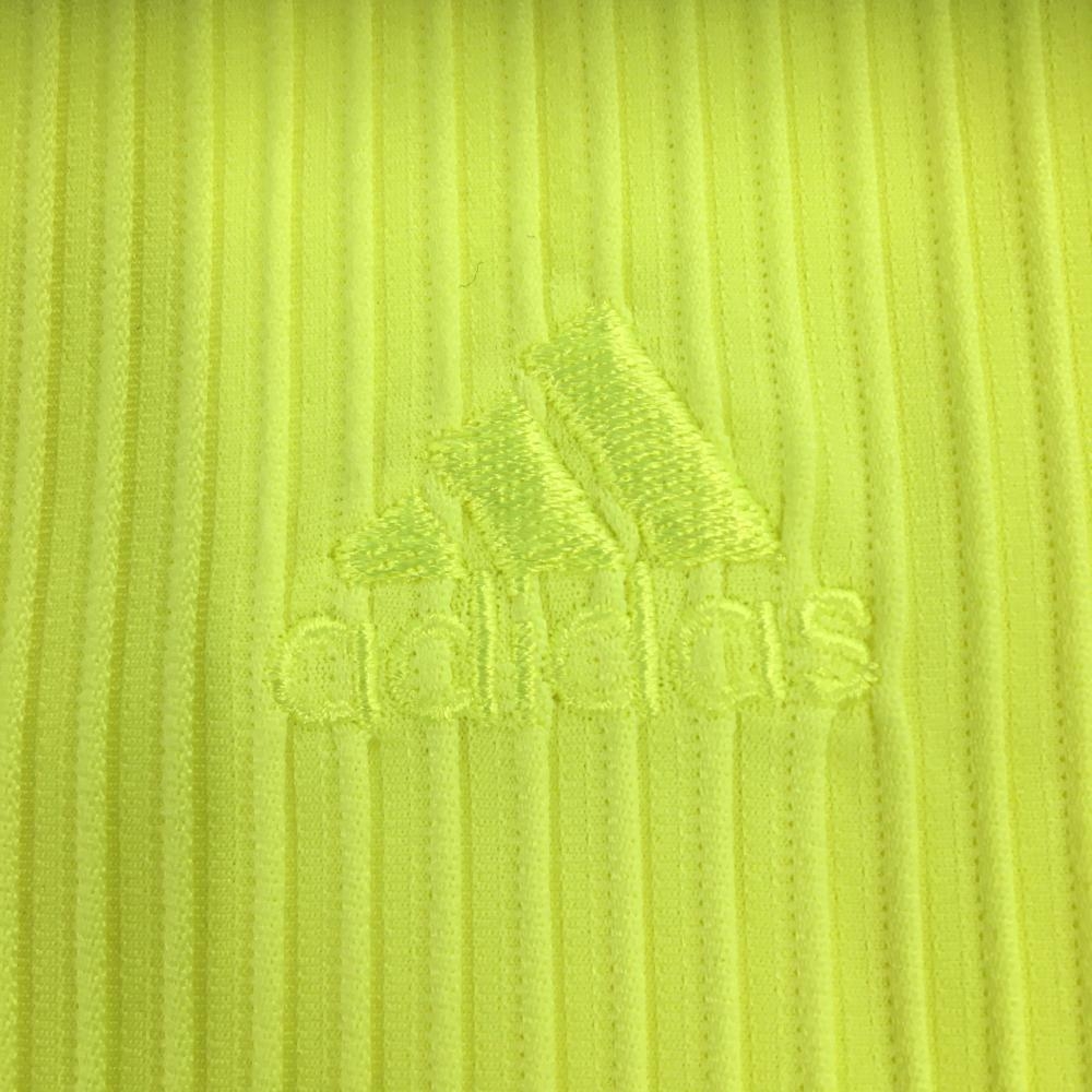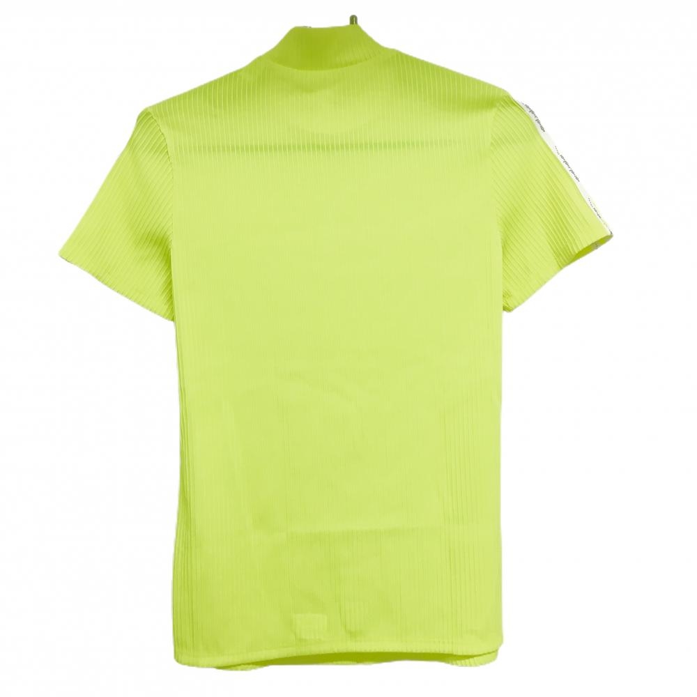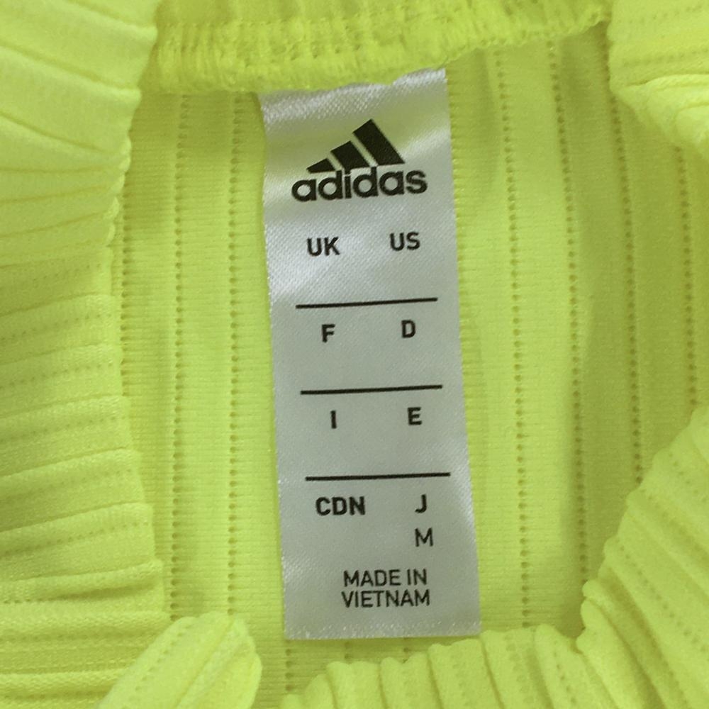 【超美品】アディダス 半袖ハイネックシャツ 蛍光イエロー×白 ストライプ織生地 レディース M ゴルフウェア adidas
