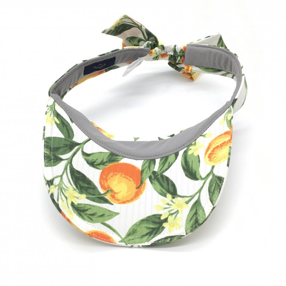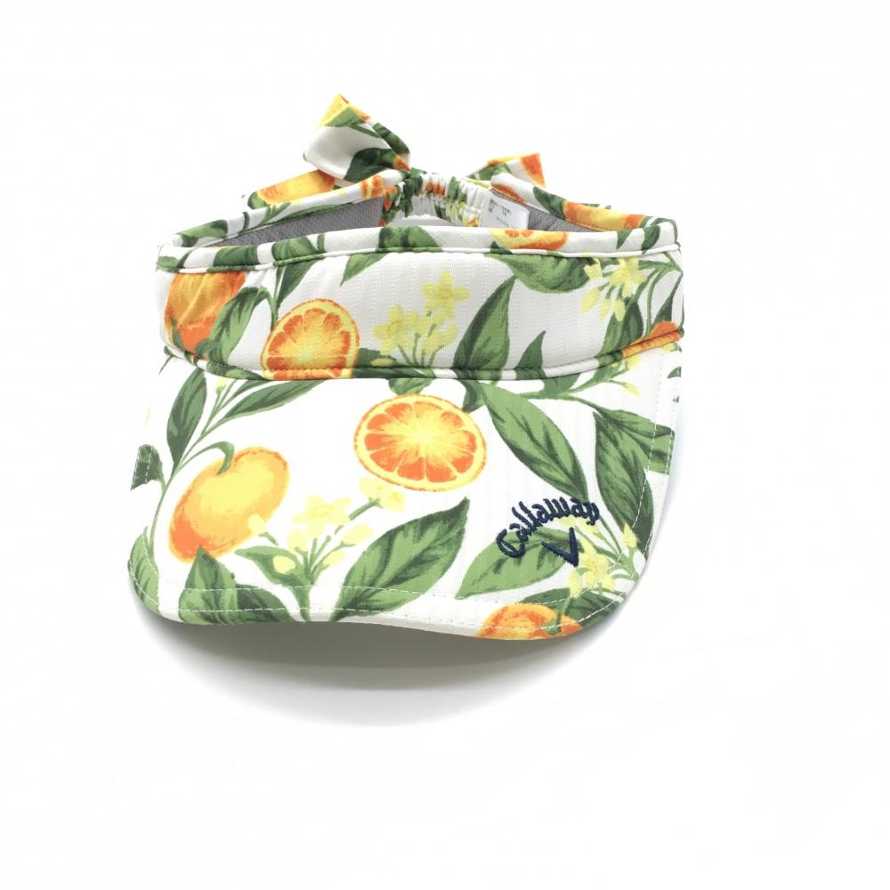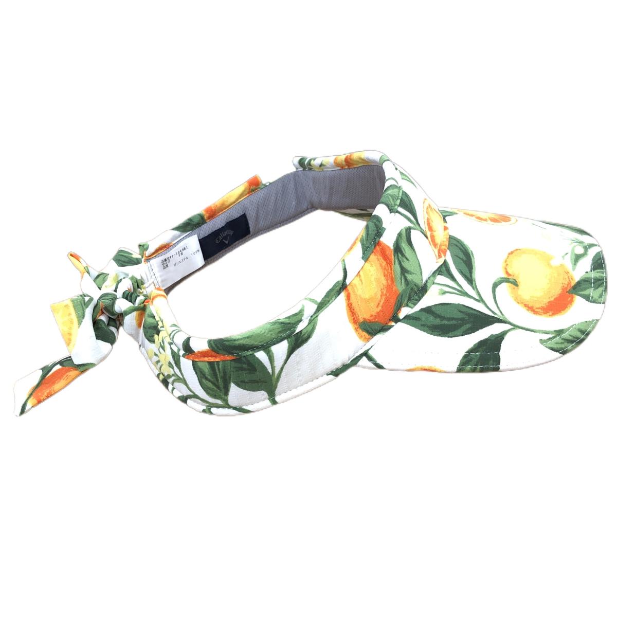 【超美品】キャロウェイ サンバイザー 白×オレンジ オレンジ柄×花柄 ストライプ織生地 後ろリボン レディース FR ゴルフウェア Callaway