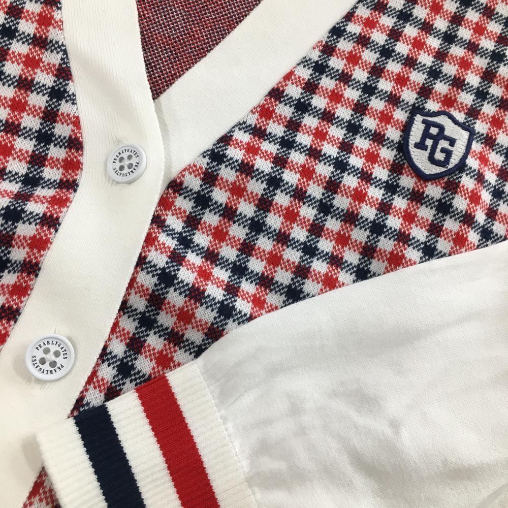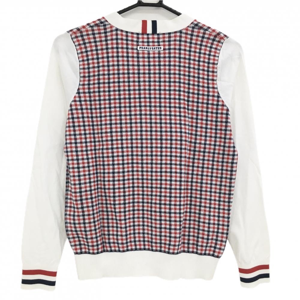 【超美品】パーリーゲイツ ニットカーディガン 白×レッド×ネイビー 身頃チェック レディース 0(S) ゴルフウェア PEARLY GATES