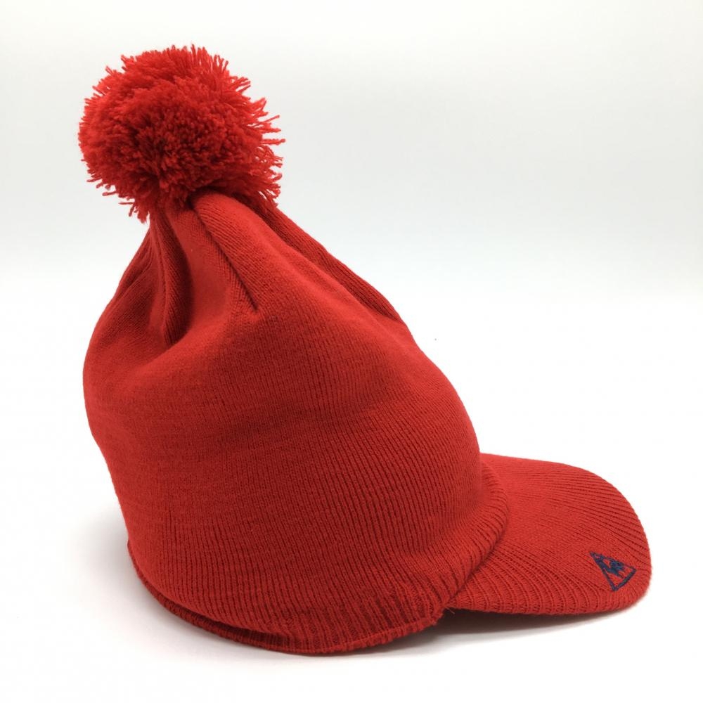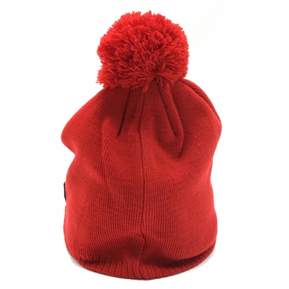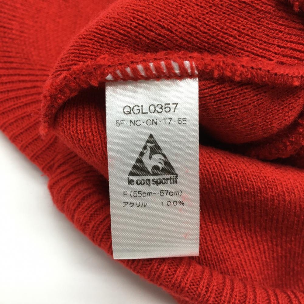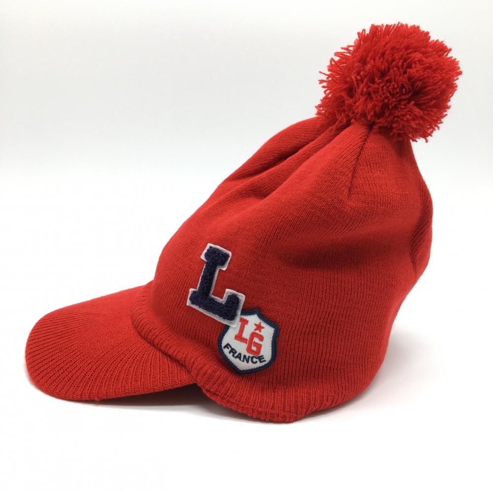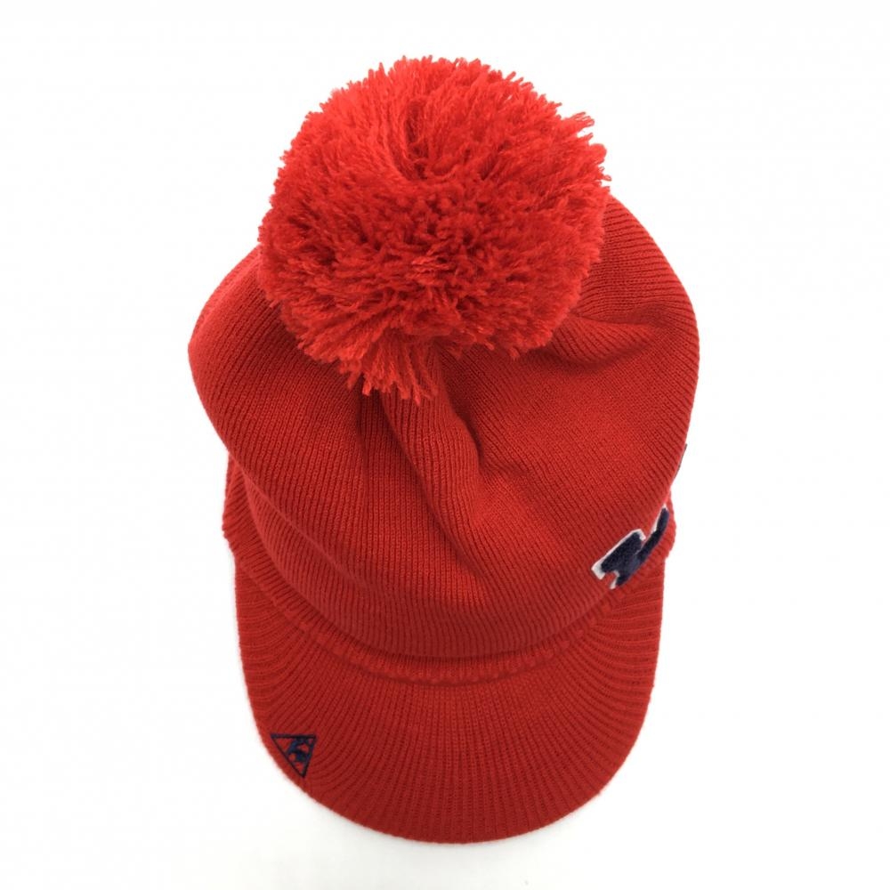 【超美品】ルコック つば付ニット帽 レッド×ネイビー アクリル100% ボンボン付 ワッペン F(55-57cm) ゴルフウェア le coq sportif