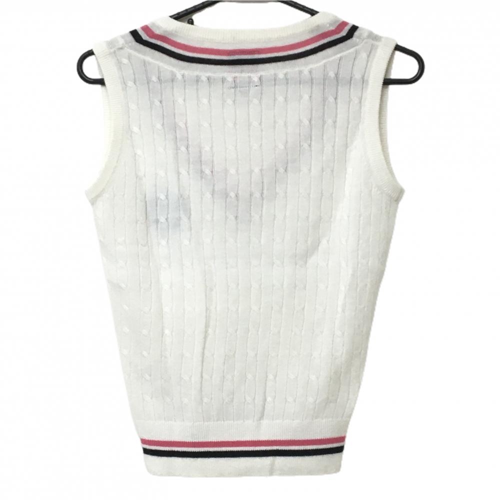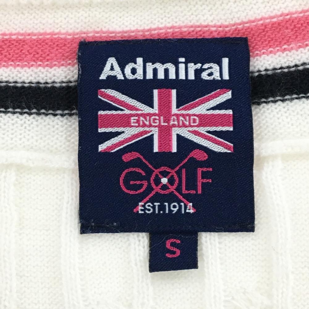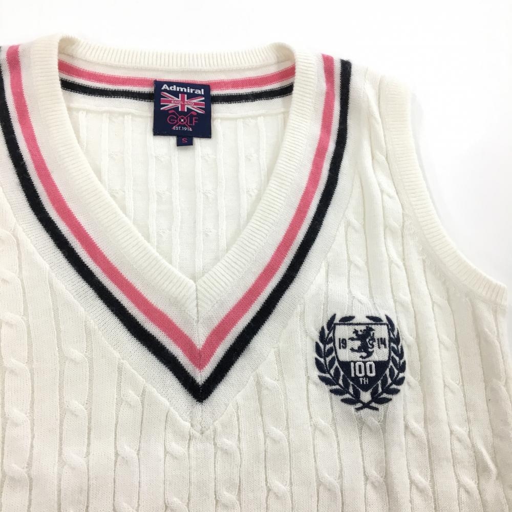 【超美品】アドミラル ニットベスト 白×ネイビー×ピンク ケーブル編み Vネック 胸元ロゴ レディース S ゴルフウェア Admiral