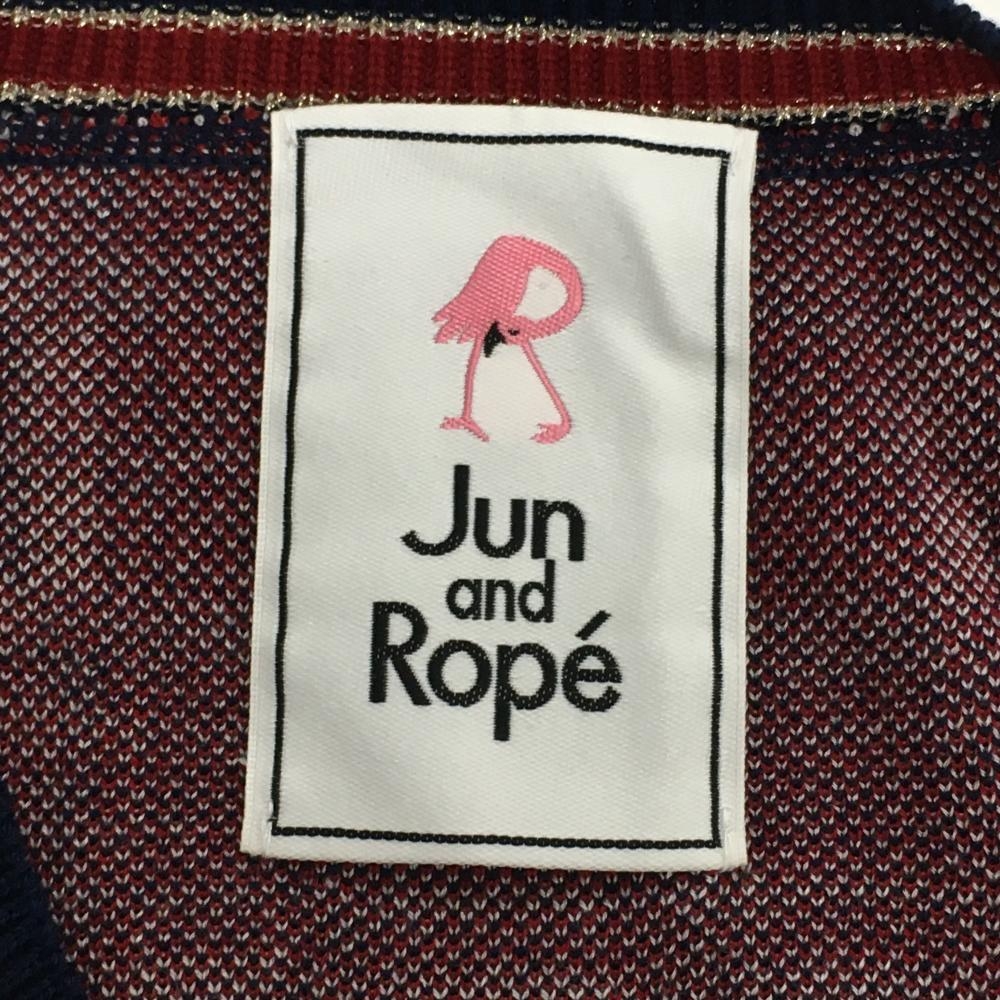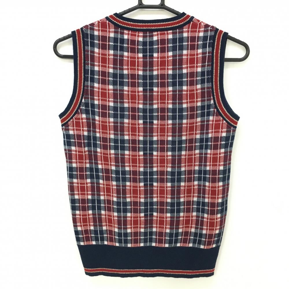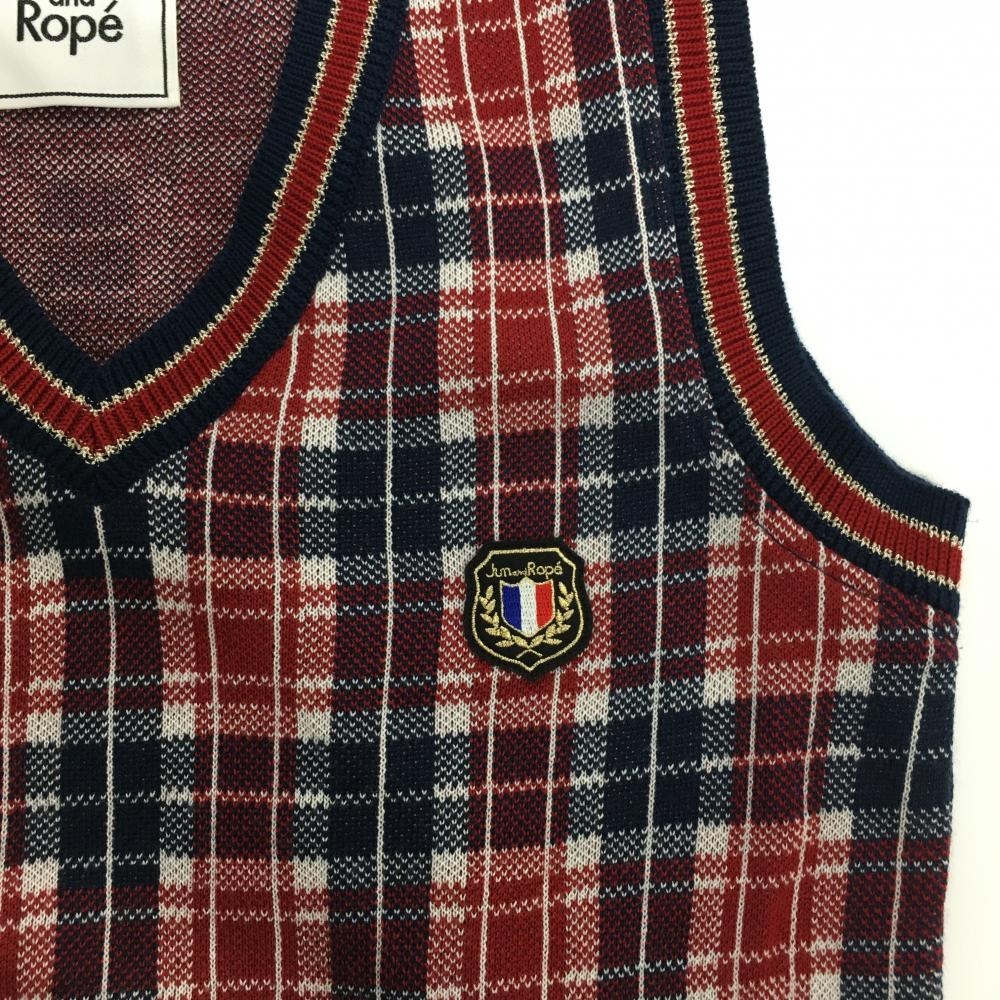 【超美品】ジュンアンドロペ ニットベスト ネイビー×レッド チェック ウール混 Vネック レディース M ゴルフウェア JUN&ROPE