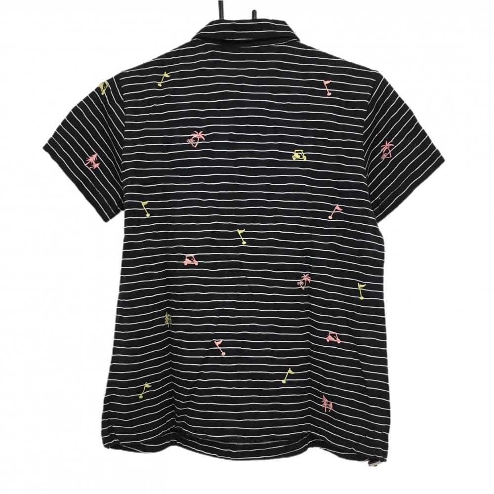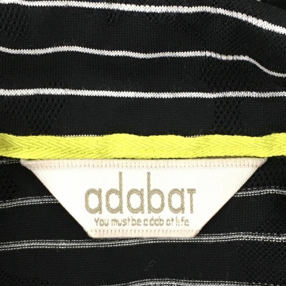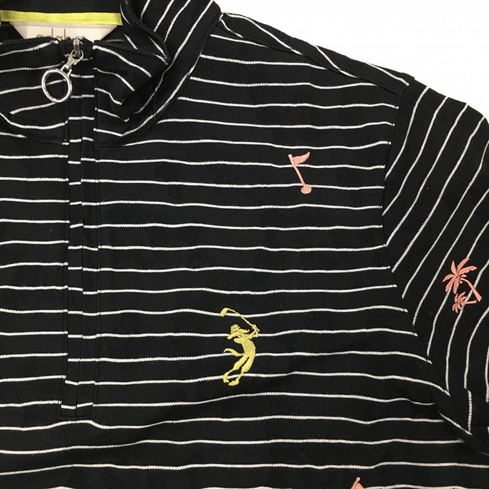 【美品】アダバット 半袖ハイネックシャツ 黒×白 ボーダー ヤシの木刺しゅう ハーフジップ レディース 38(M) ゴルフウェア adabat