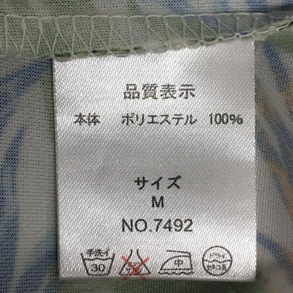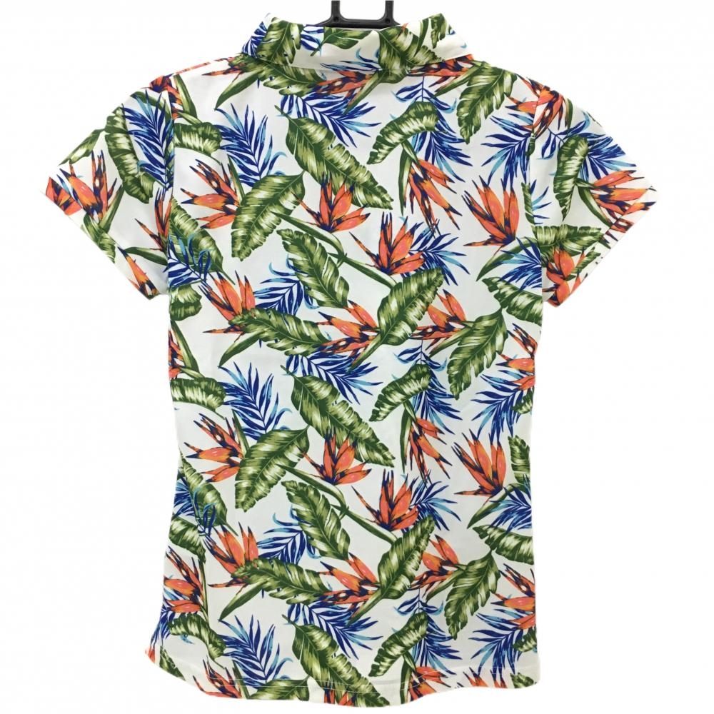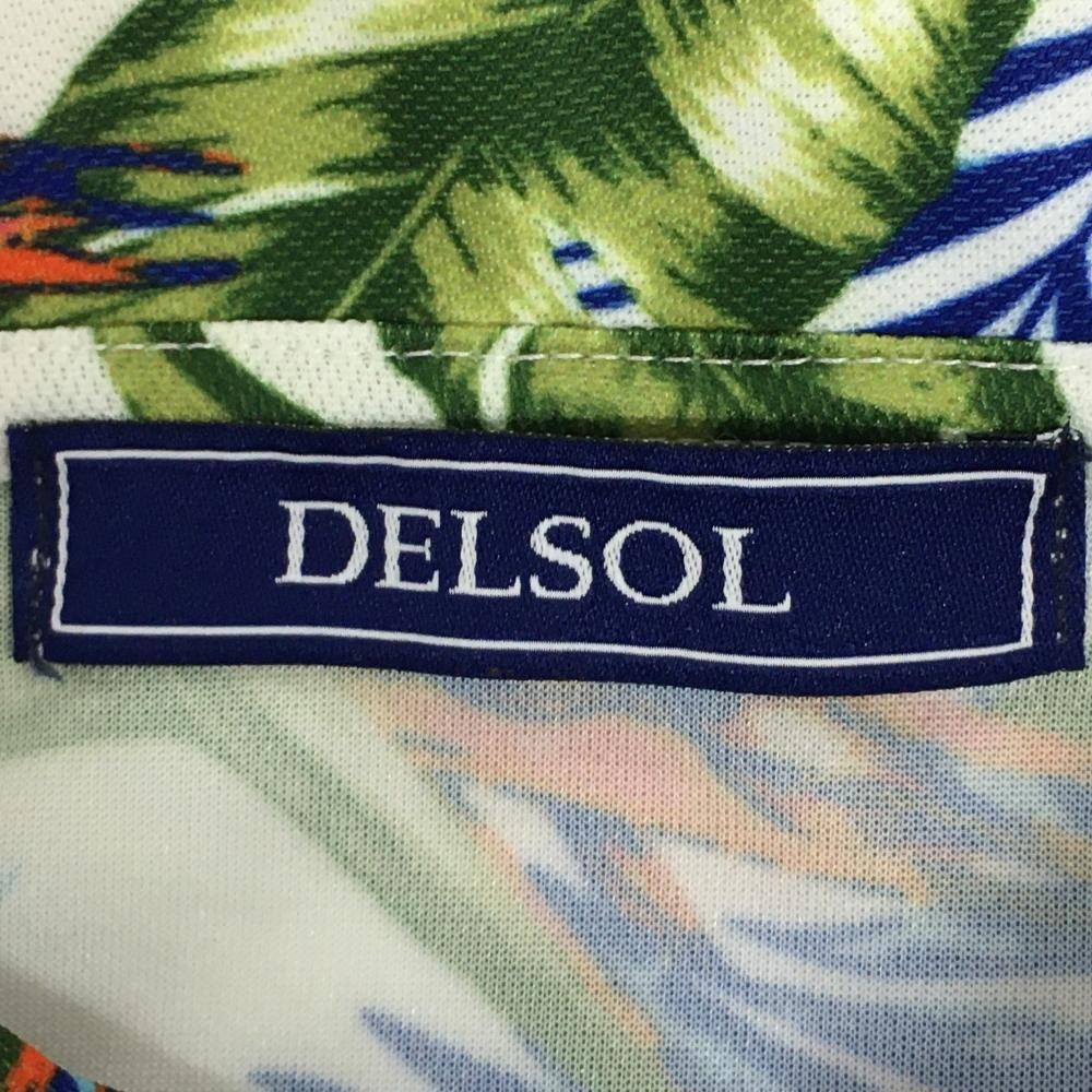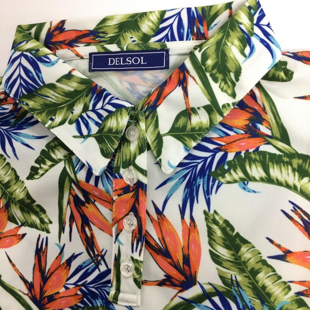 【超美品】デルソル 半袖ポロシャツ ライトベージュ×オレンジ×グリーン ボタニカル柄 レディース M ゴルフウェア DELSOL