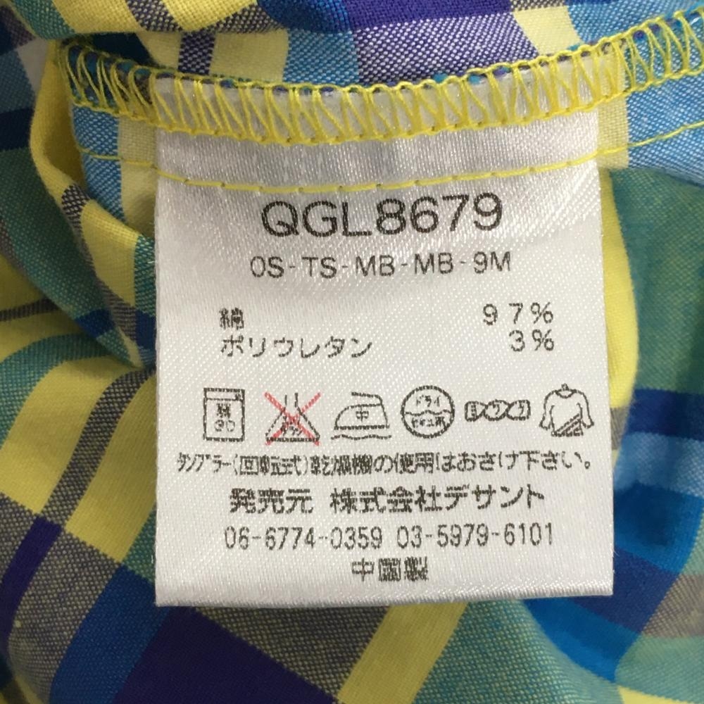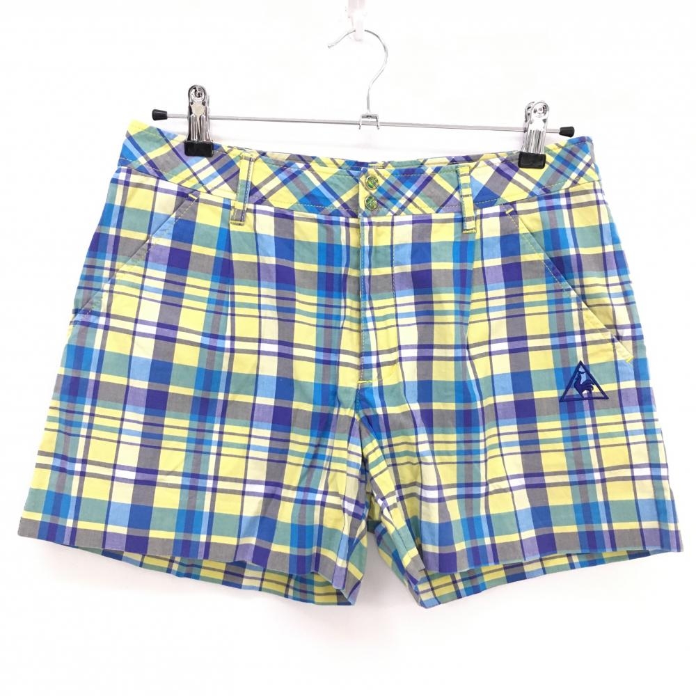 【美品】ルコック ショートパンツ ブルー×イエロー チェック ロゴ刺しゅう ストレッチ レディース 13 ゴルフウェア le coq sportif