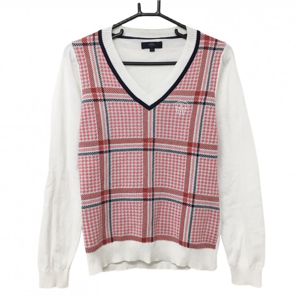 キャロウェイ セーター ピンク×白 前身頃千鳥格子 ニット Vネック コットン混 レディース L ゴルフウェア Callaway