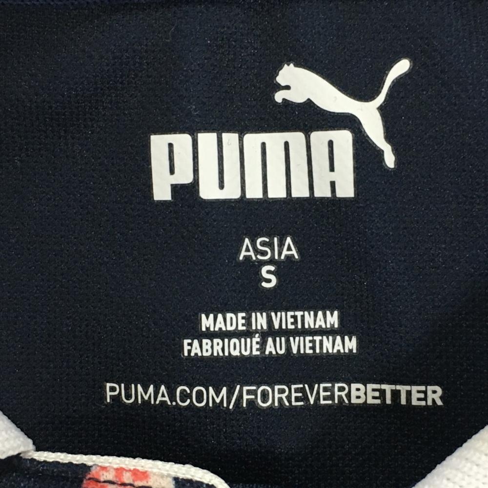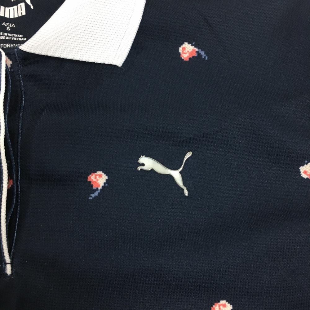 【美品】プーマ 半袖ポロシャツ ネイビー×ピンク 総柄 襟白 レディース S ゴルフウェア PUMA