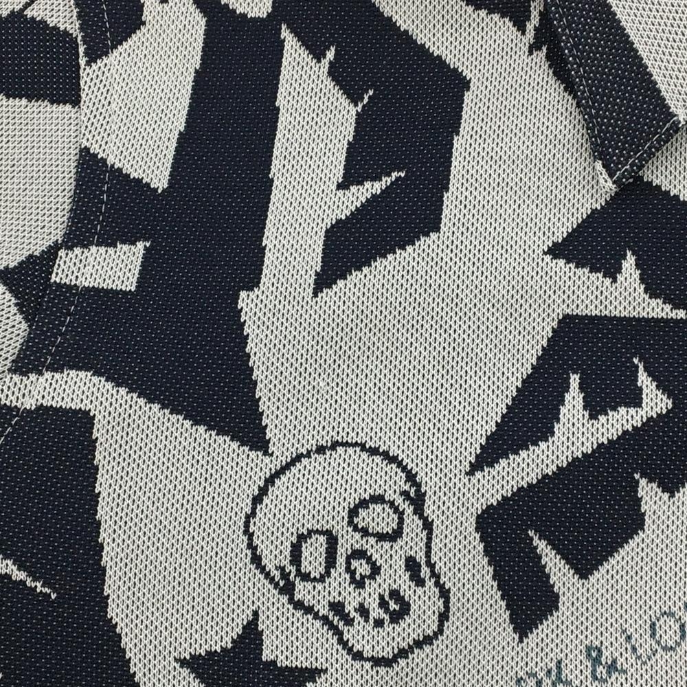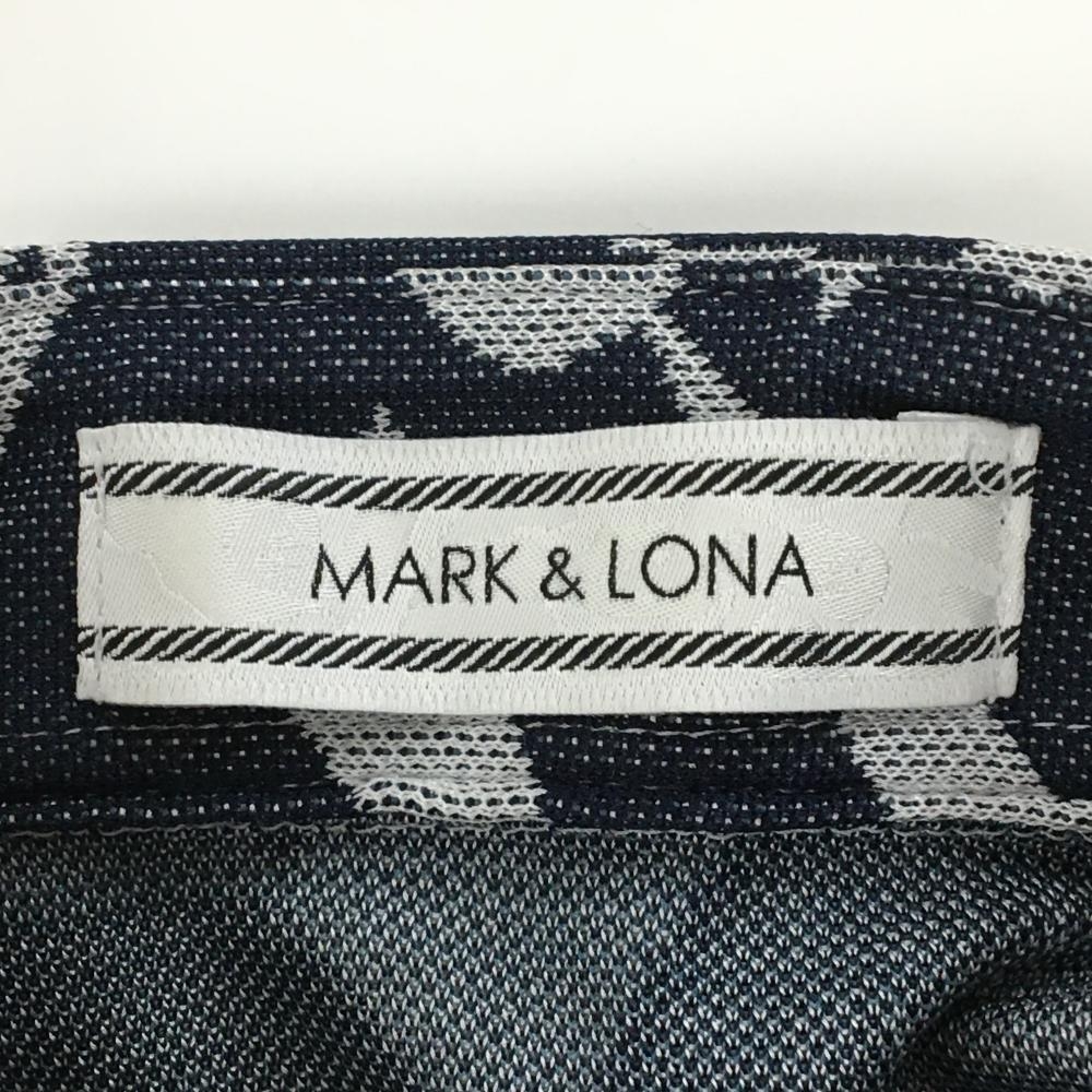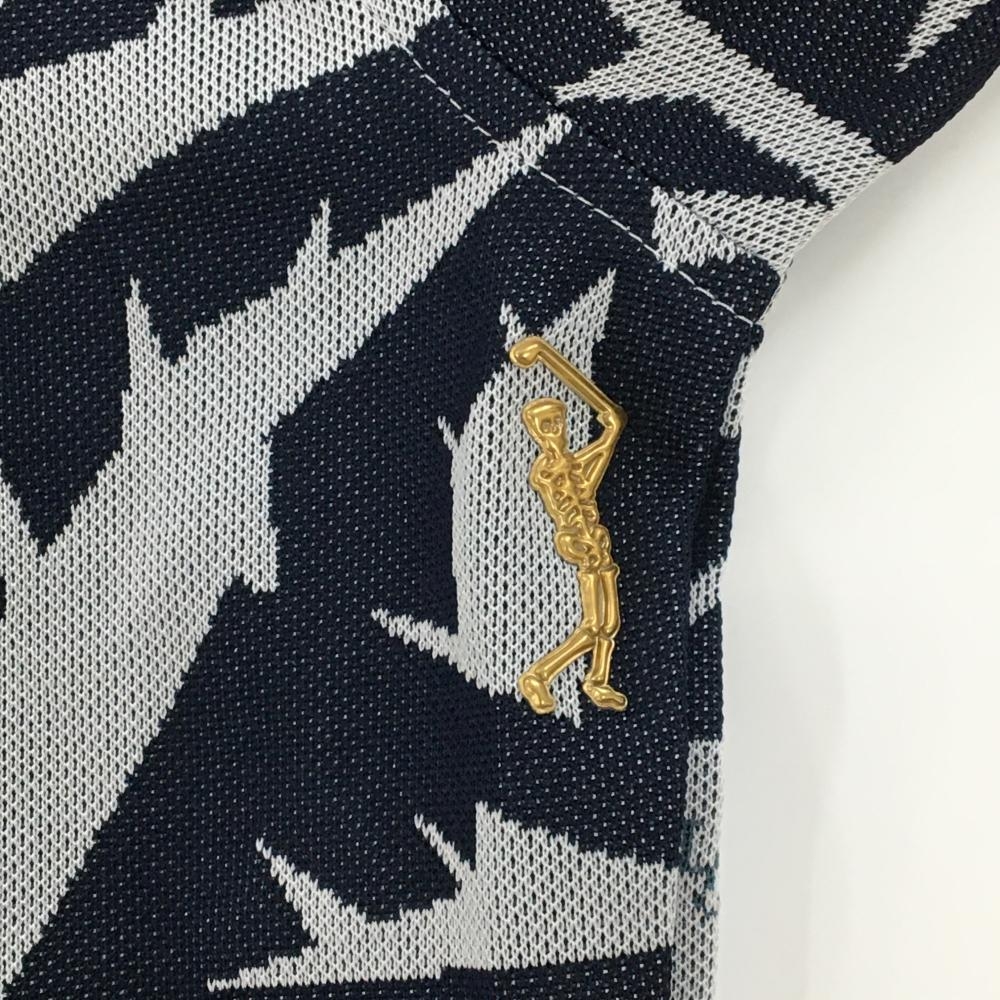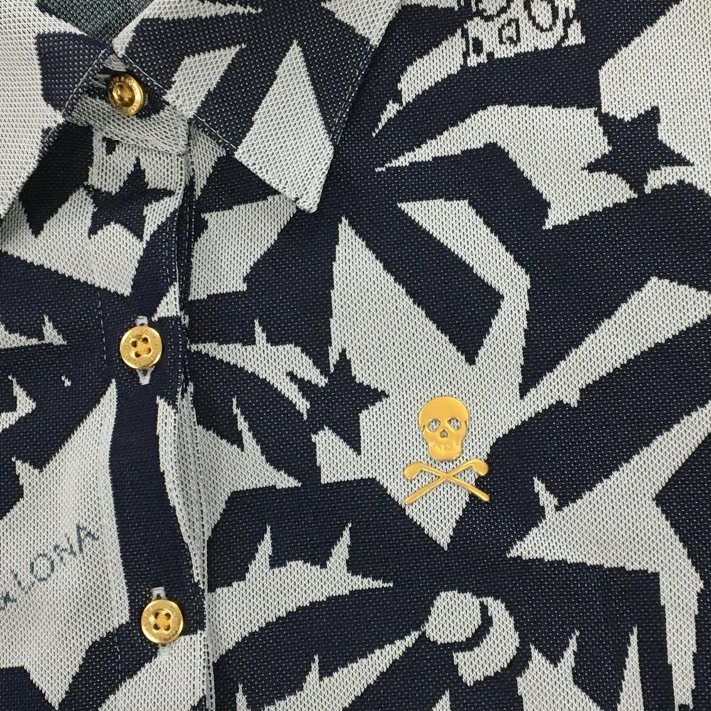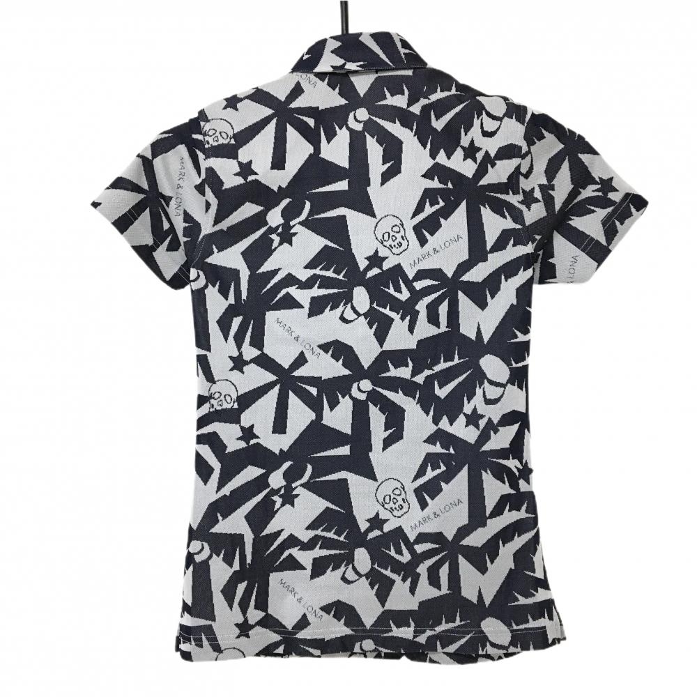マークアンドロナ 半袖ポロシャツ ライトグレー×ネイビー 総柄 ヤシの木 立体ロゴ レディース S ゴルフウェア MARK&LONA