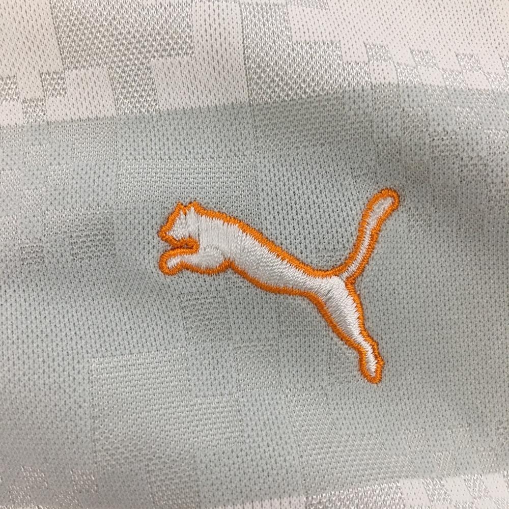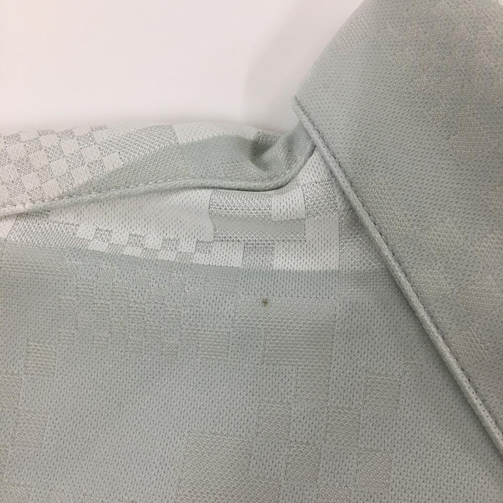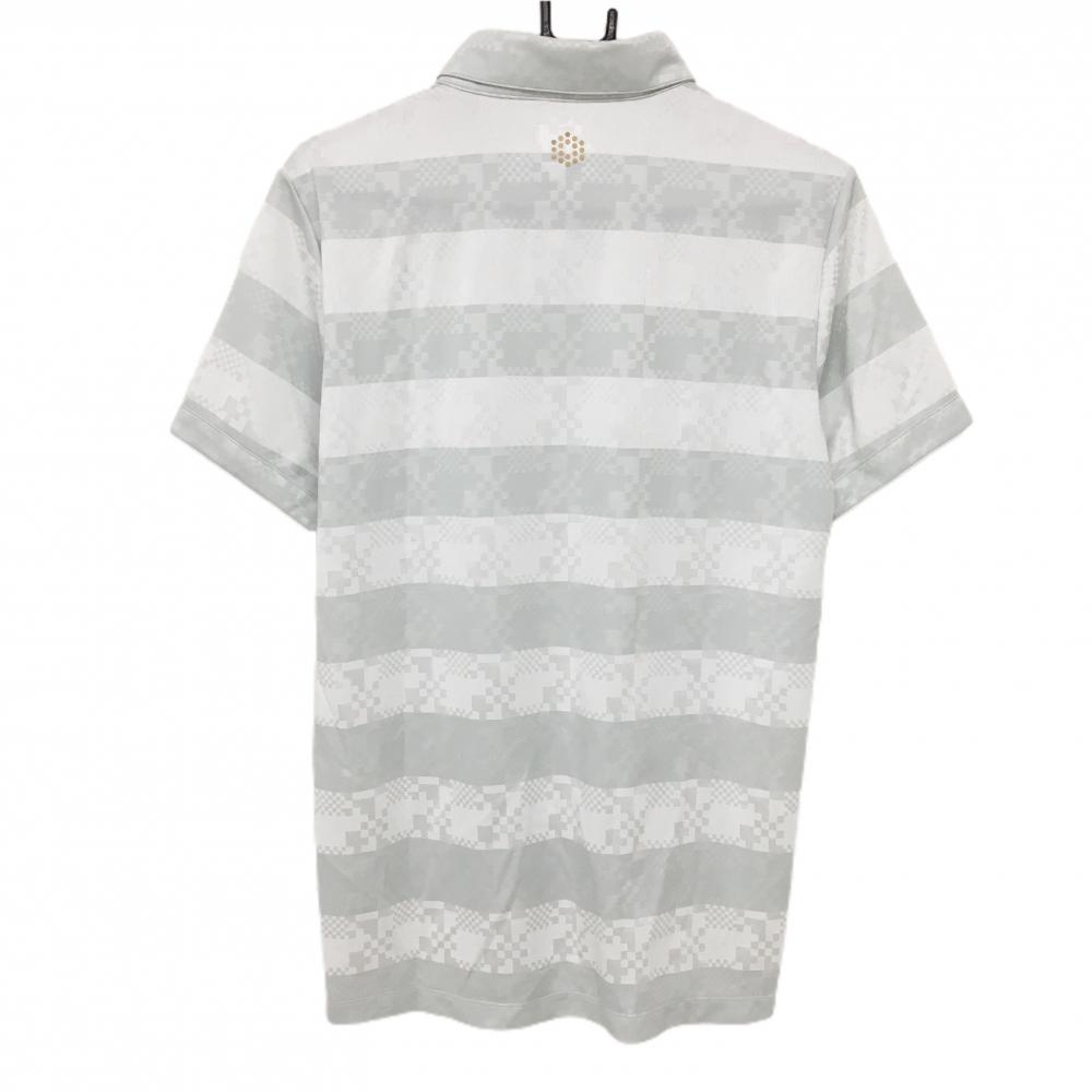 【美品】プーマ 半袖ポロシャツ ライトグレー×白 太ボーダー ブロックチェック調 ボタンダウン DRYCELL メンズ O(XL) ゴルフウェア PUMA