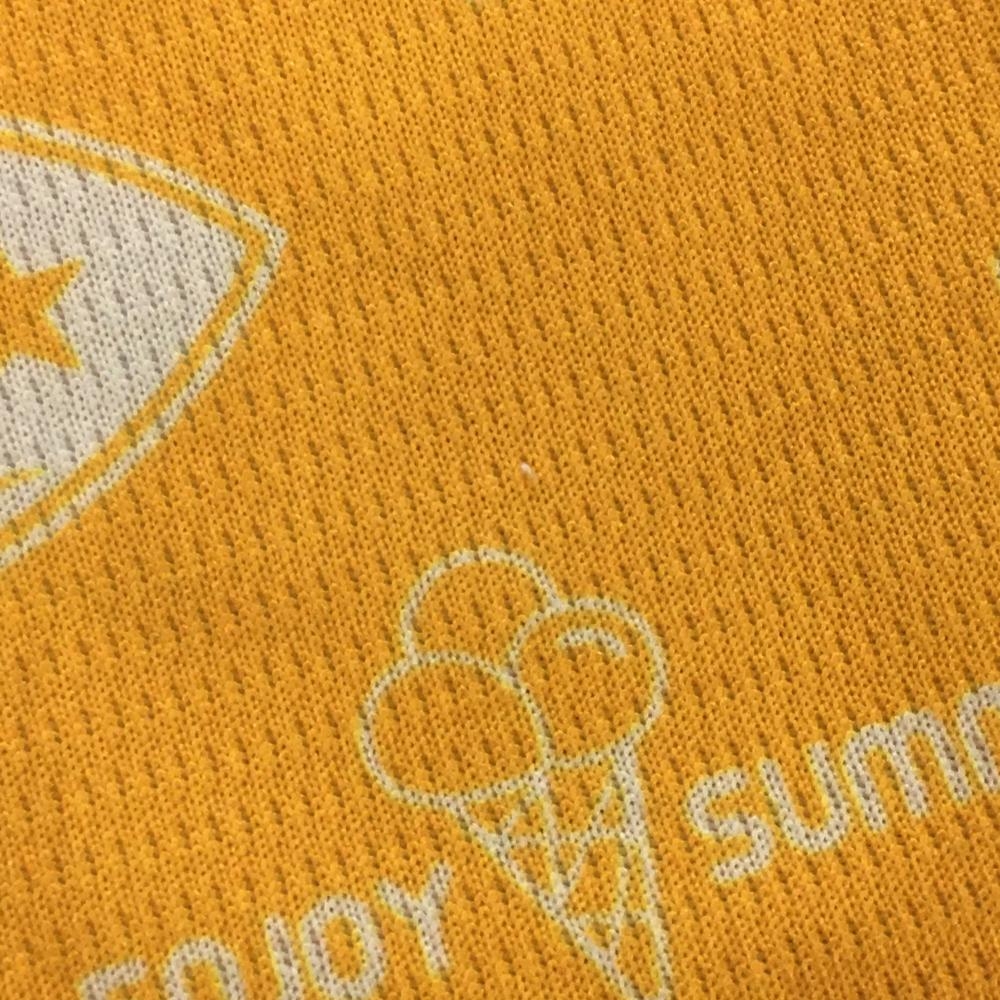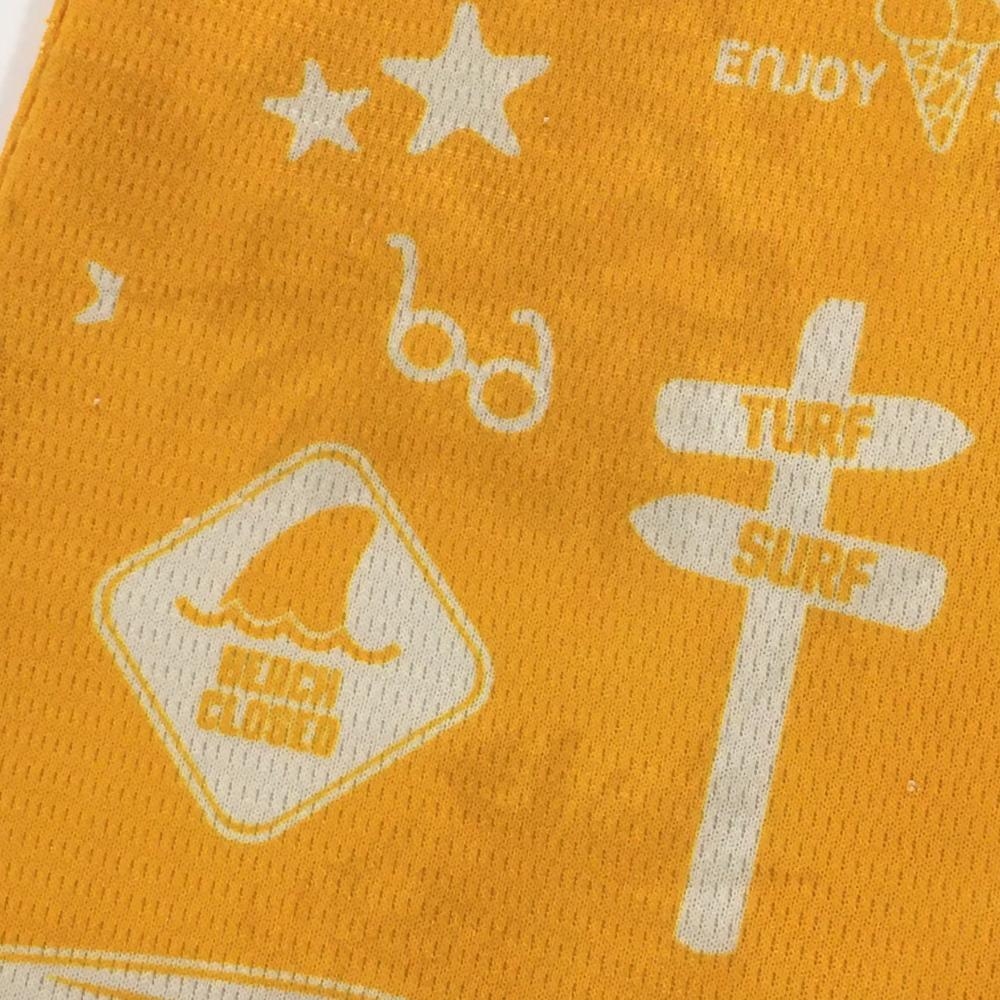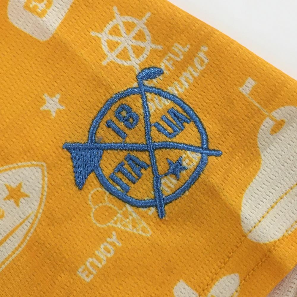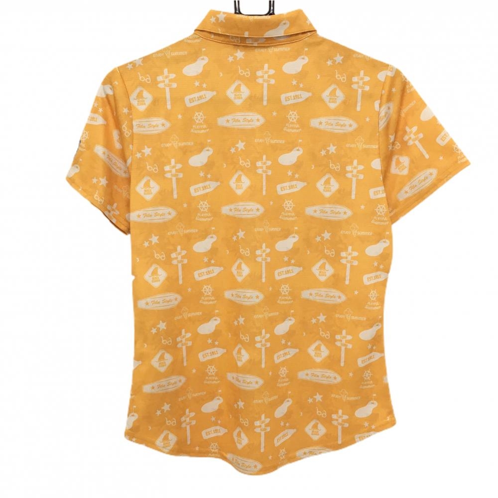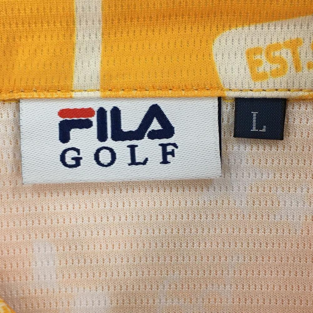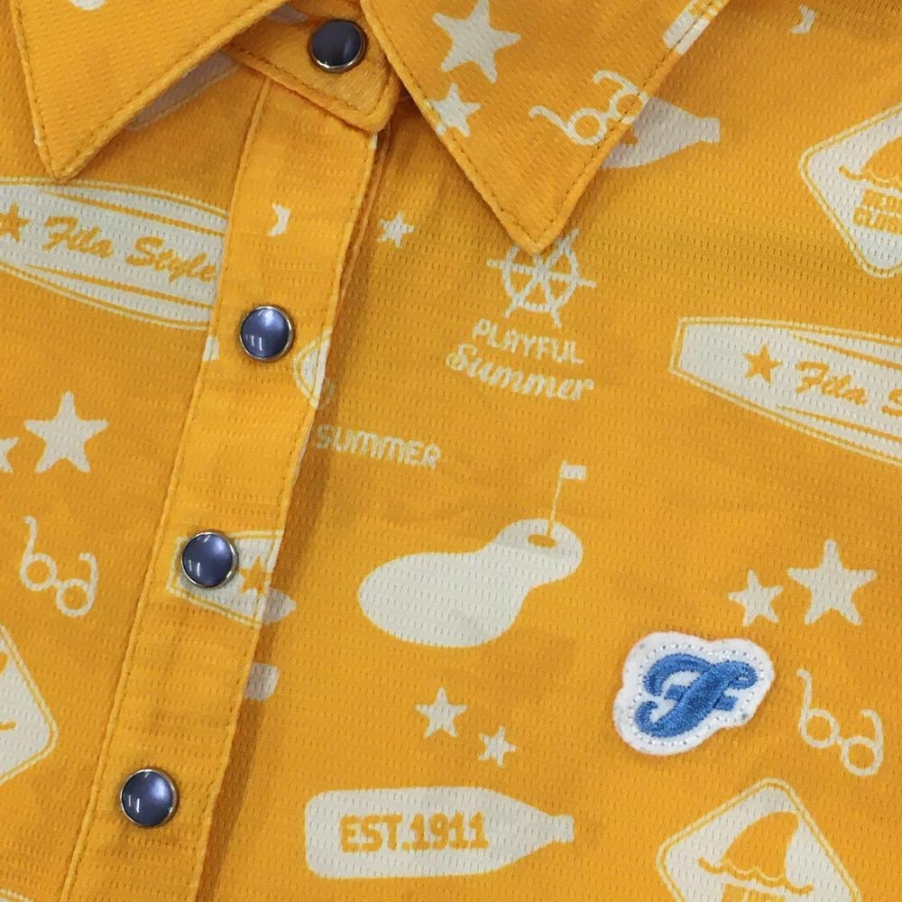 フィラゴルフ 半袖ポロシャツ オレンジイエロー×白 総柄 胸元ワッペン スナップボタン レディース L ゴルフウェア FILA GOLF