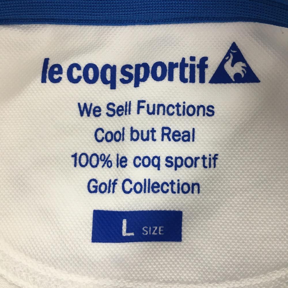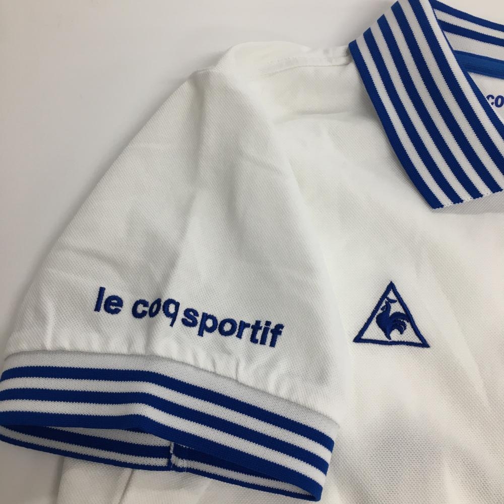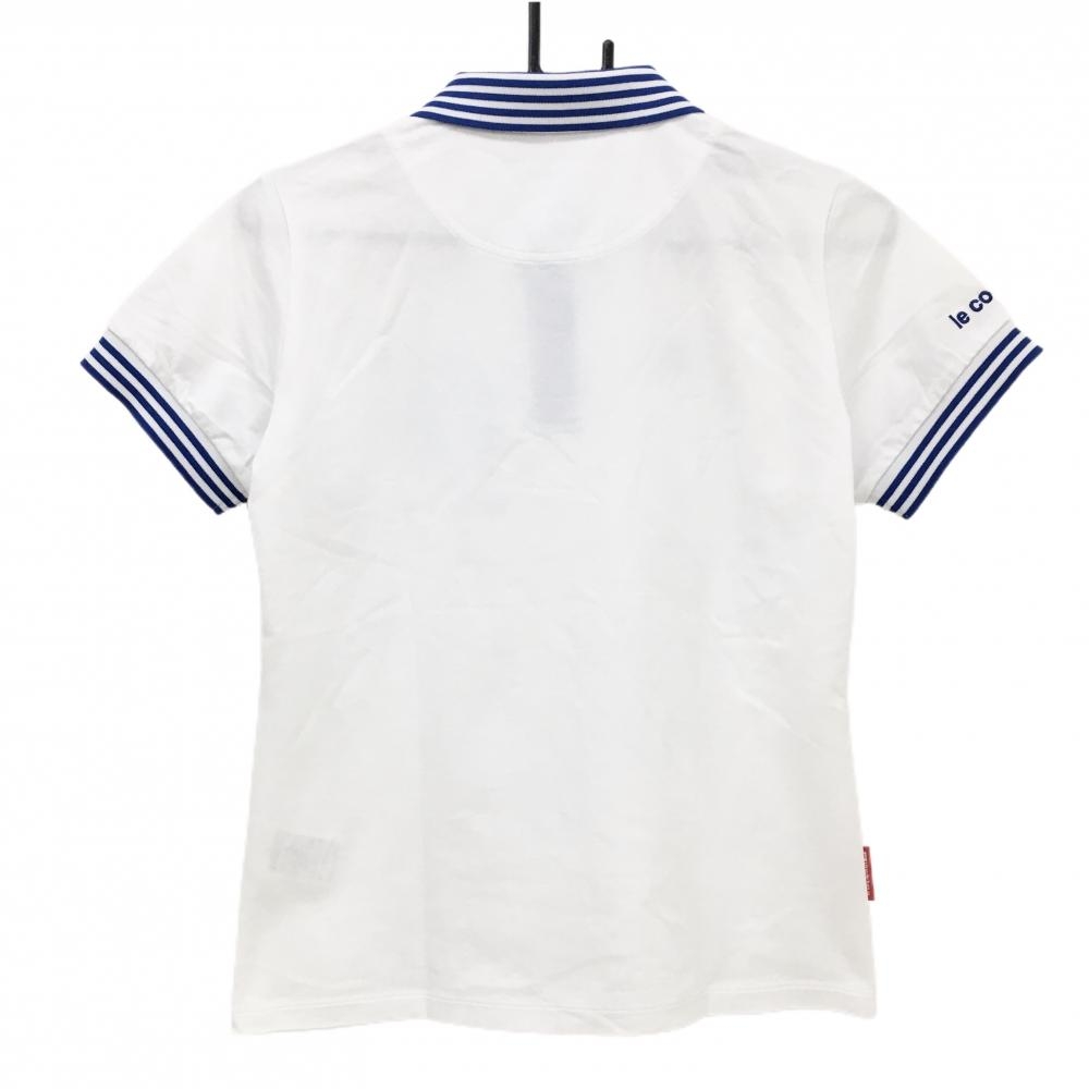 【超美品】ルコックゴルフ 半袖ポロシャツ 白×ブルー 襟・袖口ボーダー ロゴ刺しゅう レディース L ゴルフウェア le coq sportif