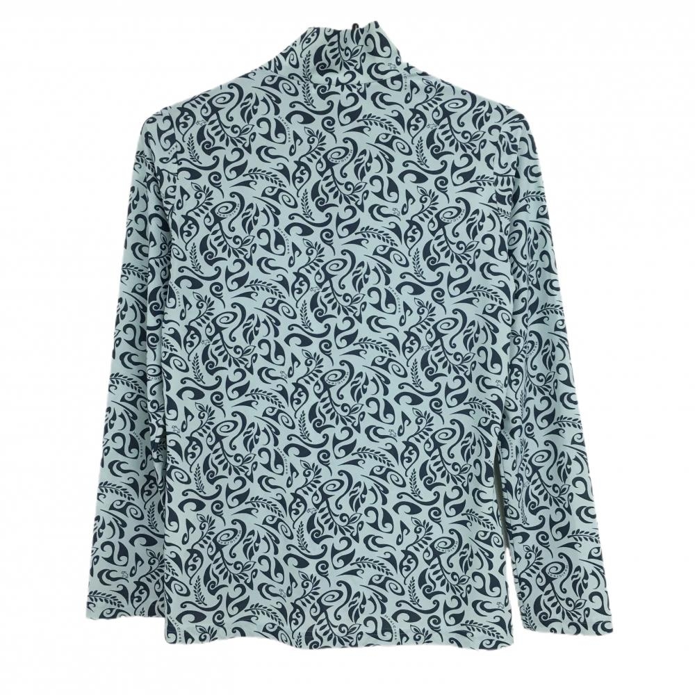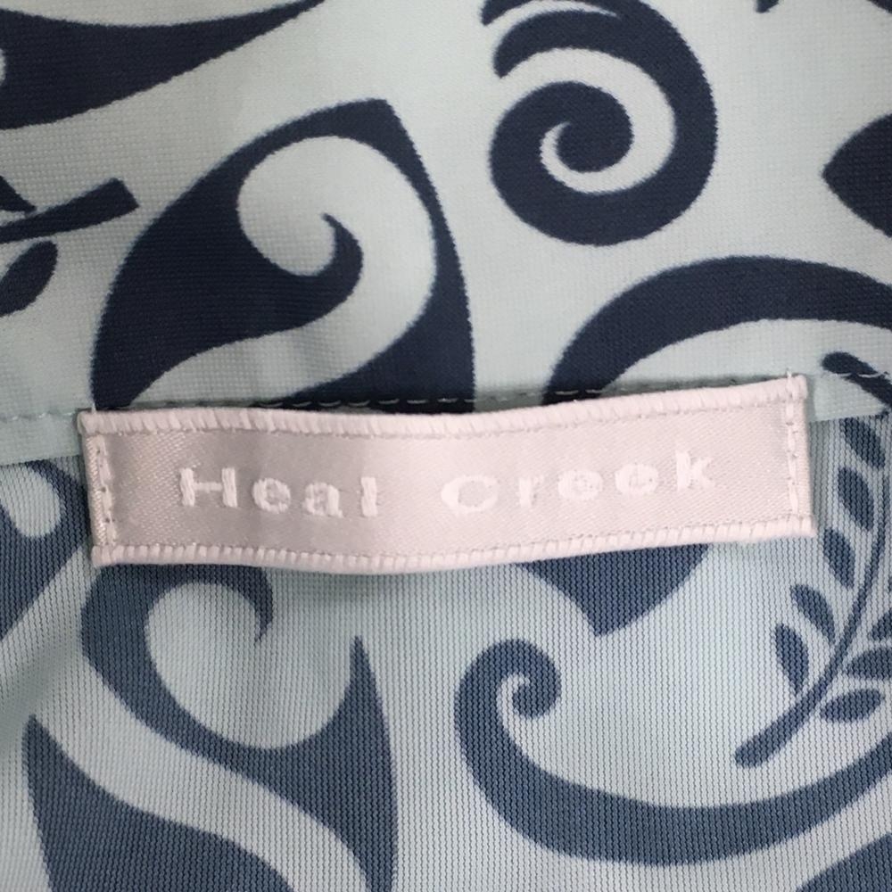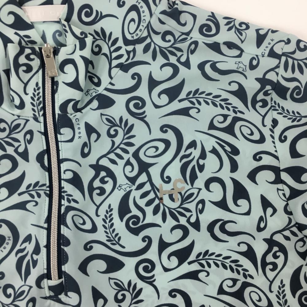 【超美品】ヒールクリーク 長袖ハイネックシャツ ライトブルー×ネイビー 総柄 胸元ロゴ レディース 40(M) ゴルフウェア Heal Creek