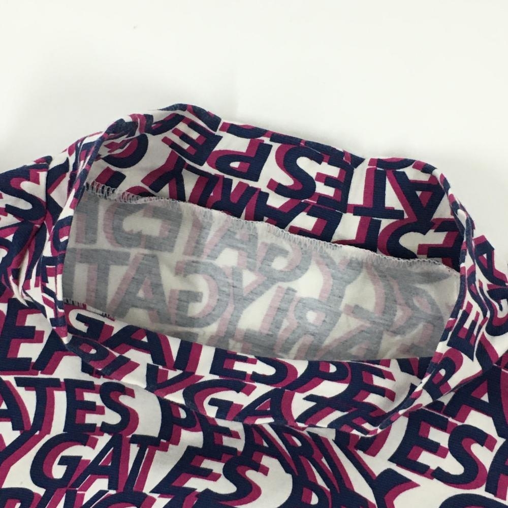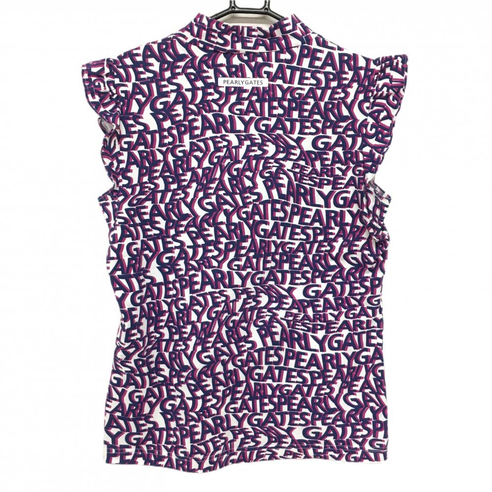 【美品】パーリーゲイツ ノースリーブハイネックシャツ 白×ネイビー×ピンク系 ロゴ英字総柄 レディース 2(L) ゴルフウェア PEARLY GATES