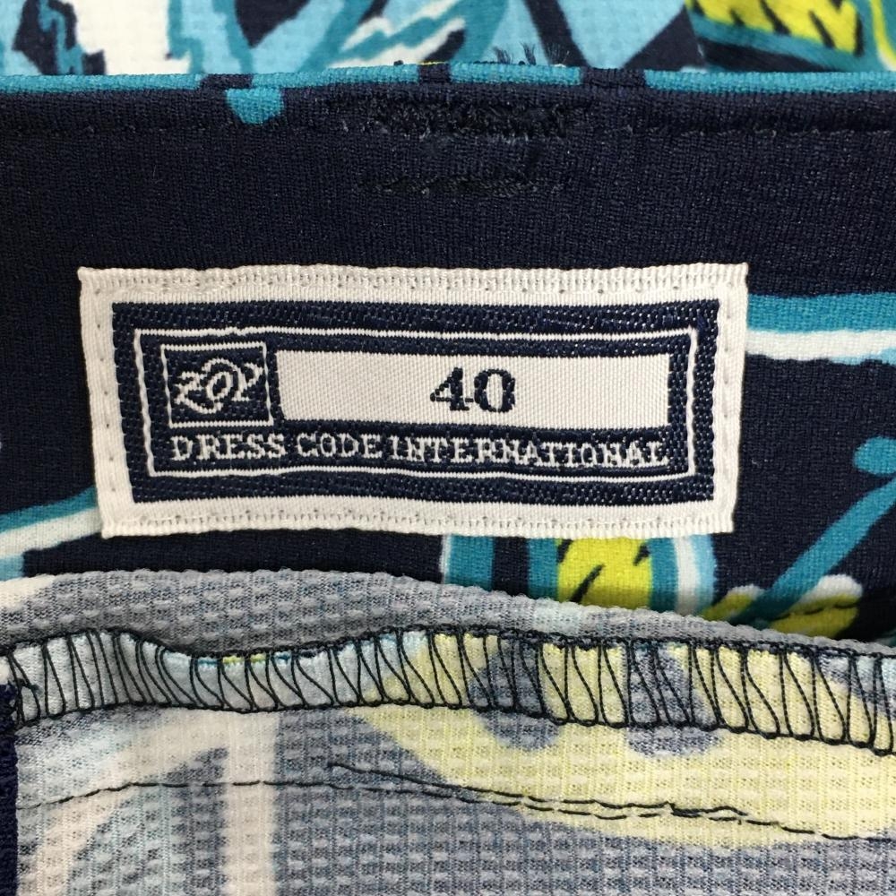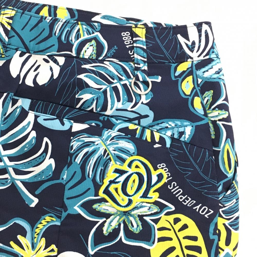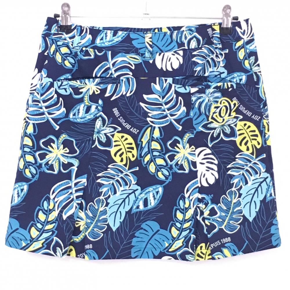 【超美品】ゾーイ スカート ネイビー×ライトブルー×イエロー系 リーフ柄 花柄 ボックスプリーツ レディース 40(L) ゴルフウェア ZOY
