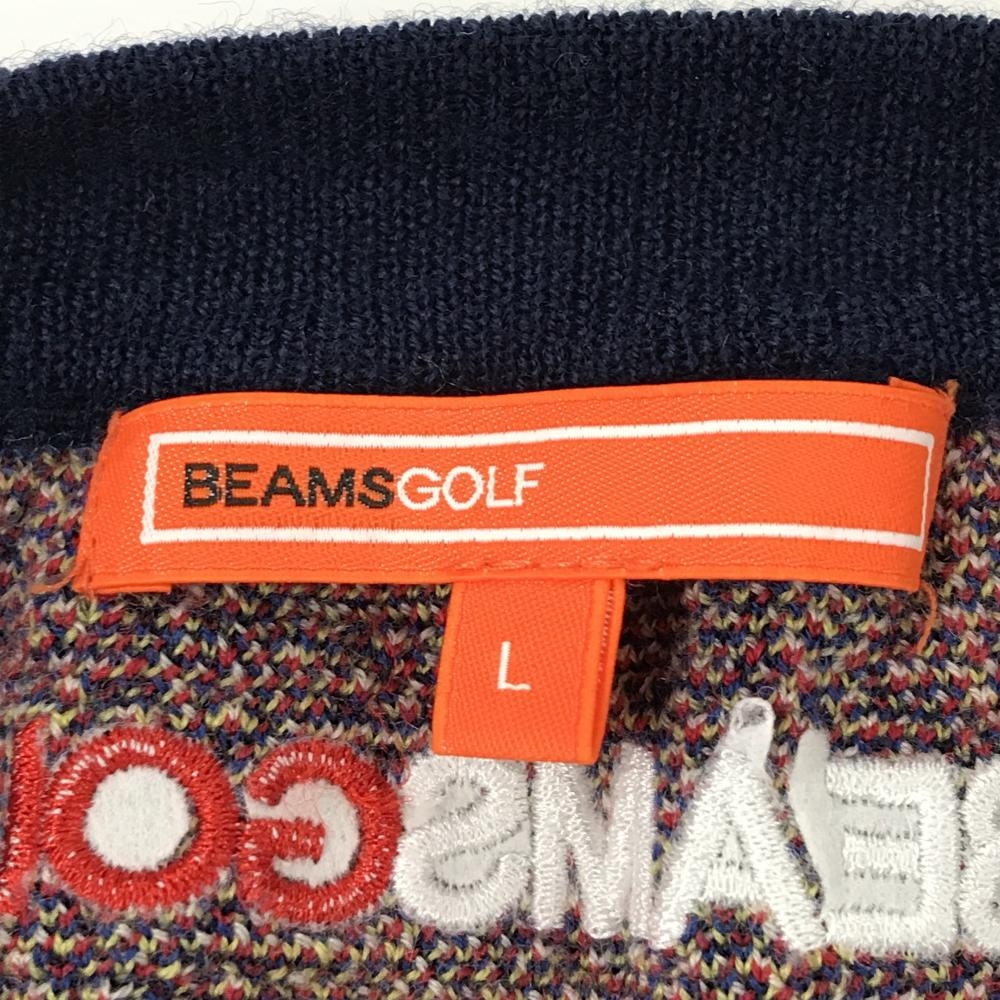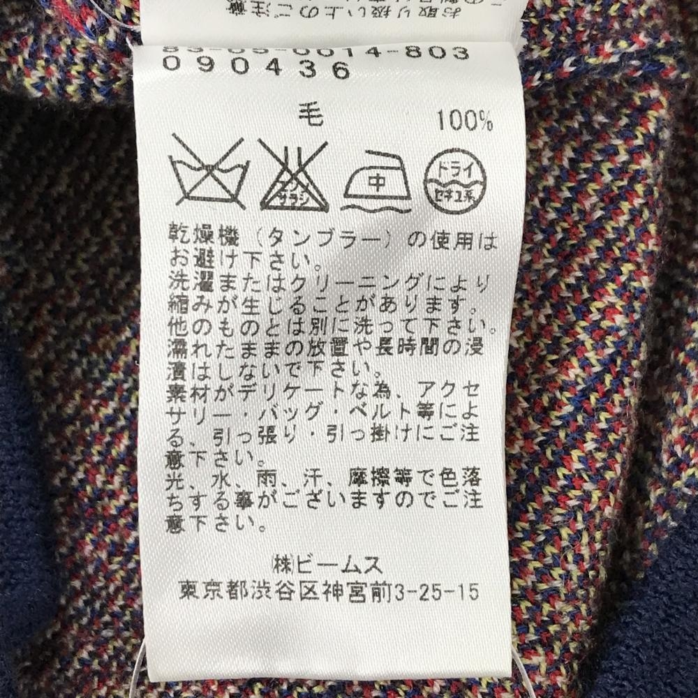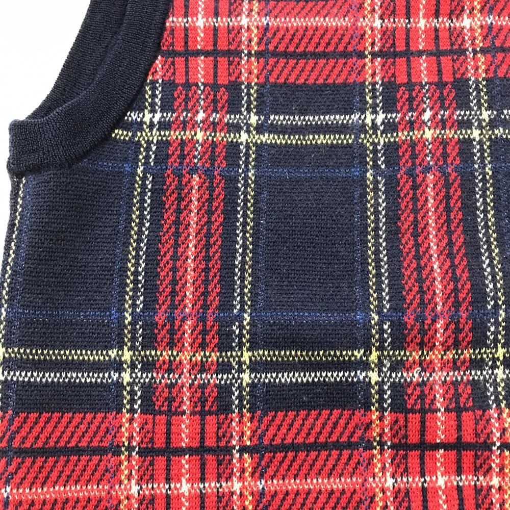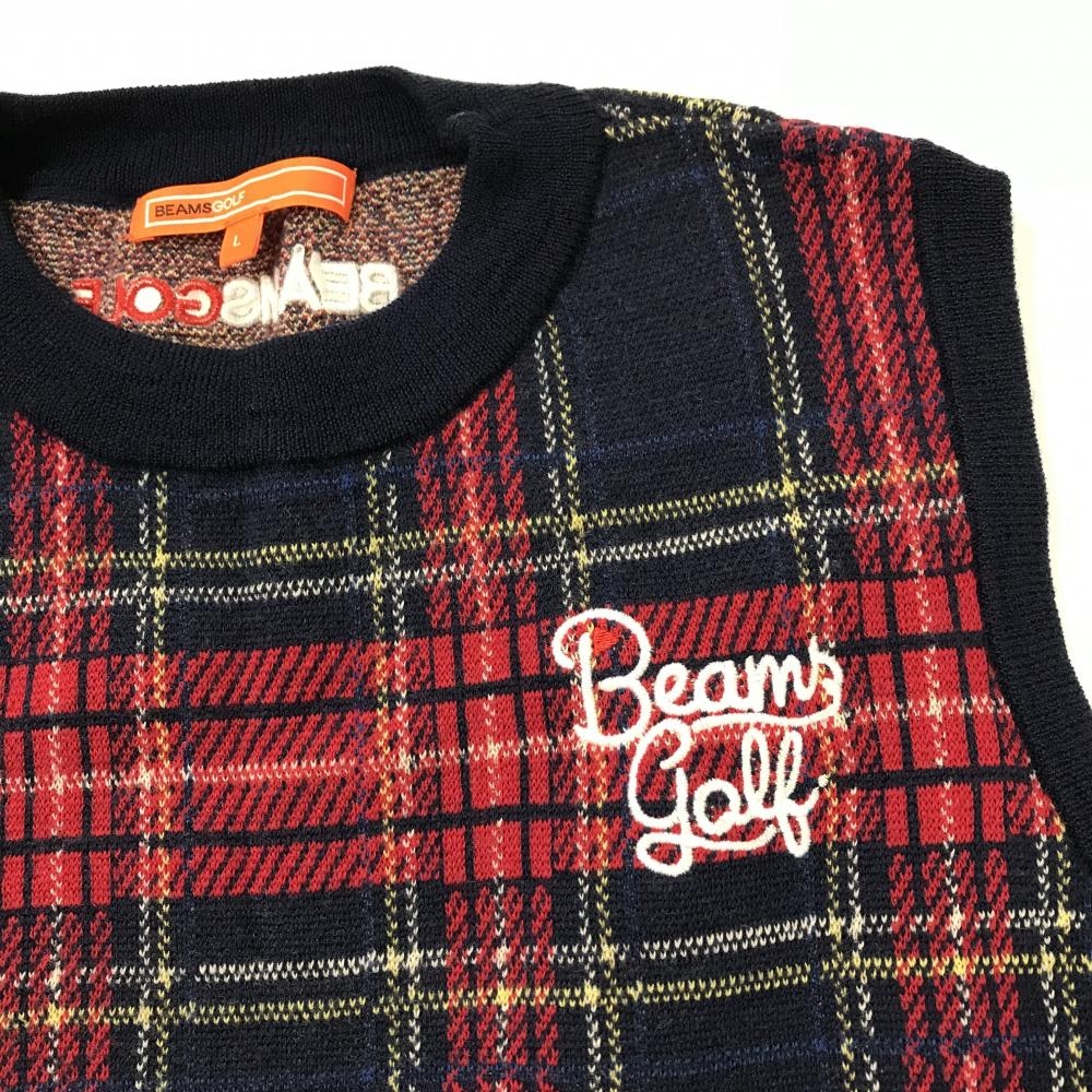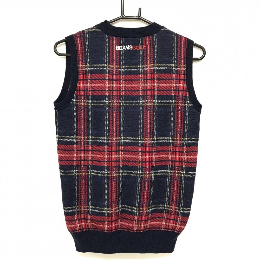【美品】ビームスゴルフ ニットベスト ネイビー×レッド チェック ウール100% ロゴ刺しゅう レディース L ゴルフウェア BEAMS GOLF