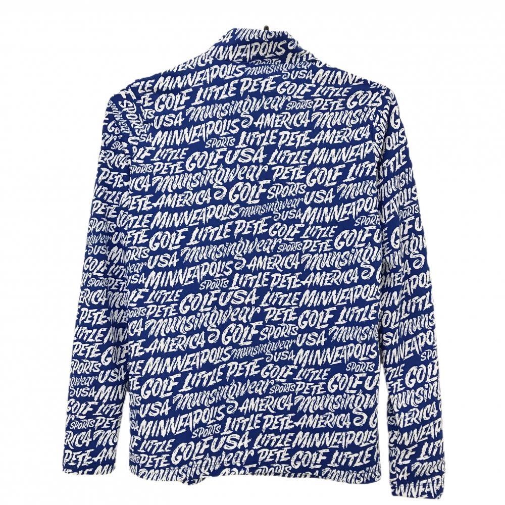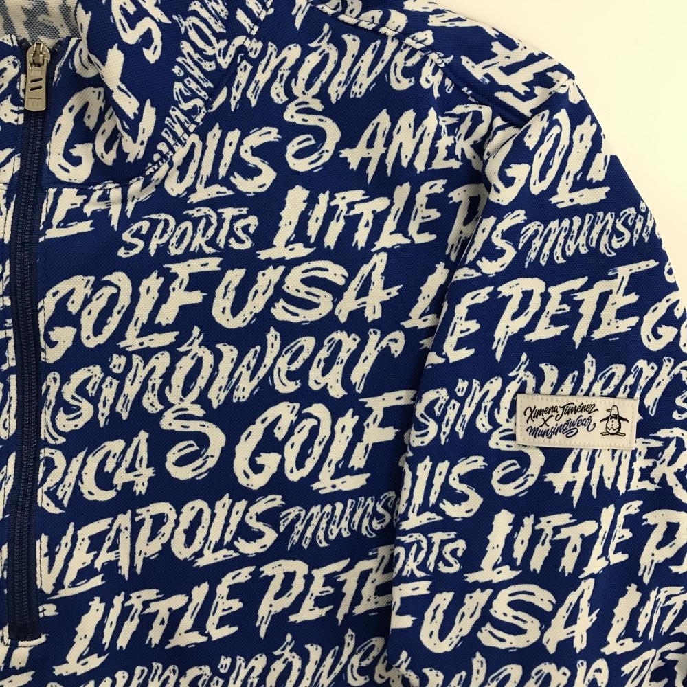 【超美品】マンシングウェア 長袖ハイネックシャツ ブルー×白 ハーフジップ 英字総柄 レディース M ゴルフウェア Munsingwear