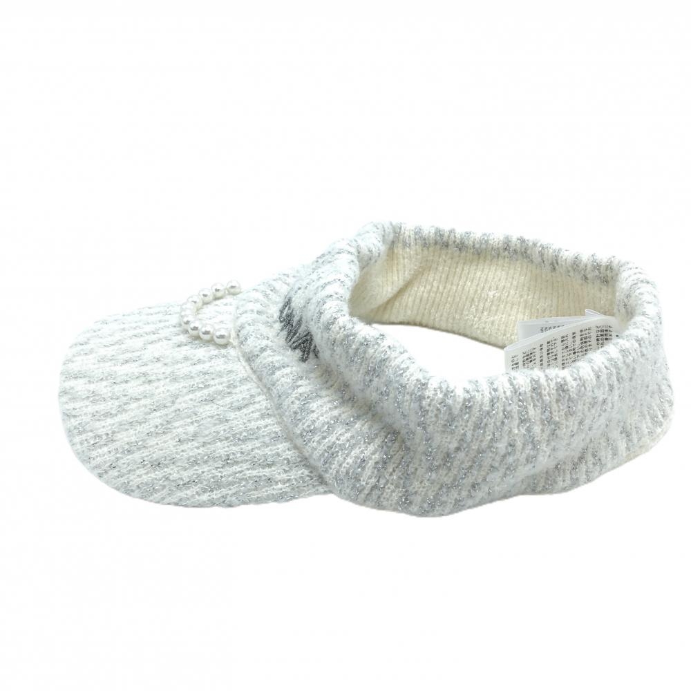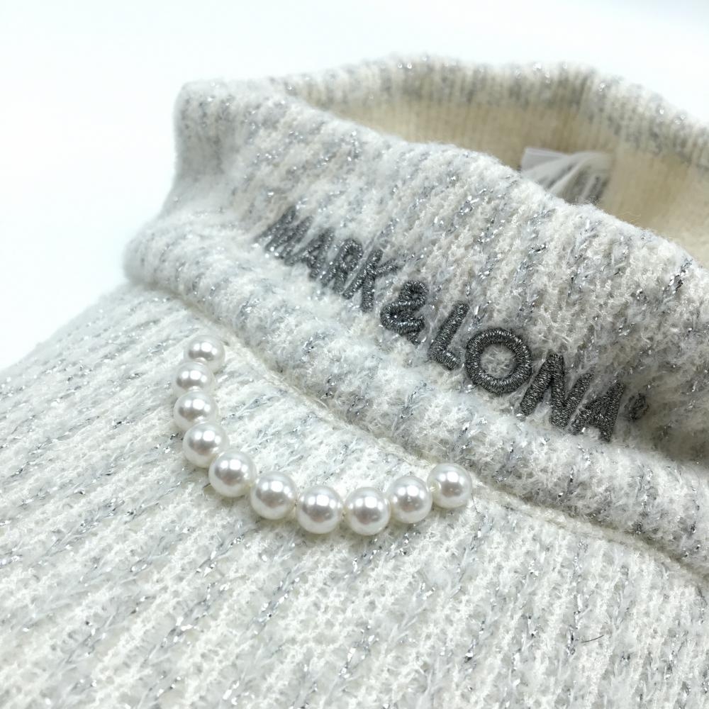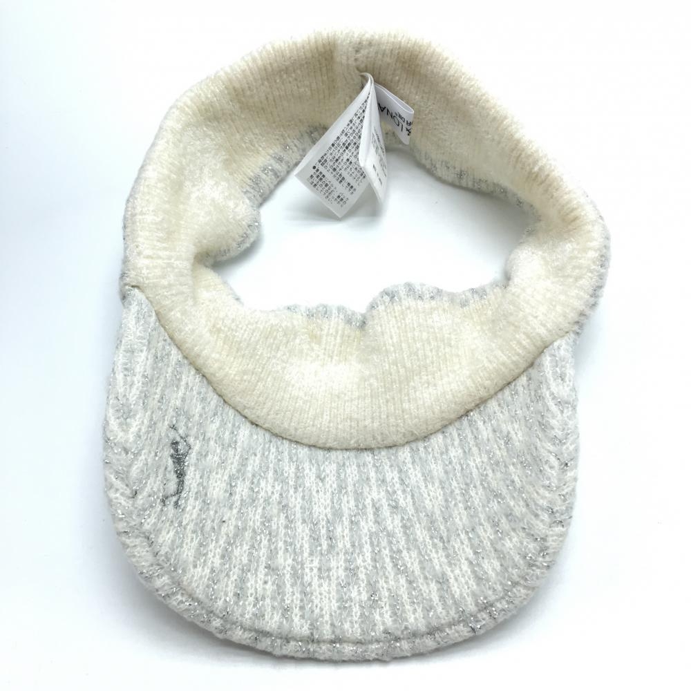 【超美品】マークアンドロナ ニットサンバイザー 白×グレー 総柄 ウール混 パールチャーム付 レディース FREE ゴルフウェア MARK&LONA