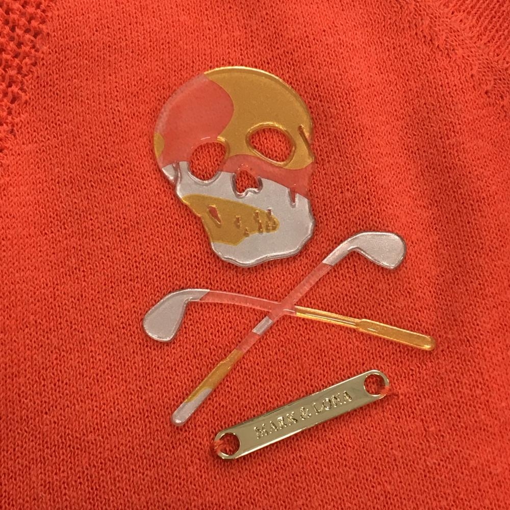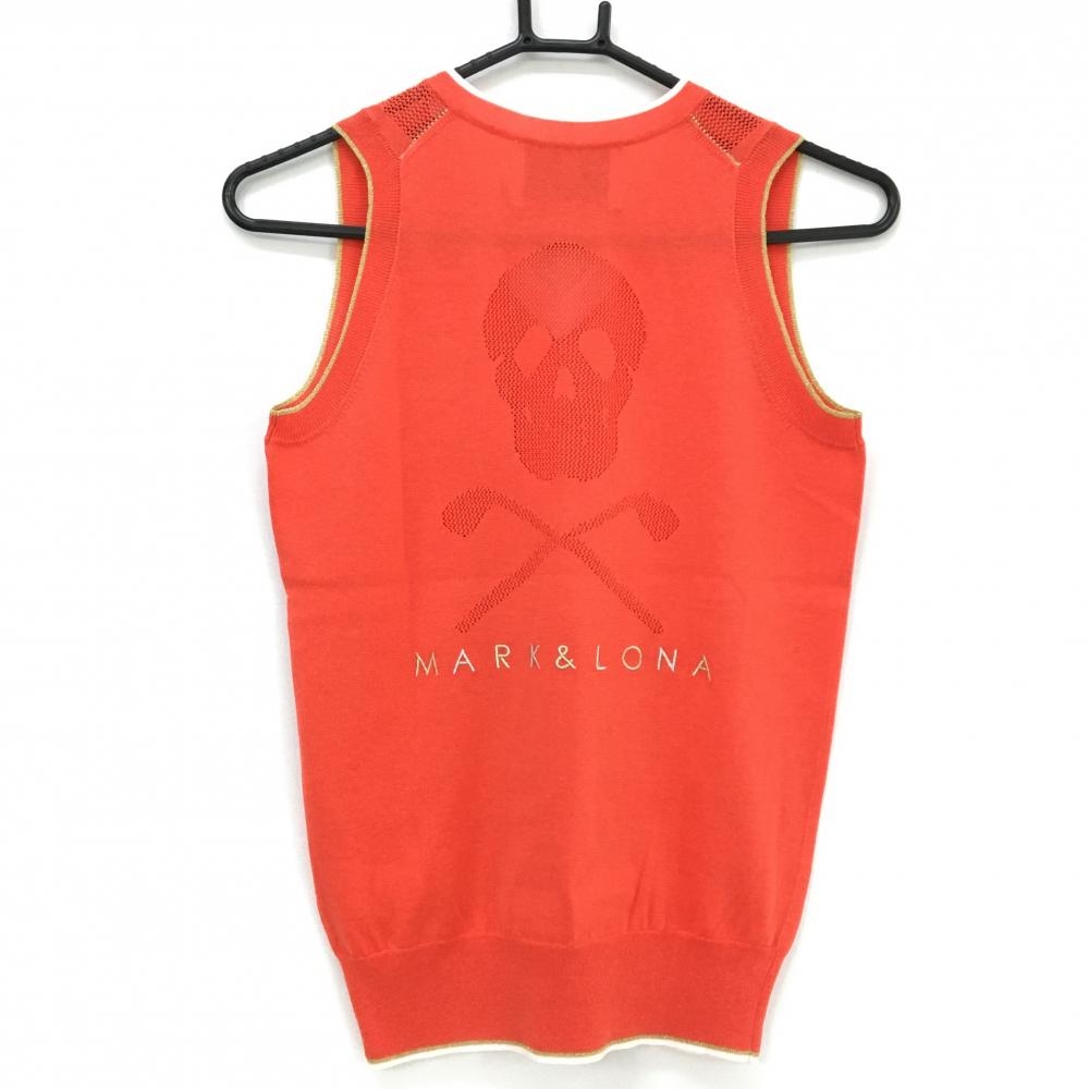 【超美品】マークアンドロナ ニットベスト オレンジ 背面透かし編みスカル コットン混 レディース S ゴルフウェア MARK&LONA