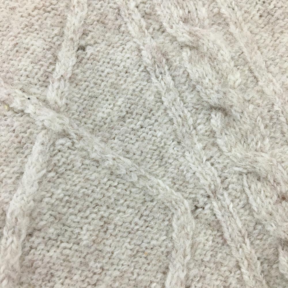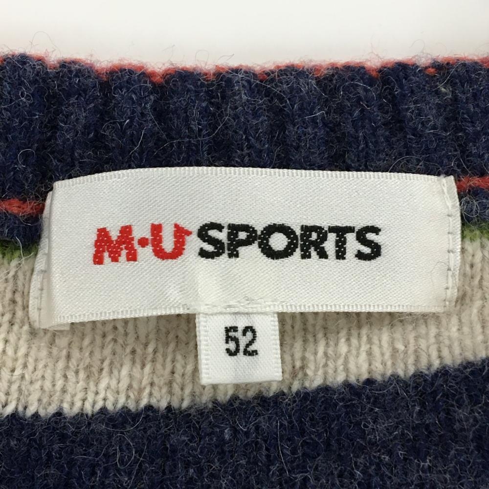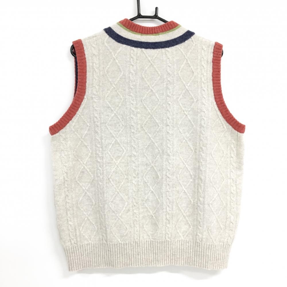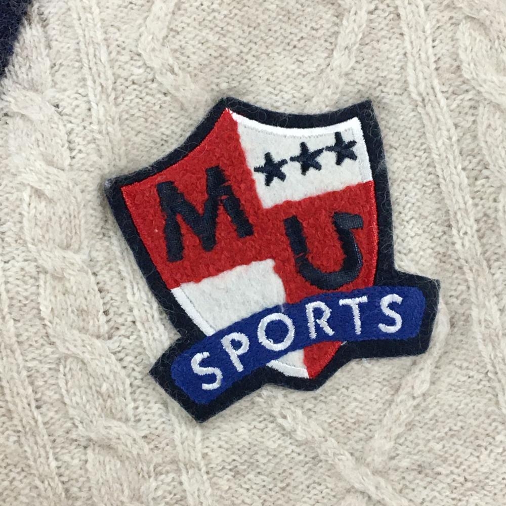 【超美品】MUスポーツ ニットベスト ベージュ×レッド系 Vネック ケーブル編み ロゴワッペン メンズ 52(XL) ゴルフウェア M・U SPORTS