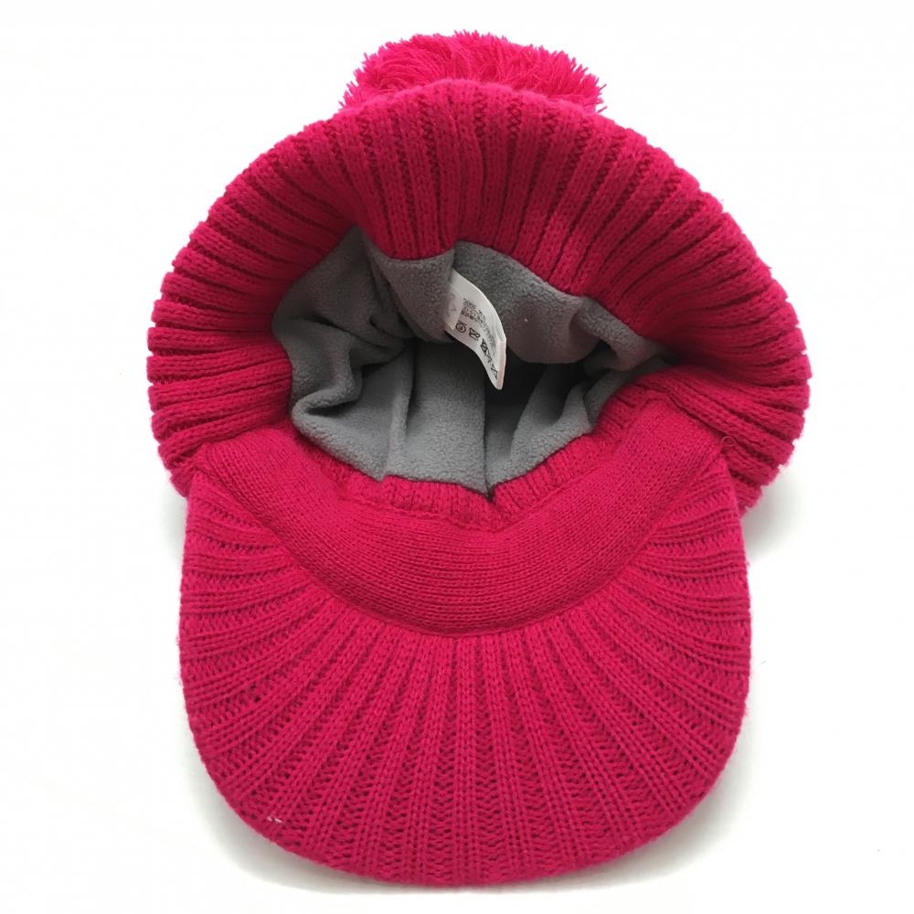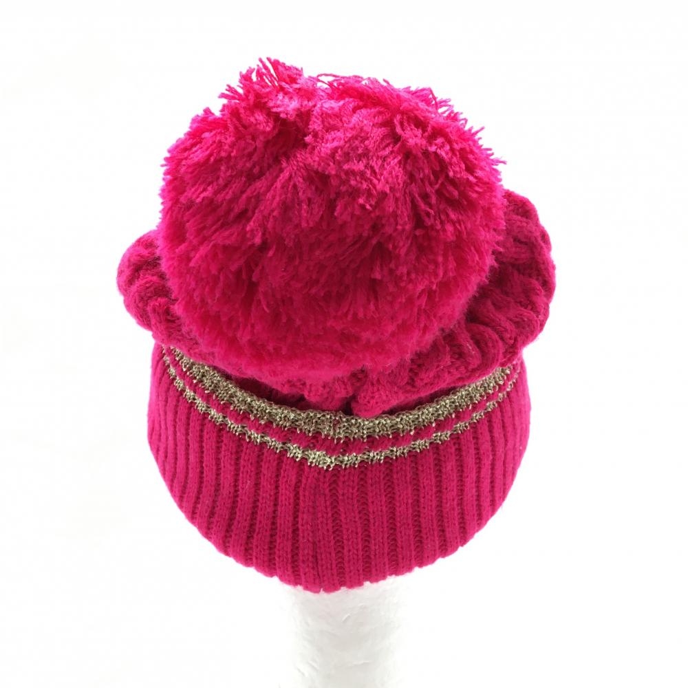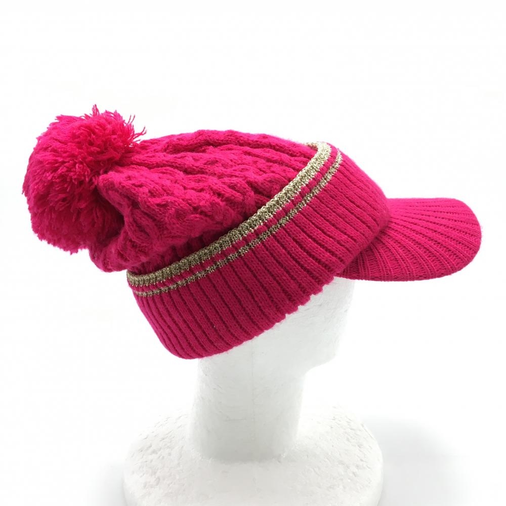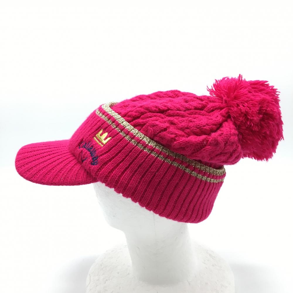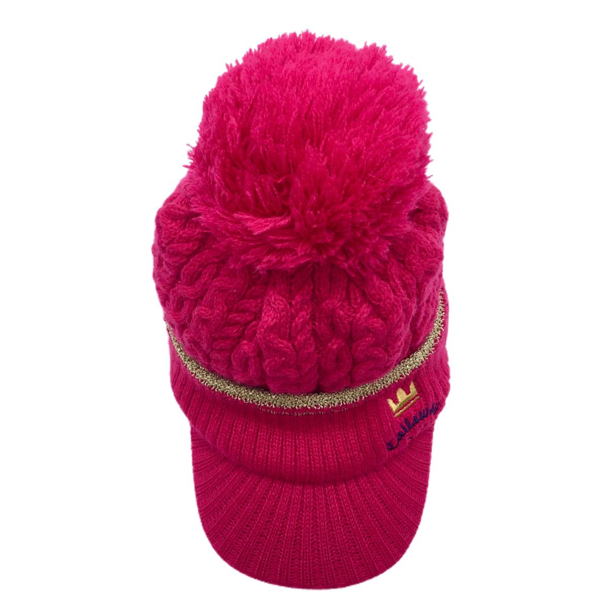 【美品】キャロウェイ つば付ニット帽 ピンク×ゴールド ケーブル編み ボンボン付 内側起毛 FR ゴルフウェア Callaway