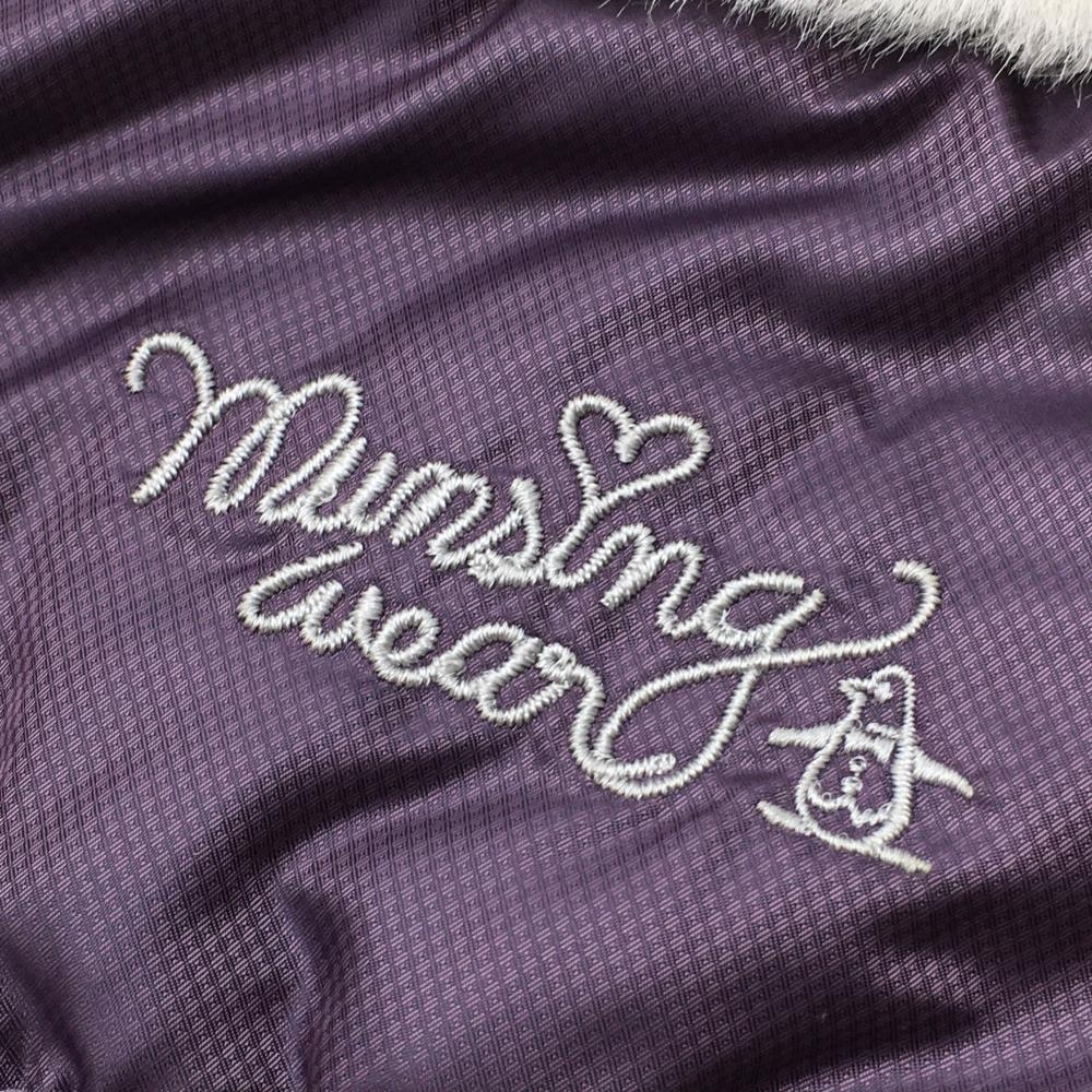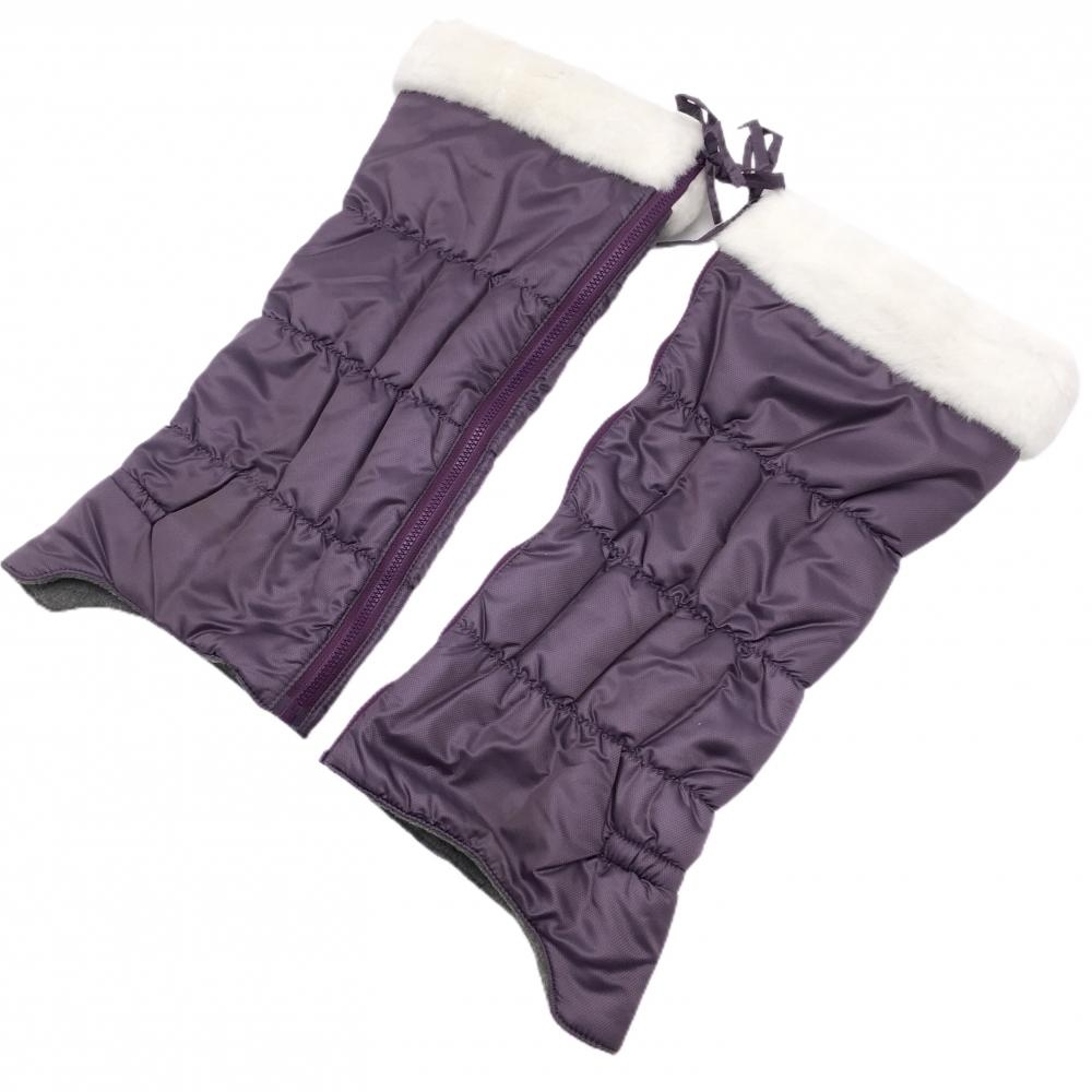 【美品】マンシングウェア 中綿レッグウォーマー パープル×白 上部ファー 裏起毛 ロゴ刺しゅう レディース ゴルフウェア Munsingwear