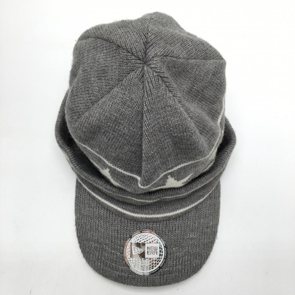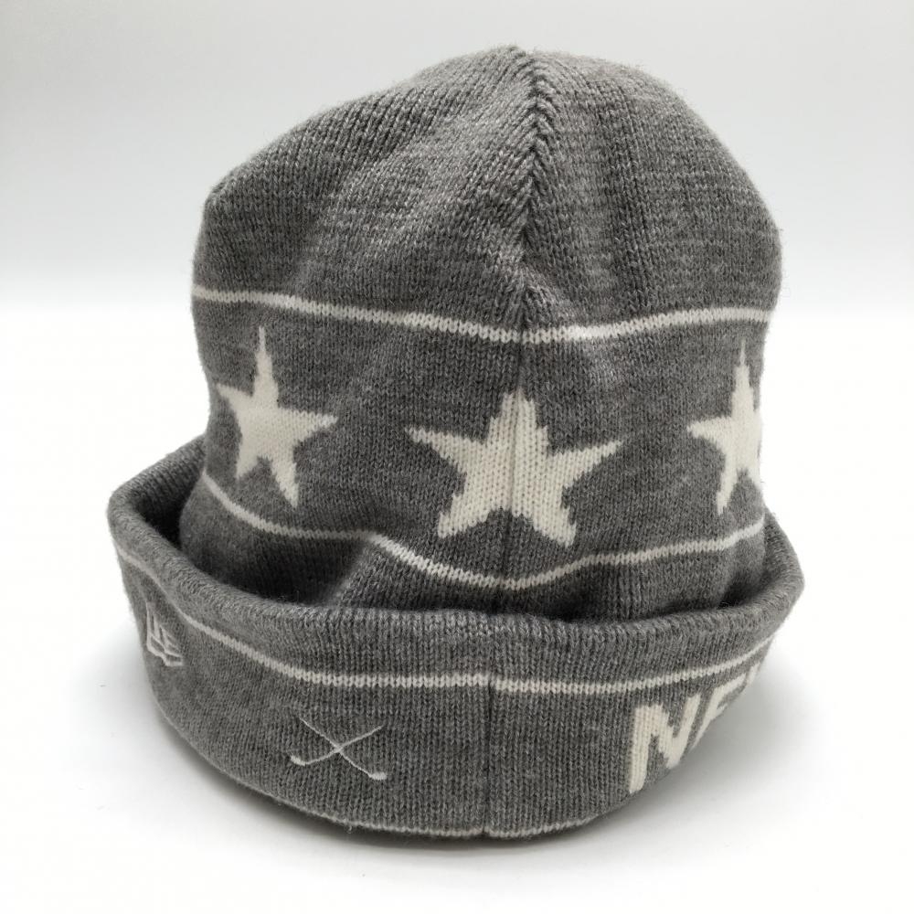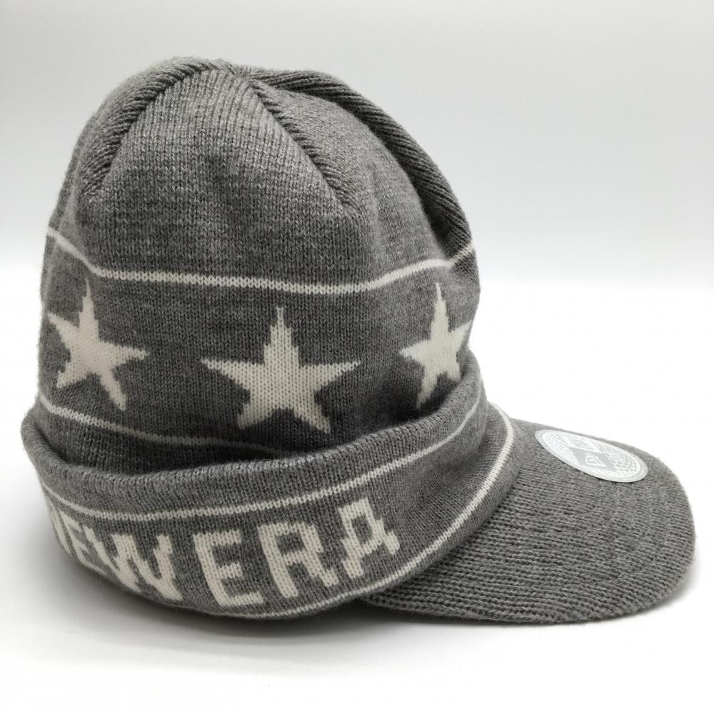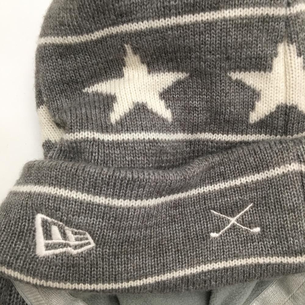 【美品】ニューエラ つば付ニット帽 グレー×白 一部星柄 裏フリース ウール混 ゴルフウェア New Era