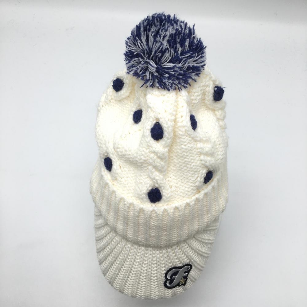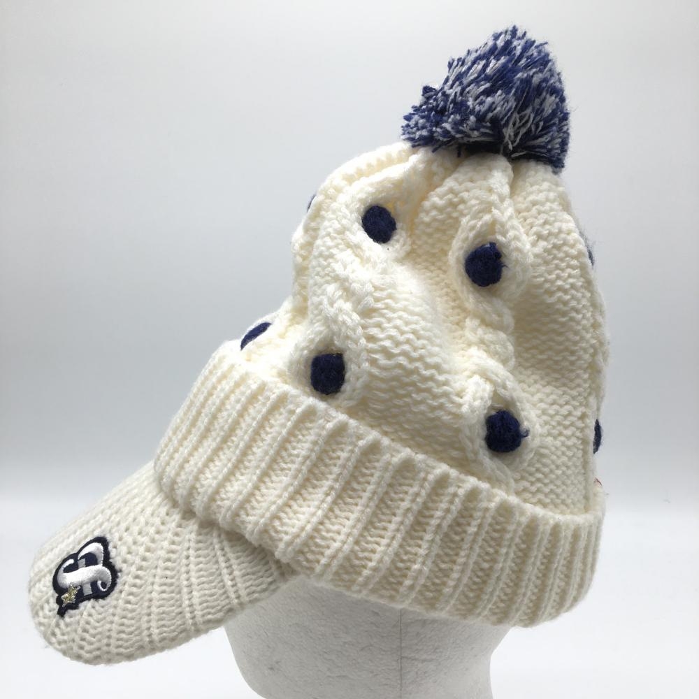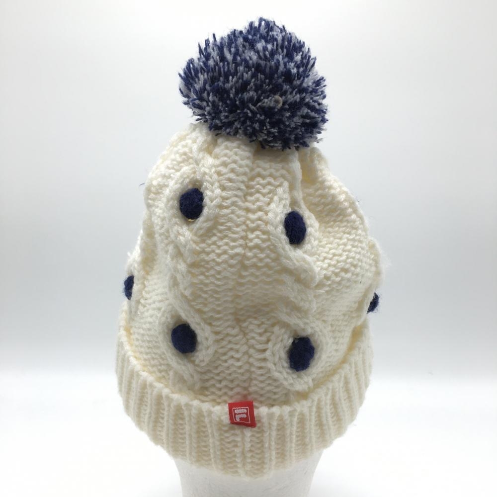【美品】フィラゴルフ つば付ニット帽 白×ネイビー 裏地フリース アクリル100% ボンボン付 レディース 表記なし ゴルフウェア FILA GOLF