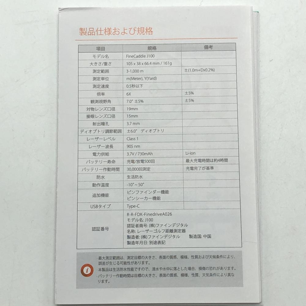 【美品】ファインキャディ レーザー距離計 黒 J100 通電確認済み 収納ケース・付属品・説明書付ゴルフ FINE CADDIE