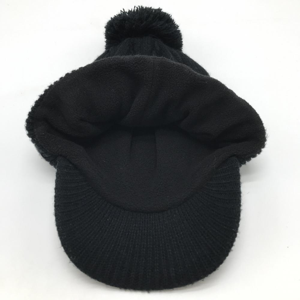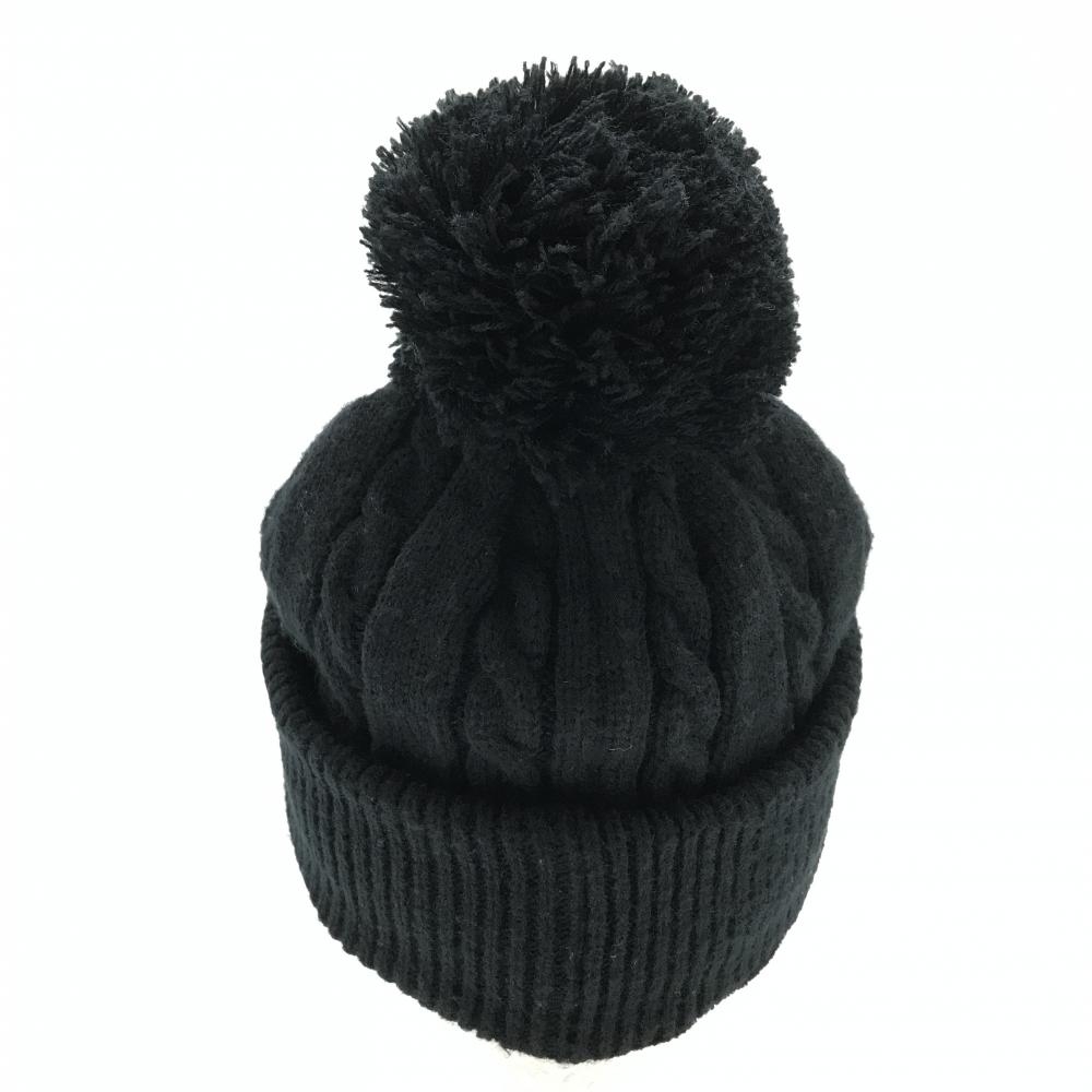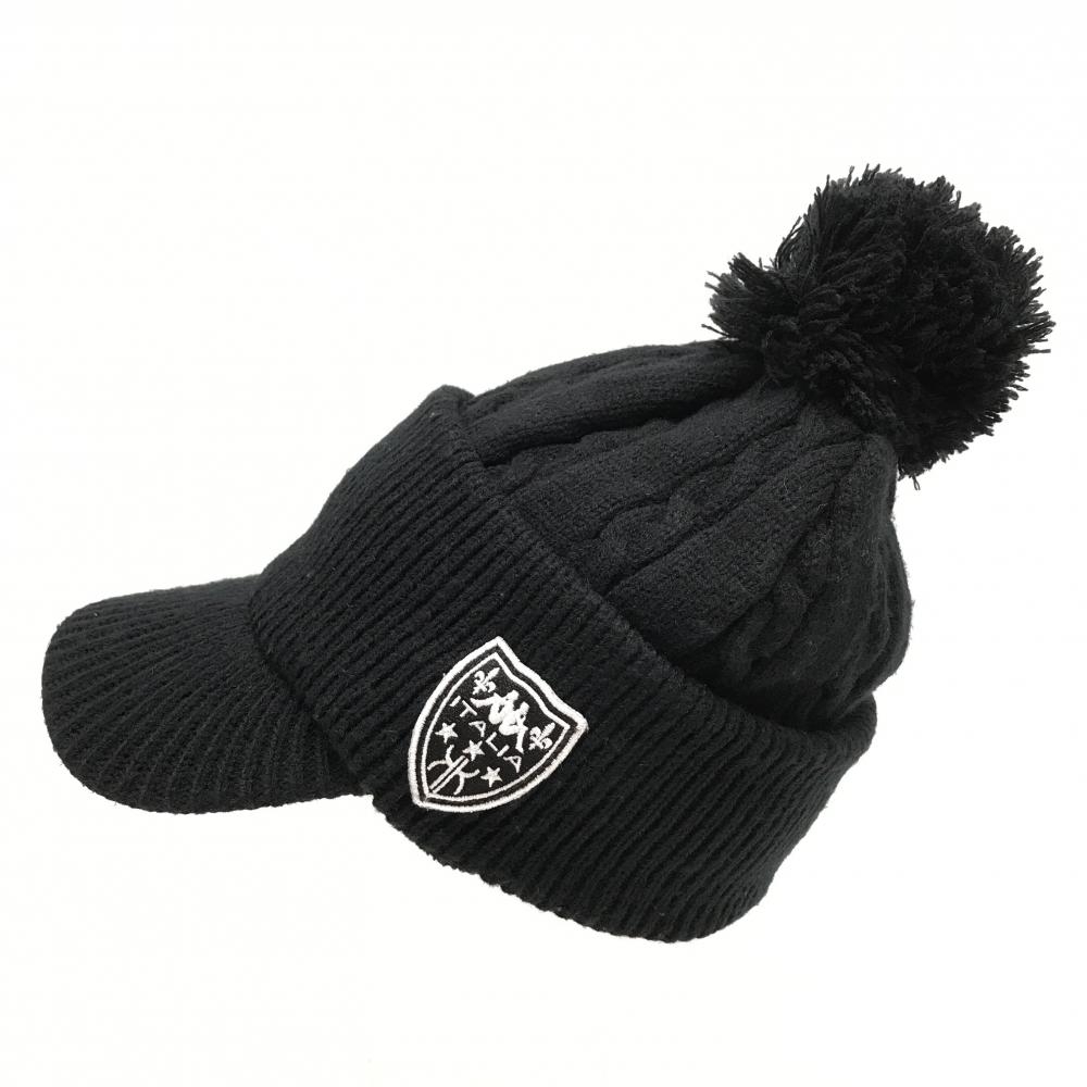 【美品】カッパ つば付ニット帽 黒 ケーブル編み ボンボン付 フリーサイズ ゴルフウェア Kappa