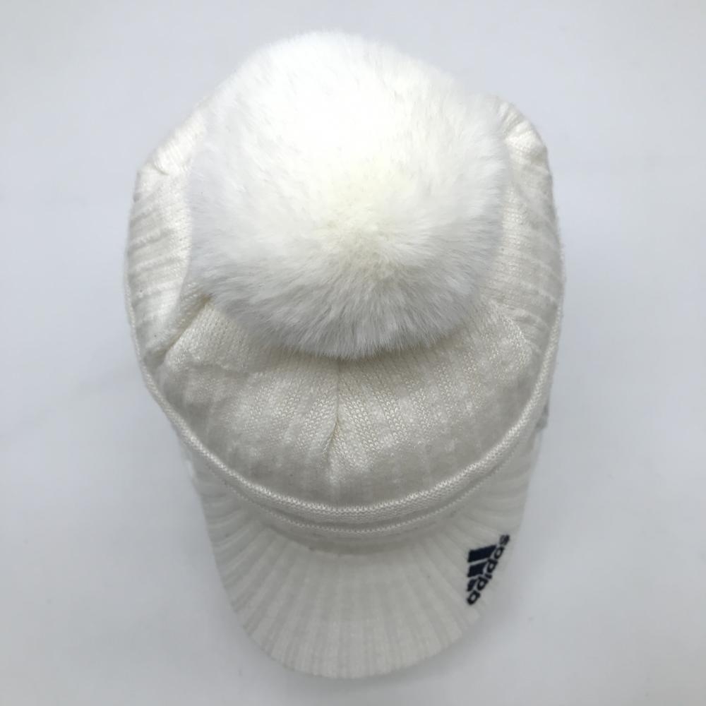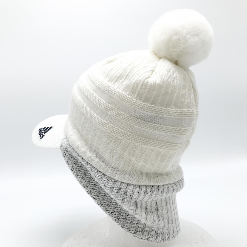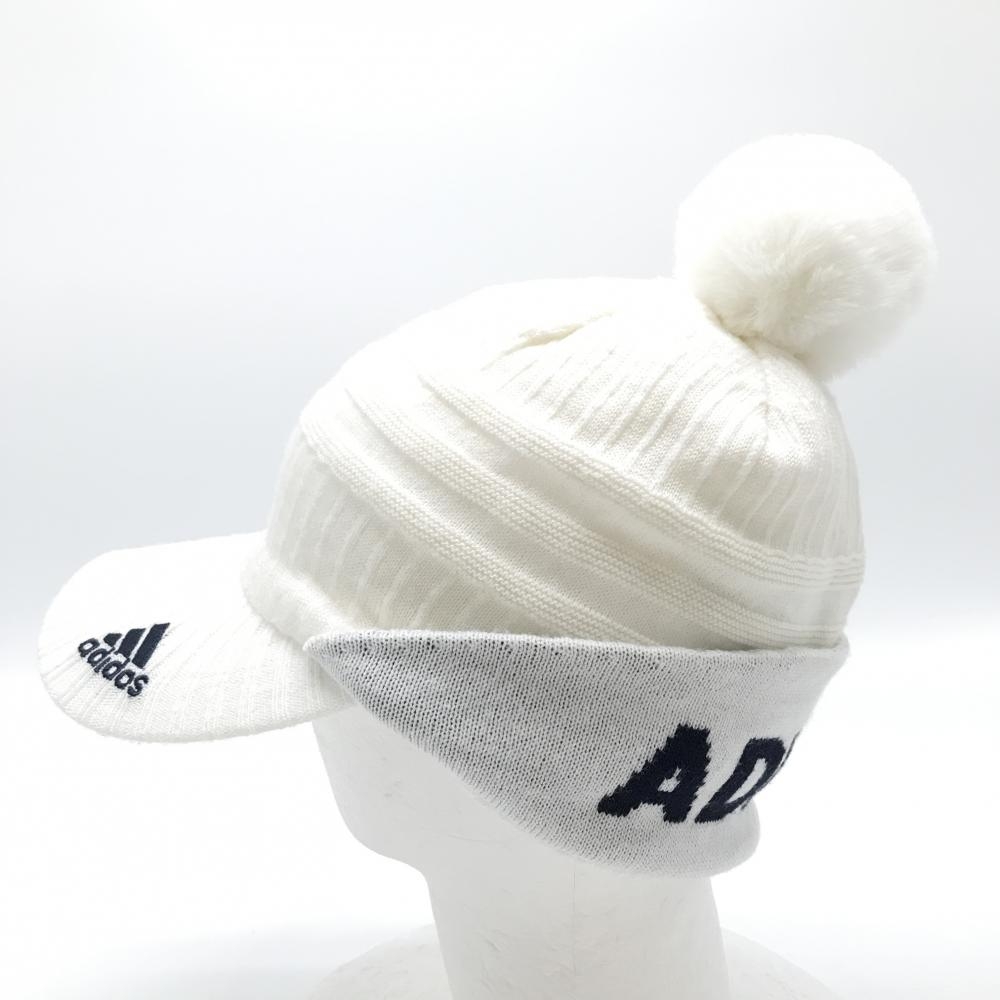 【美品】アディダス つば付きニット帽 白 織生地 ボンボン付 フリーサイズ ゴルフウェア adidas
