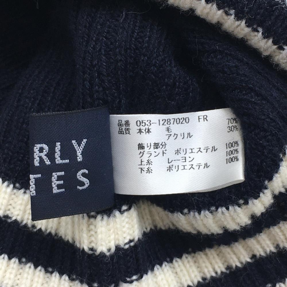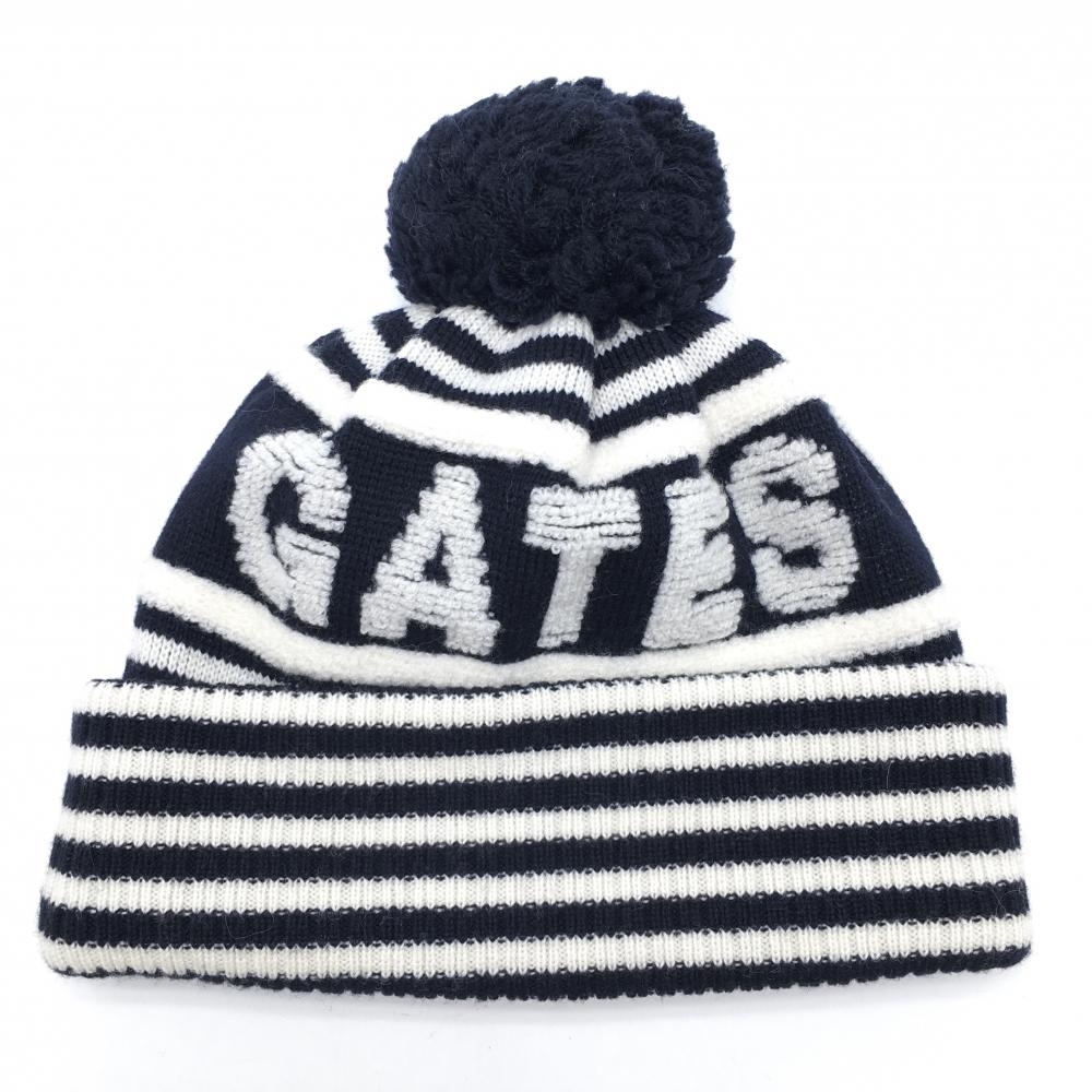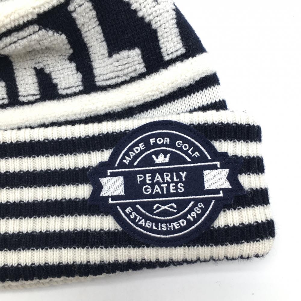 【超美品】パーリーゲイツ ニット帽 白×ネイビー ボーダー ロゴ ボンボン付 FR ゴルフウェア PEARLY GATES