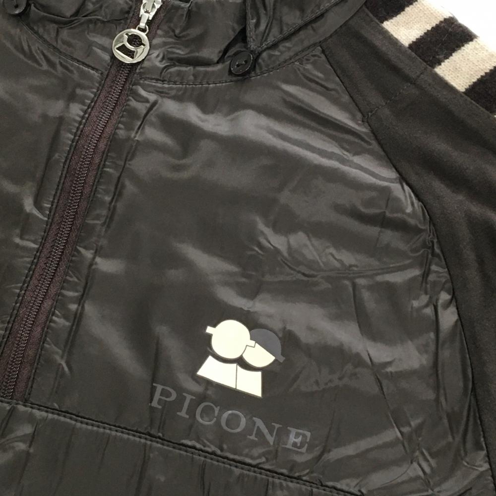 【美品】ピッコーネ 長袖ハイネックシャツ ブラウン 異素材切替 袖ニットボーダー フード着脱可 レディース 0(S) ゴルフウェア PICONE
